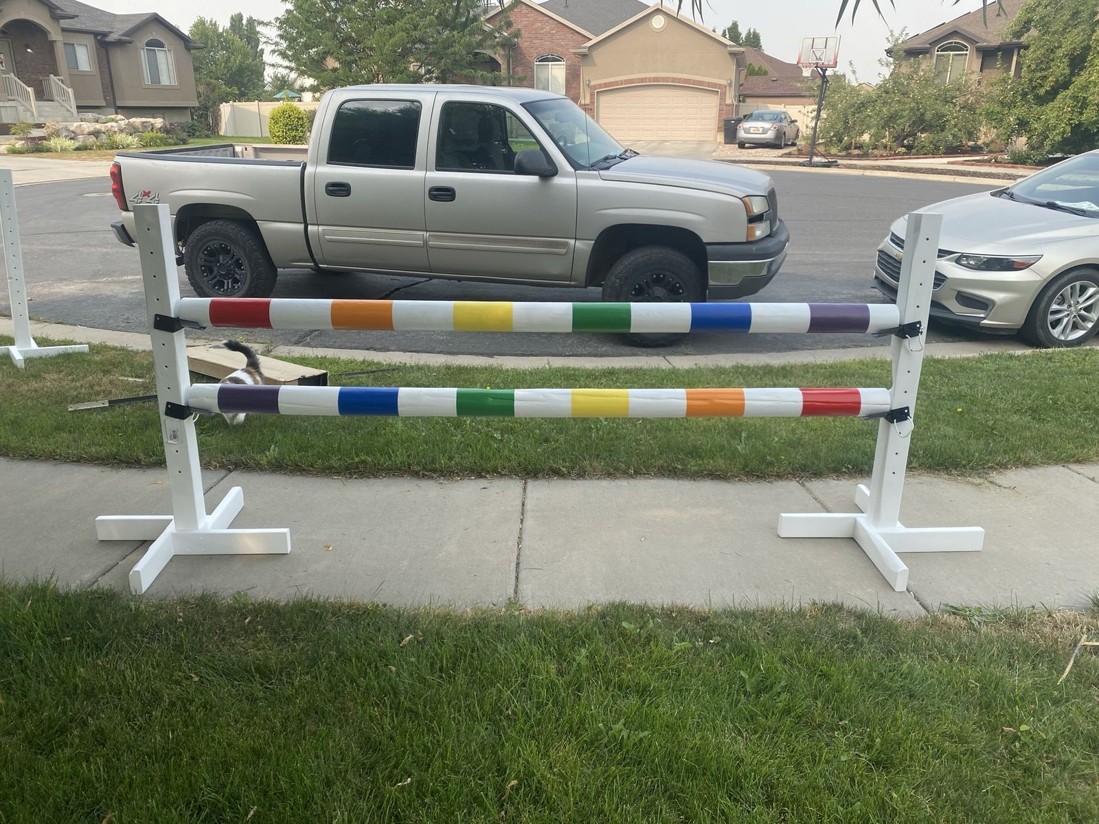 Base price for an 8’, one colored, two standard, single pole jump. Comes with two jump cups.
