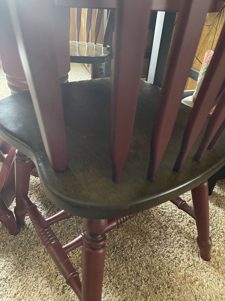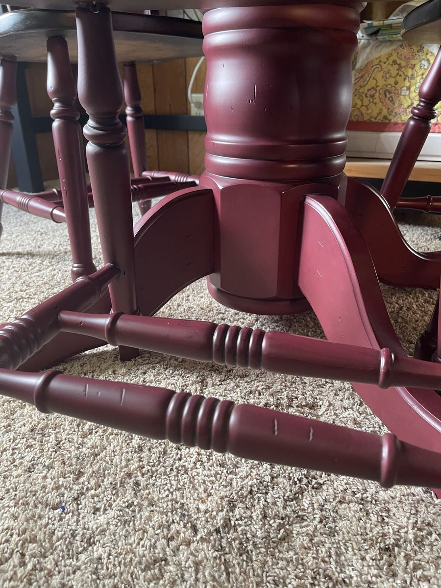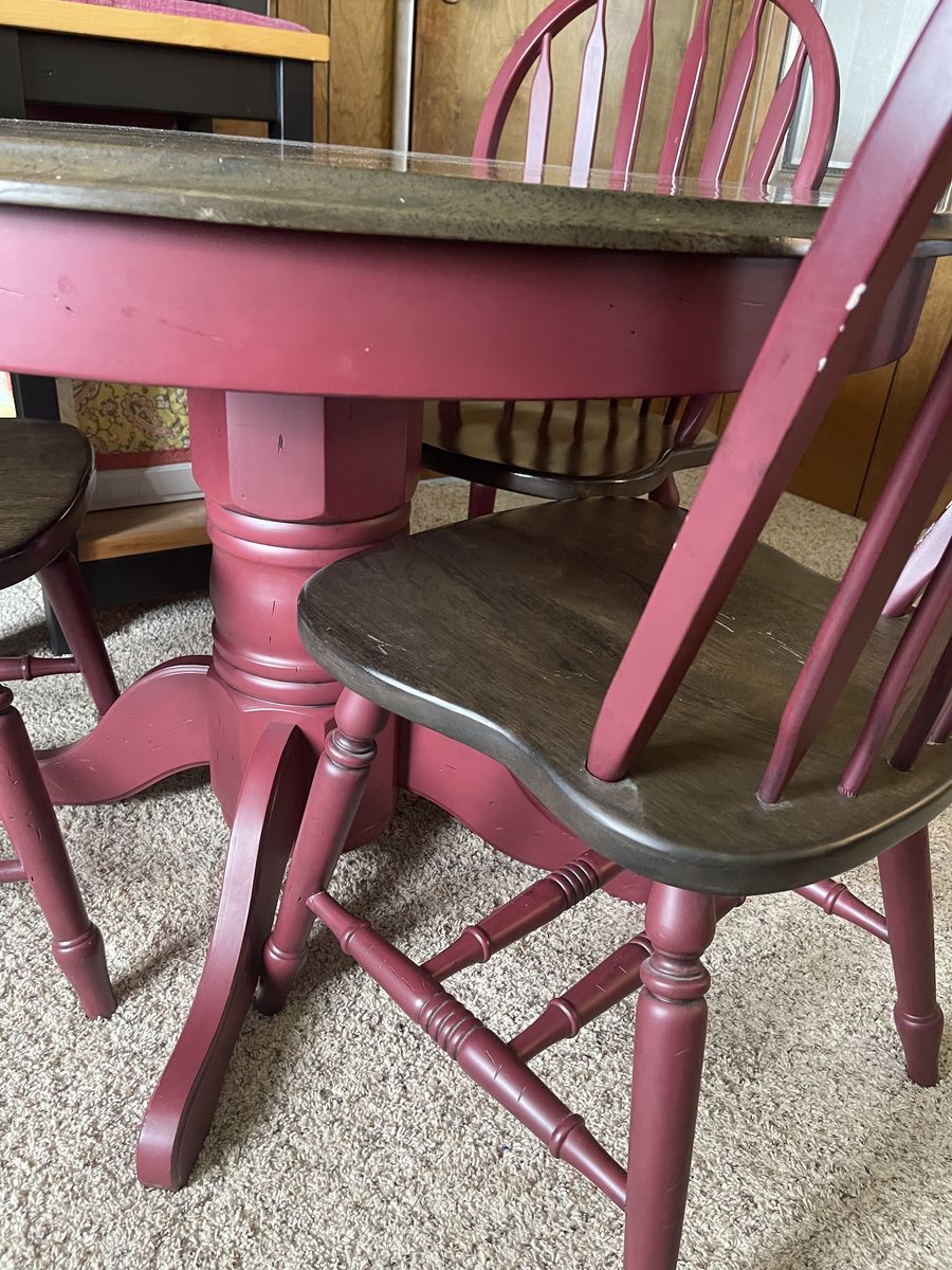 ApplePayThis table has been completely restored. It was sprayed with high quality red laquer finish with a black glaze over the top and given a rustic look with natural knots. The table top has also been refinished. It is build exceptionally well. It only came with three chairs when I bought it.