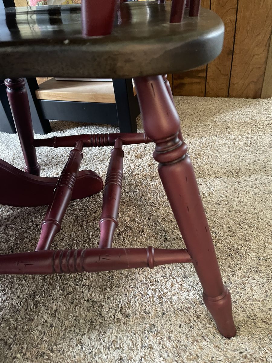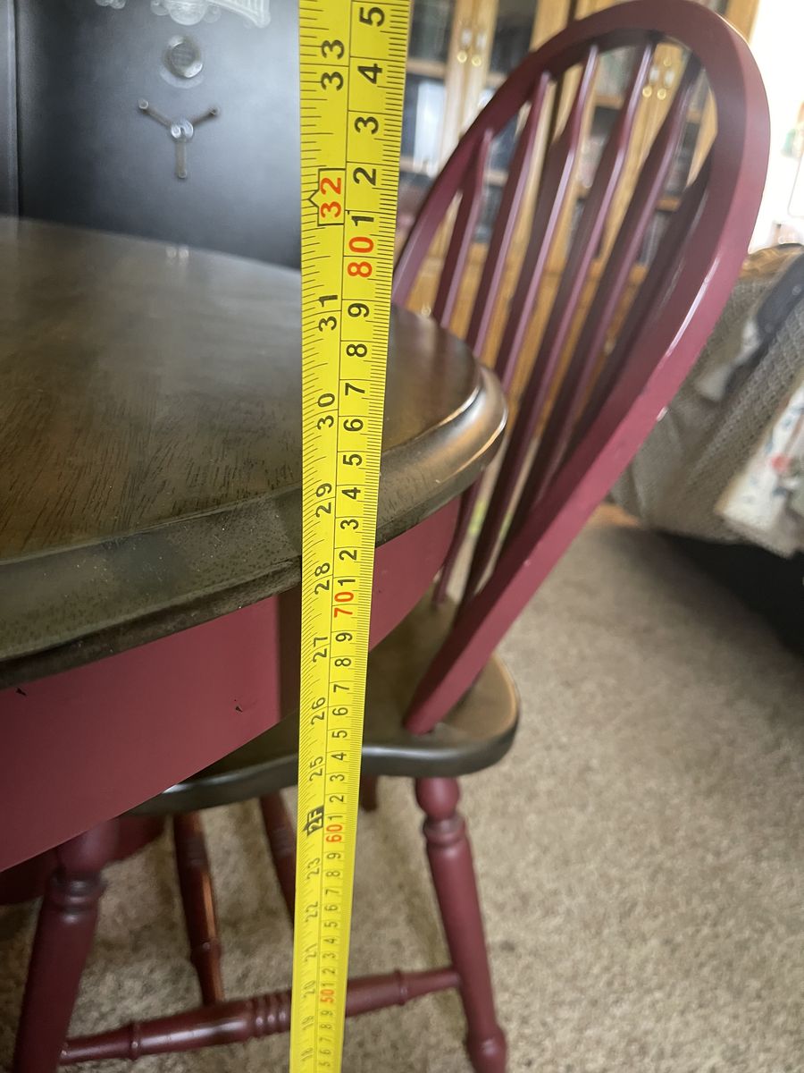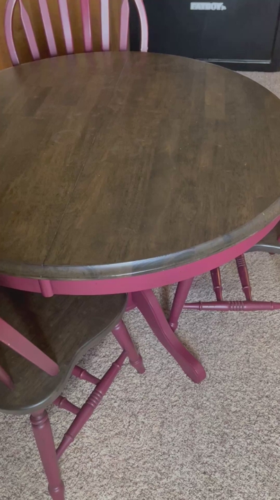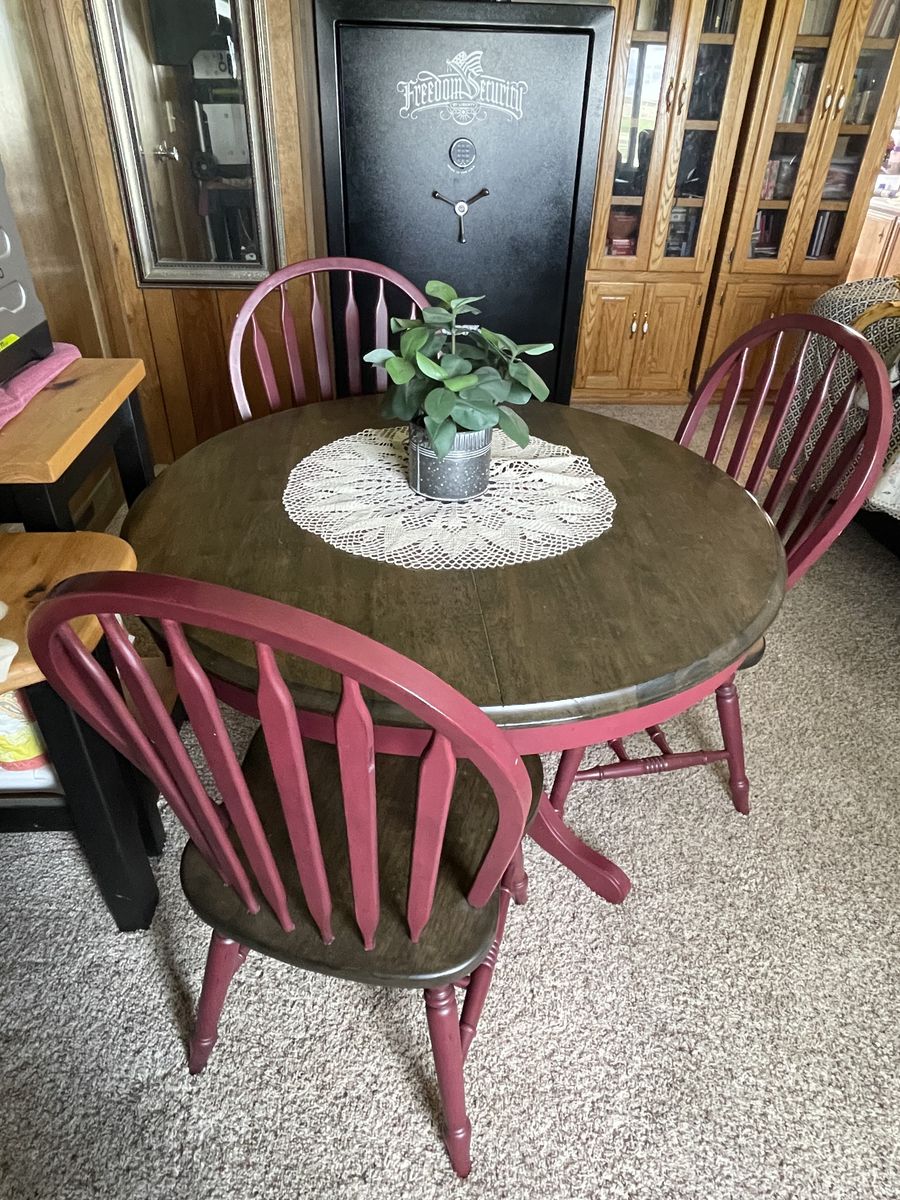 ApplePayThis table has been completely restored. It was sprayed with high quality red laquer finish with a black glaze over the top and given a rustic look with natural knots. The table top has also been refinished. It is build exceptionally well. It only came with three chairs when I bought it.