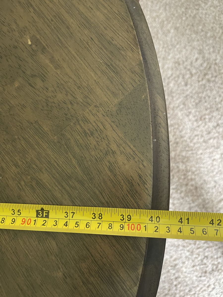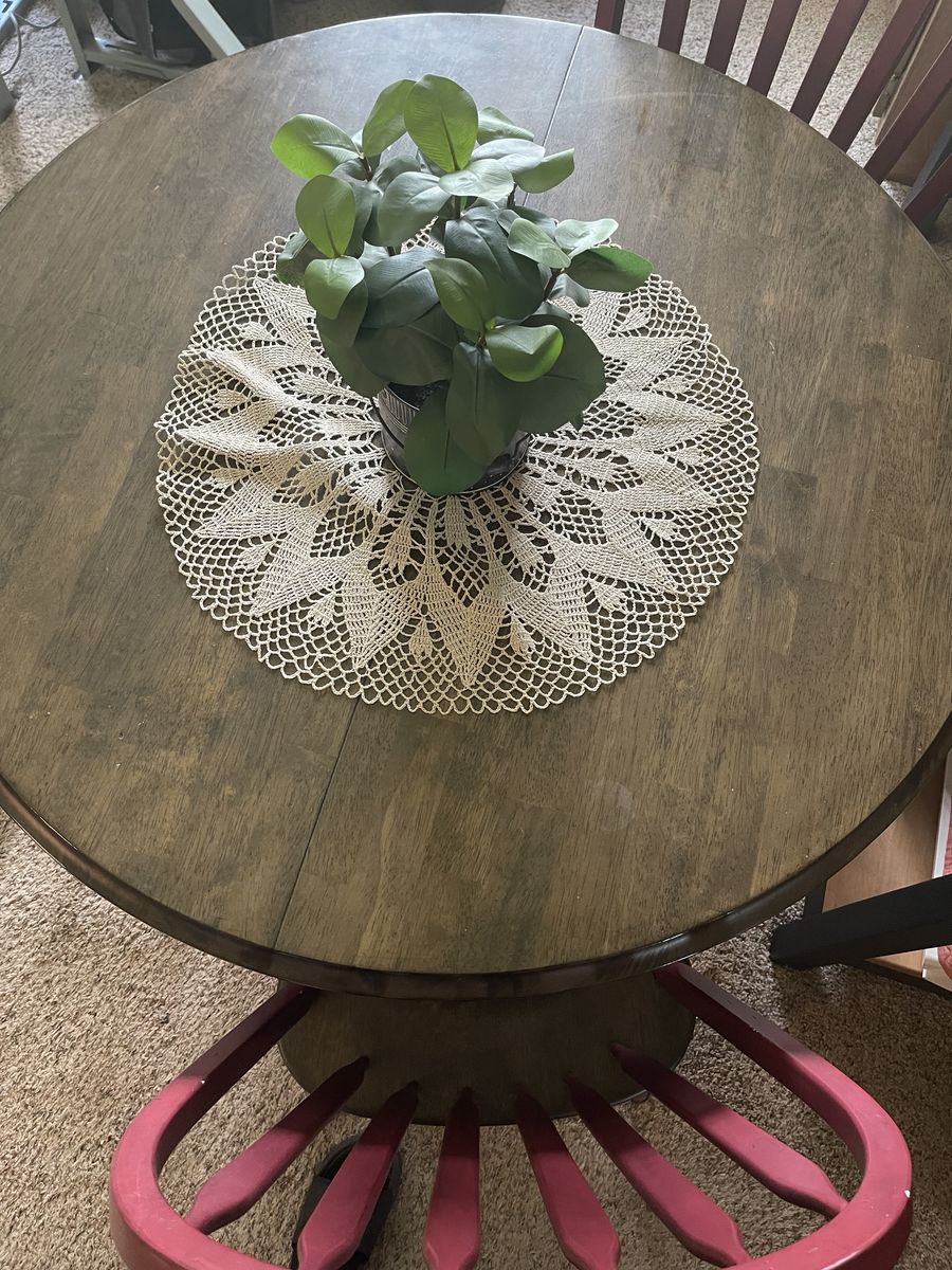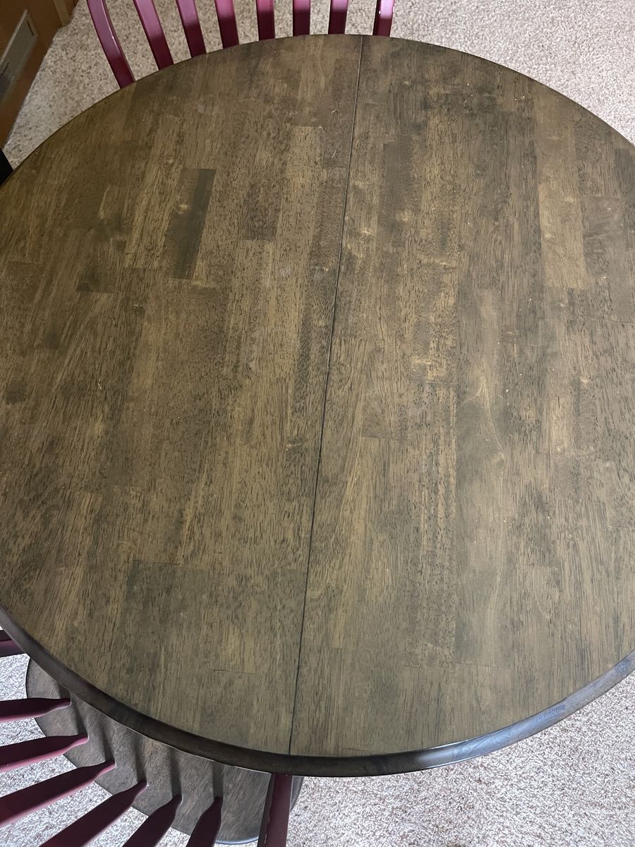 It has gorgeous wood working and is perfect for a kitchen table or gaming table. We never really used it, it was more of decor piece so it is in great condition the only wear on it is a few little paint chips on the chairs.