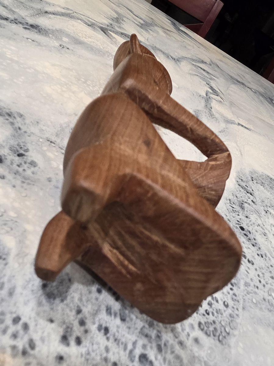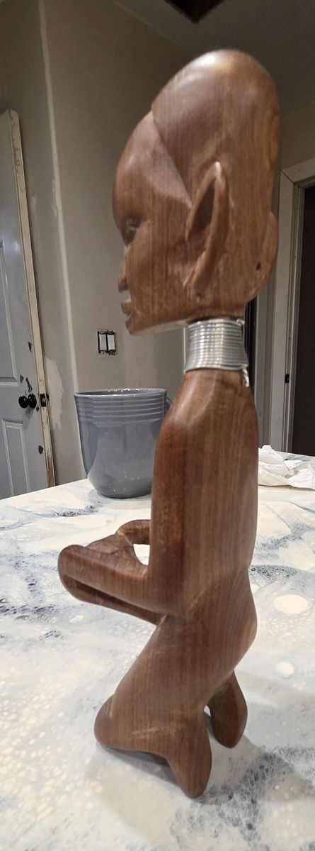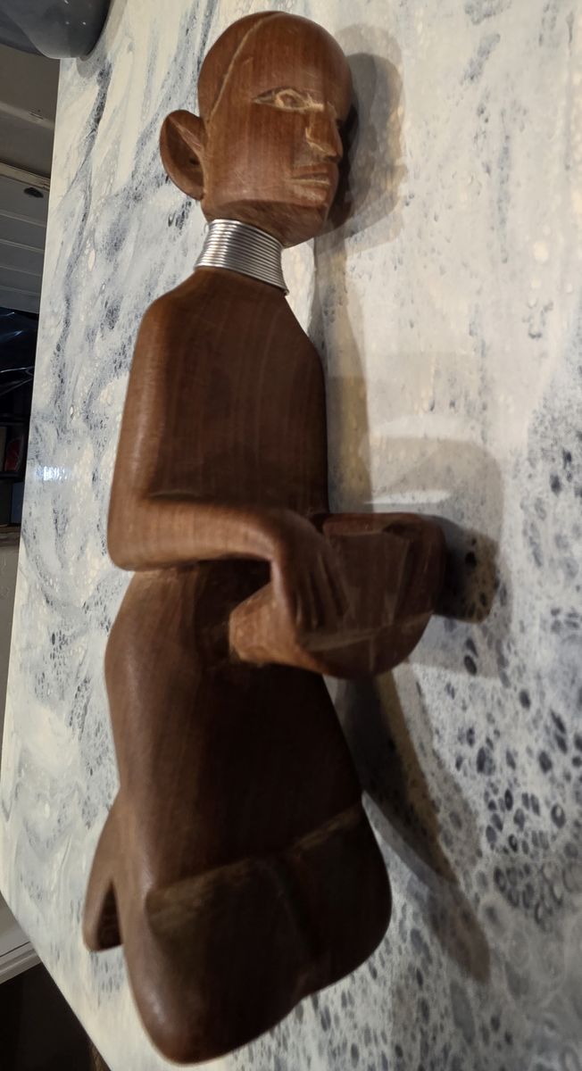 VenmoBeautifully detailed, vintage hand-carved wooden sculpture of a kneeling woman in a traditional "offering" pose. This piece features a striking elongated head and authentic silver-toned metal neck rings, characteristic of Ndebele or Kayan-style craftsmanship. The figure is carved from a solid piece of heavy tropical hardwood with a rich, natural grain and a smooth semi-gloss patina. She is holding a small integrated bowl, traditionally used for kola nuts, jewelry, or ceremonial offerings. Style: African Tribal / Mid-Century Folk Art / Boho Decor Material: Solid Hardwood & Metal Coil Condition: Excellent vintage condition. No cracks, chips, or repairs. The wood has a lovely aged glow. Dimensions: 8".
