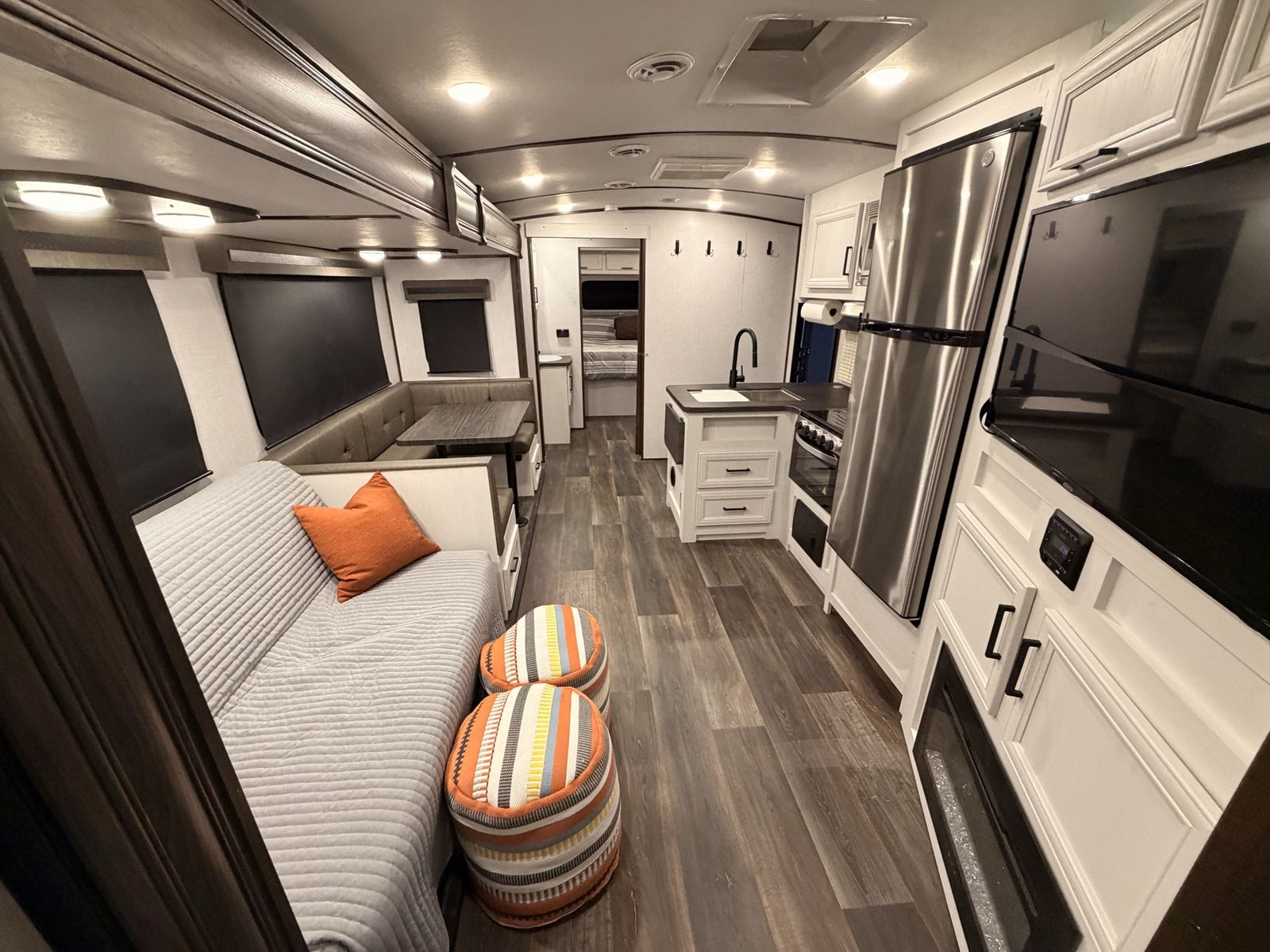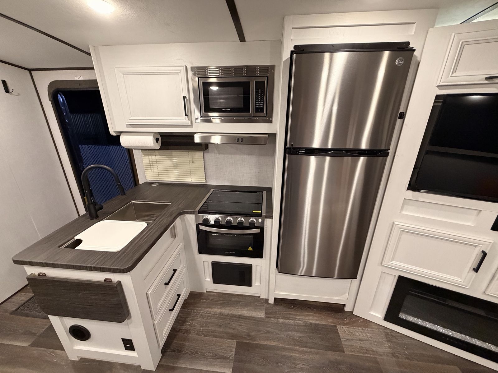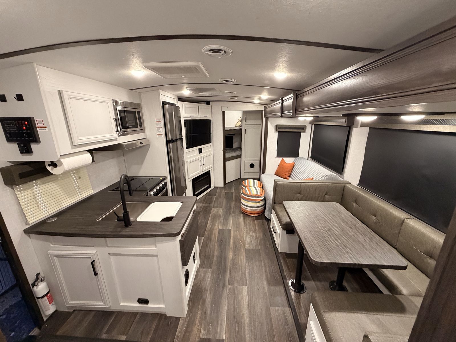 -entertainment center rolls out into pantry -outdoor kitchen -power awning -max air vent covers -wrap around dinette -large shower/bathroom -two tvs -equalizer hitch included\