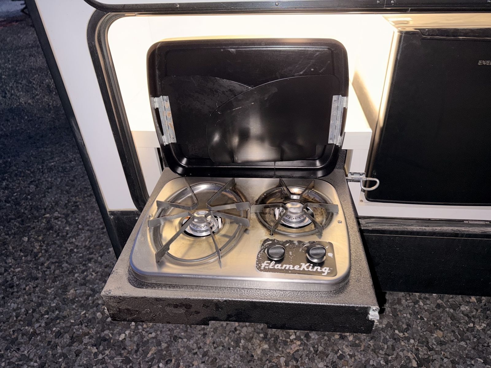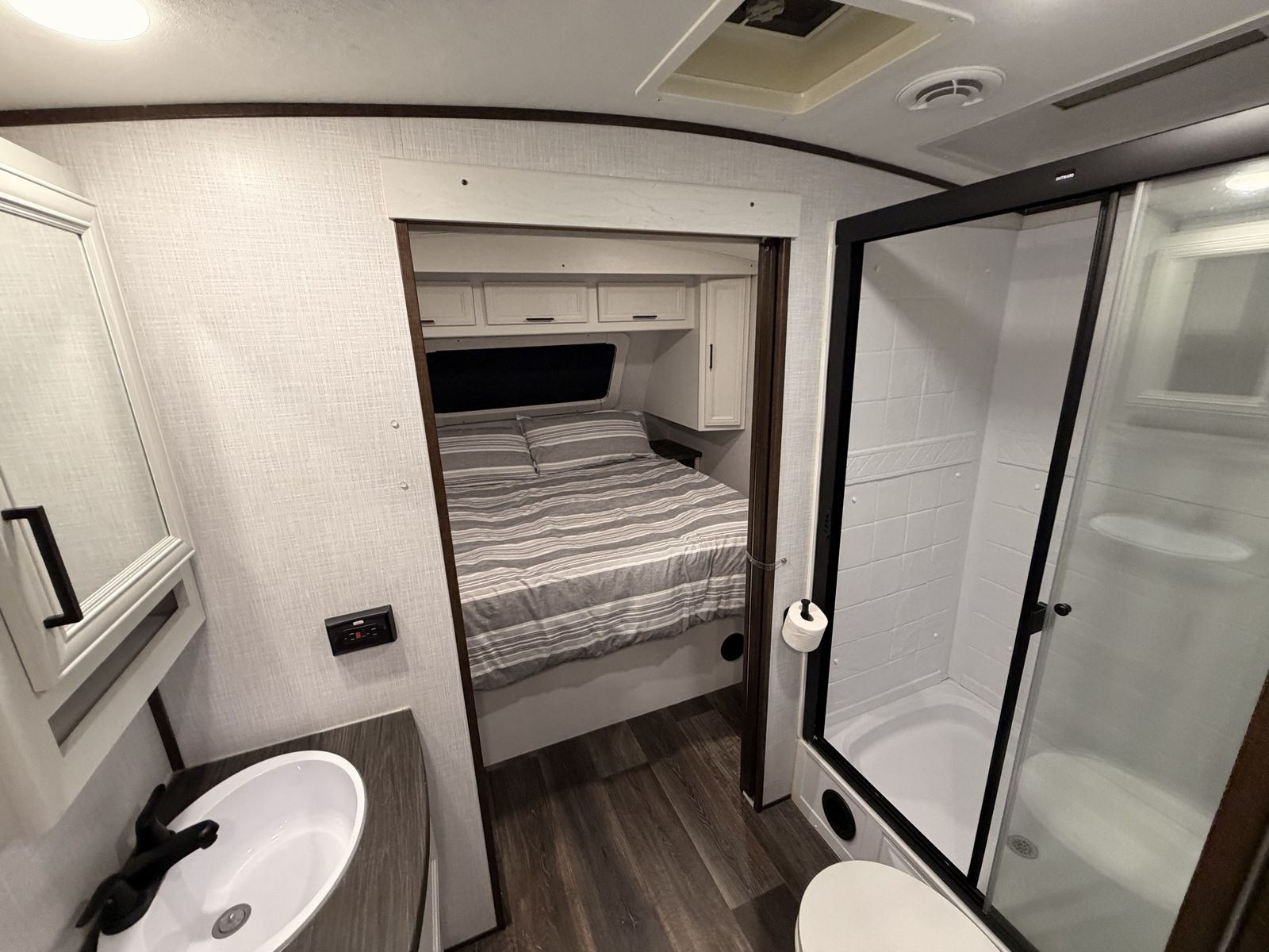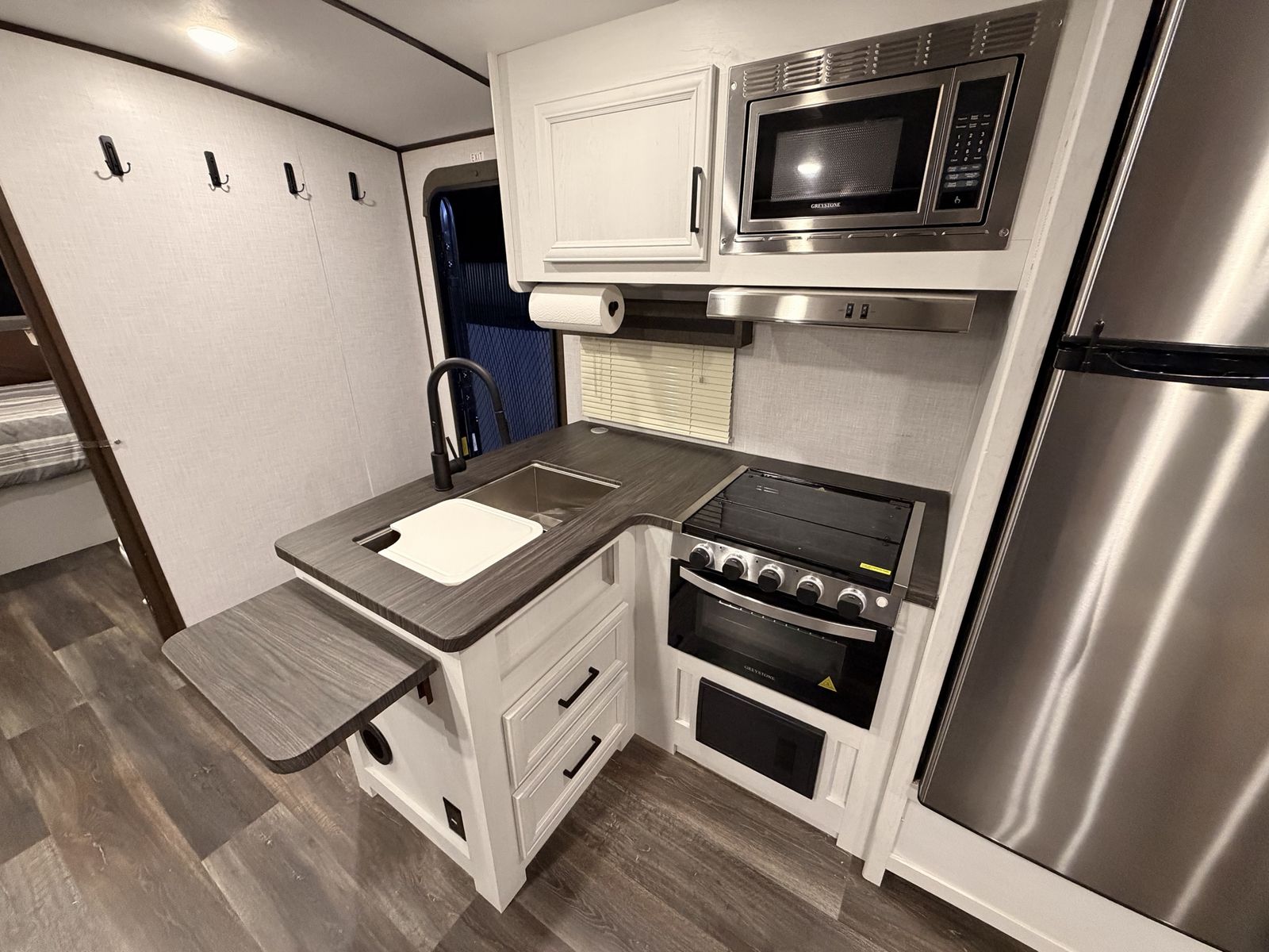 -entertainment center rolls out into pantry -outdoor kitchen -power awning -max air vent covers -wrap around dinette -large shower/bathroom -two tvs -equalizer hitch included\