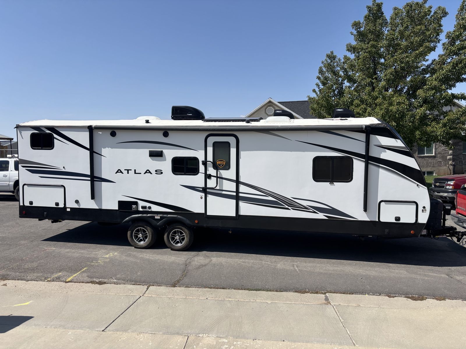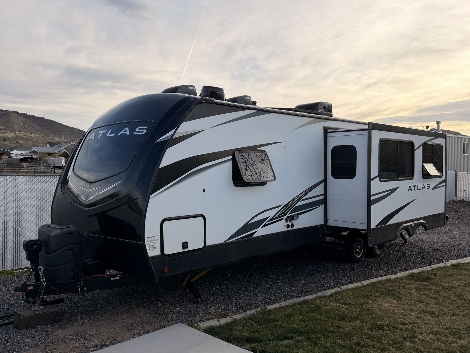 2022 Dutchmen Atlas 2902BH. This is an amazing trailer and we have loved every minute of it. This has only been slept in close to 10 times. -32-33 feet -6,800 lbs dry -two solar panels on top, keeps batteries charged up -Bluetooth charge controller to monitor battery level\