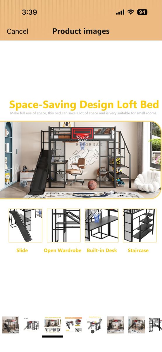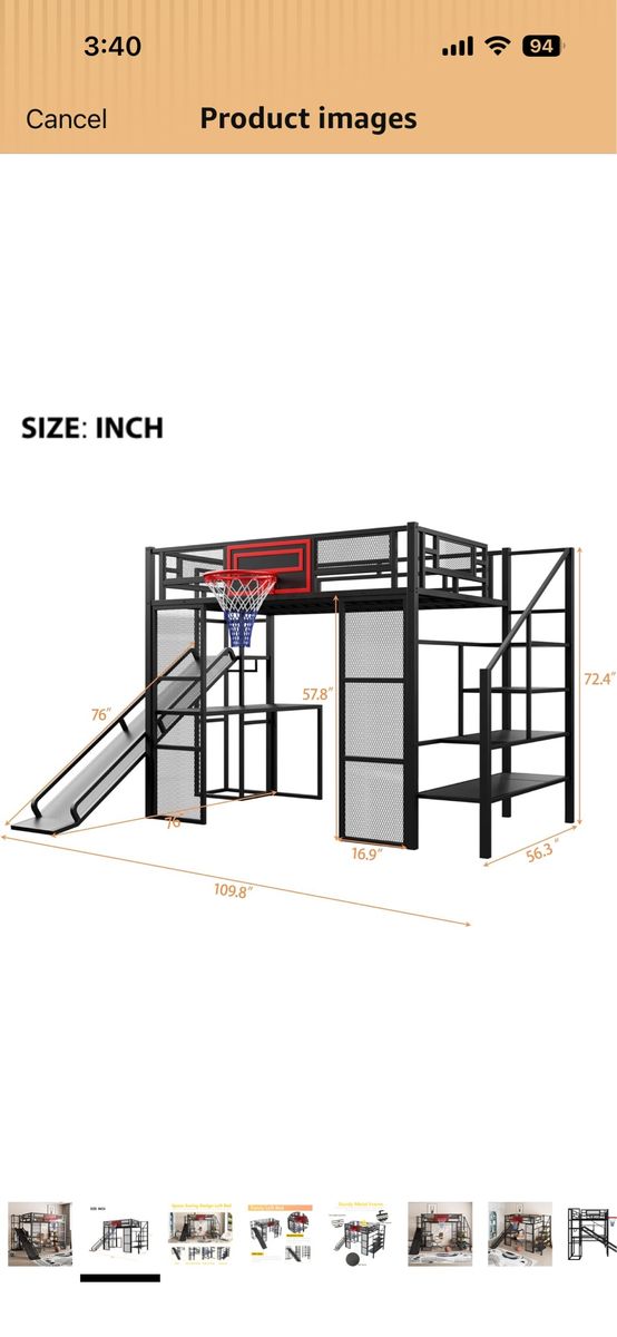 Sturdy Metal Frame:Strong metal frame that includes an integrated ladder, full-length guardrails and secured metal slats to ensure security and stability. Space-saving Design:There is a desk and wardrobe under the bed, and storage racks on the stairs for you to study or place daily necessities. Make full use of space, this bed can save a lot of space and is very suitable for small rooms. Basketball Hoop:This bed comes with a basketball hoop and basketball net, bringing more joy to your children indoors. Modern Style:Crafted of metal and MDF in a clean painted finish, this bed strikes a clean-lined silhouette with a horizontal slatted headboard and footboard, matching guard rail. With Slide:This bunk bed comes with a solid slide which can offer you extra fun with you family members in you free time.