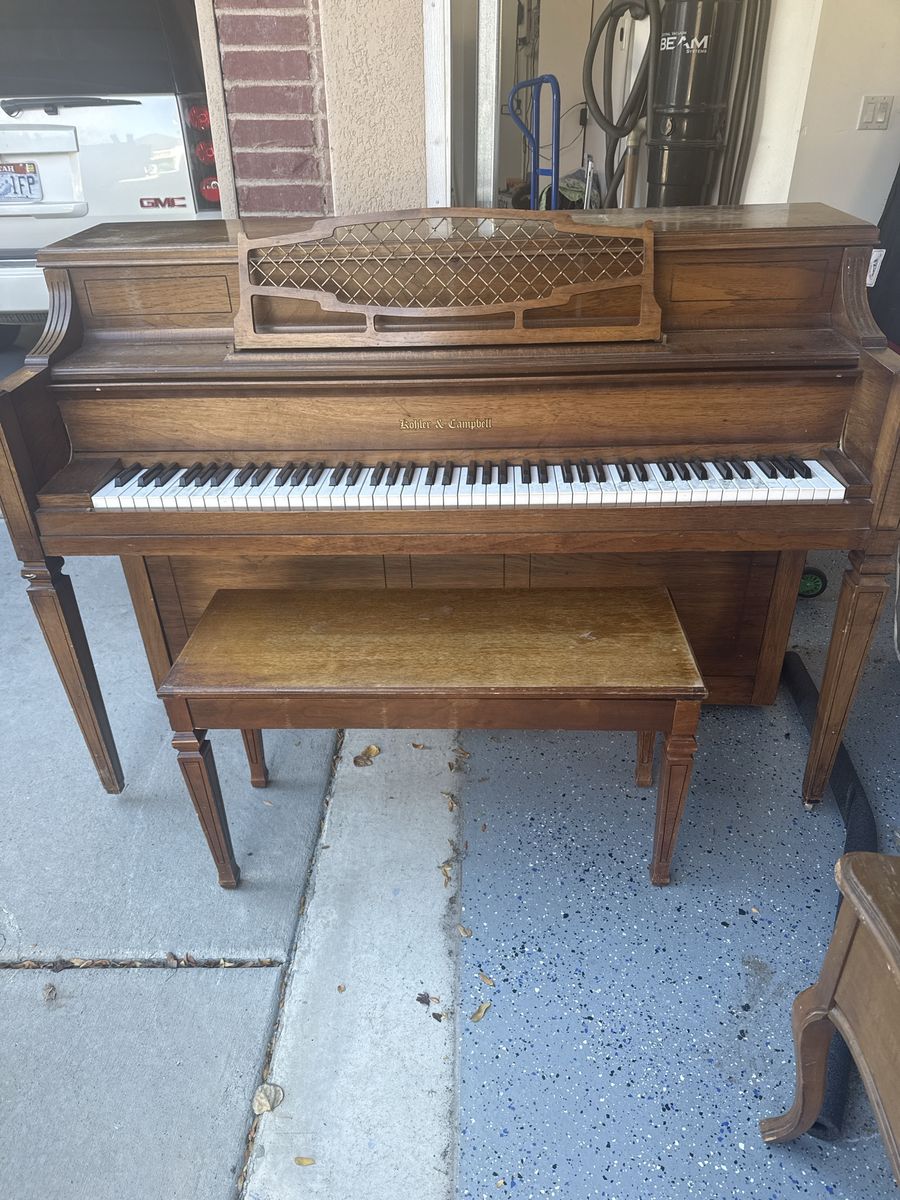 This piano has been passed down through the family. We upgraded to a new one in a recent move and no longer need this one. Unfortunately when I listed this for free originally someone came to get it and ended up breaking a piece of the leg when trying to move it. It still plays and all the keys function, but now the leg needs a repair.