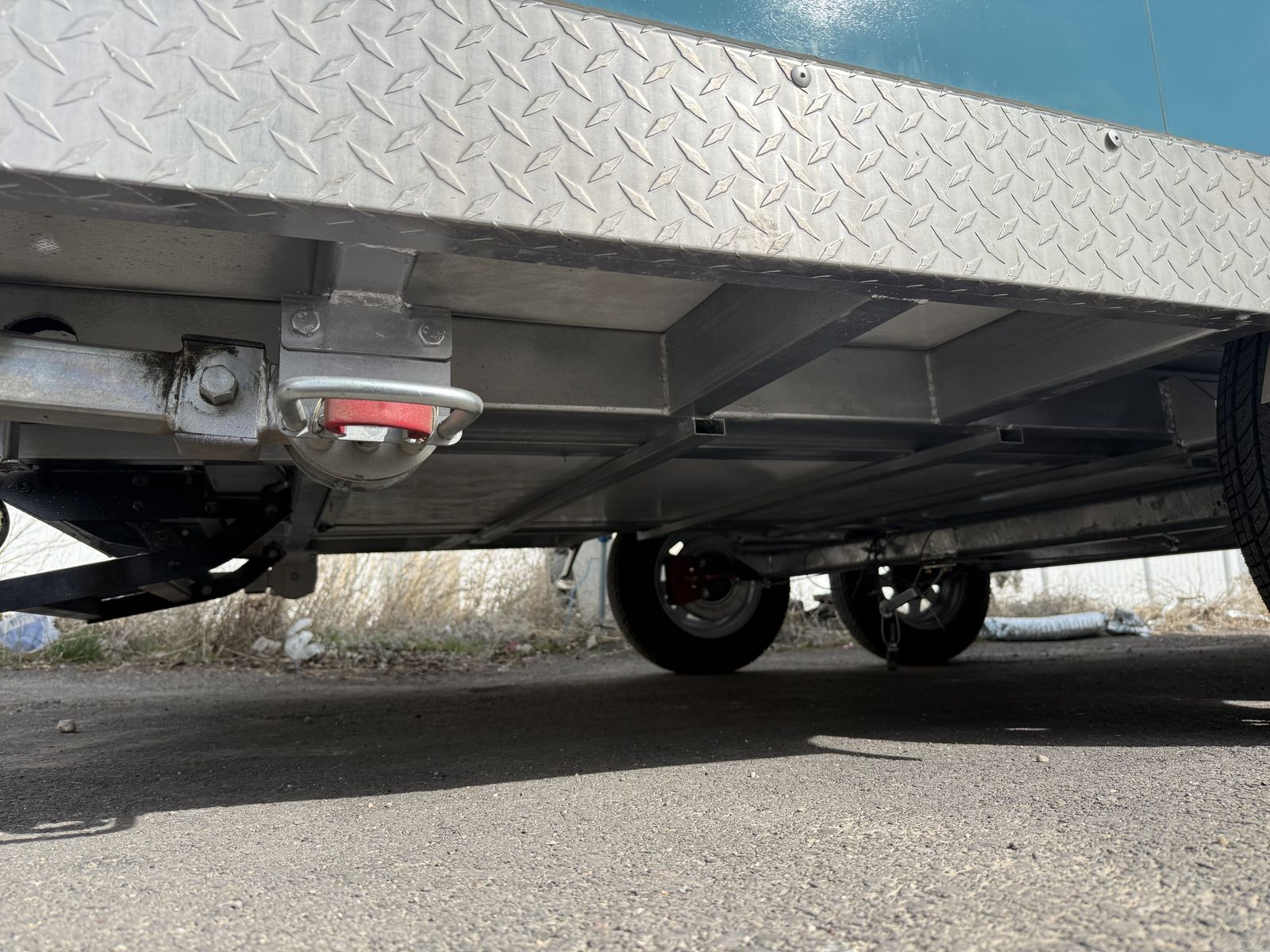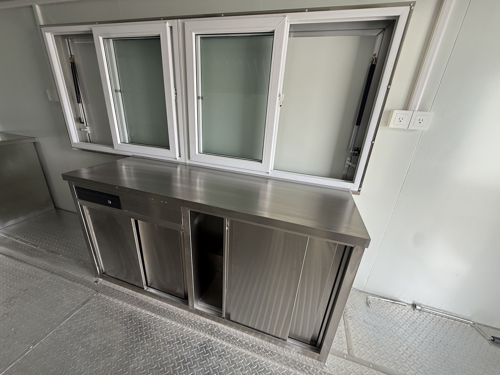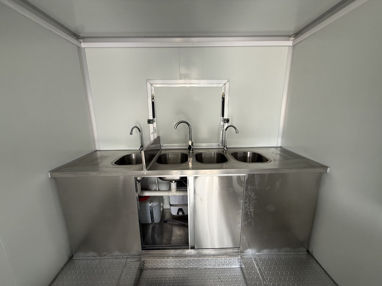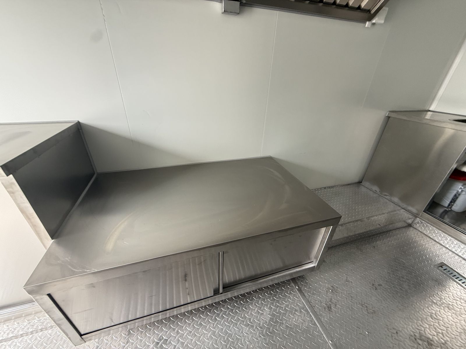 • Kitchen Setup: Stainless steel counters, walls, and diamond-plate flooring for durability and easy cleaning. Includes a 3-compartment sink with hot/cold water, handwashing station and ample cabinet storage.