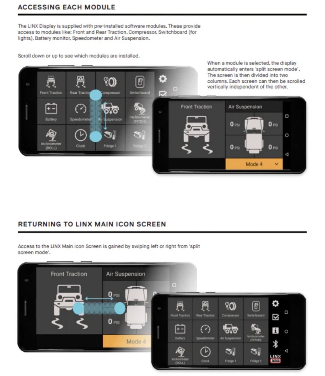 Description (listing-ready): The ARB LINX LX100 is an all-in-one touchscreen controller that replaces a cluttered dashboard full of switches and gauges. Instead of managing multiple controls for lights, compressors, air lockers, and battery systems, everything is centralized into one sleek, easy-to-use interface. Why it’s convenient: Controls multiple accessories from a single screen Cleans up wiring and eliminates switch clutter Bluetooth-enabled with a modern touchscreen display Expandable system that grows with your build Includes modules for traction control, compressor, battery monitoring, and more Perfect for overlanders or off-road builds looking for a clean, high-tech control system. ARB LINX Air Suspension Isolation Kit (7450109) Description (listing-ready): The ARB 7450109 Air Suspension Isolation Kit allows independent control of each airbag in your suspension system, giving you precise leveling and ride adjustment. Why it’s convenient: Adjust left/right airbag pressure independently Easily level your vehicle when carrying uneven loads Improves stability and ride quality Fully integrates with the LINX system for on-screen control Ideal for trucks with airbag suspension setups, especially when towing or hauling. ARB LINX Air Pressure Control Kit (7450107) Description (listing-ready): The ARB 7450107 Pressure Control Kit provides automated and remote control over your air system, including tire inflation and airbag pressure. Why it’s convenient: “Set-and-forget” pressure control for tires or airbags Makes airing up/down fast and effortless Integrates with onboard compressors and the LINX system Great for off-road adjustments without leaving the cab A huge time-saver for anyone frequently adjusting tire pressure on trails.