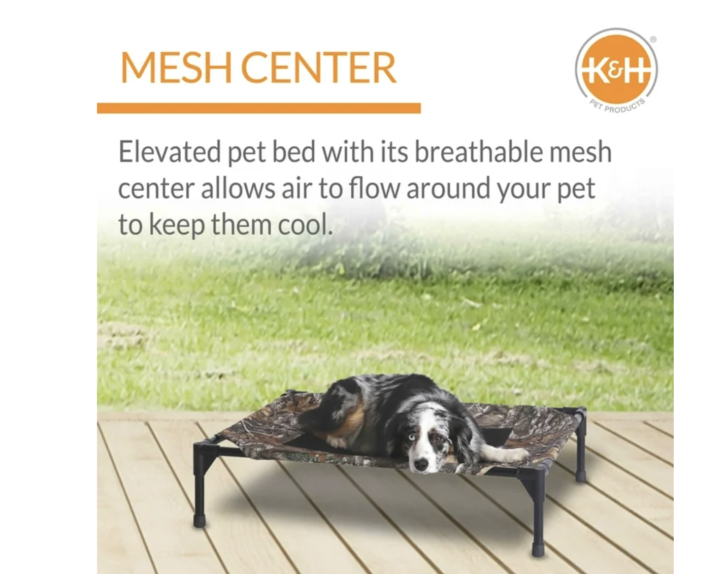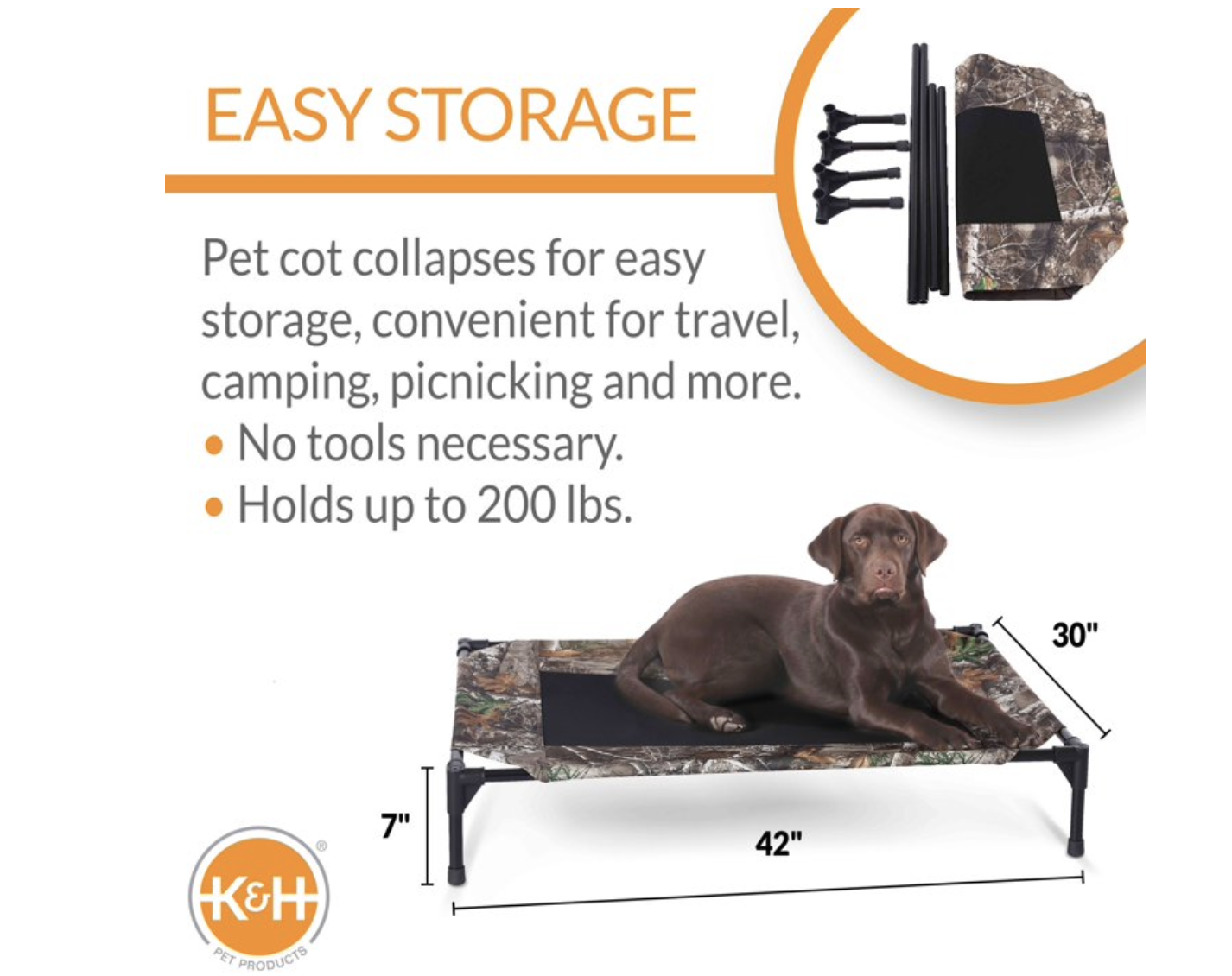 The K&H Pet Products Pet Cot raised dog bed keeps your dog elevated and off the ground allowing air to flow around your pet to keep them cool. The easy to assemble elevated pet bed requires no tools! Can be disassembled and taken anywhere. Our raised dog bed is great for camping, hiking, picnics, or anywhere at home inside or out. Made with water-resistant, heavy denier fabric and a breathable mesh center that repels moisture. The cover is removable and washable or can be hosed off outdoors. Slip-resistant rubber feet help protect floor surfaces. The K&H Pet Cot is durable and can hold up to 200 pounds;