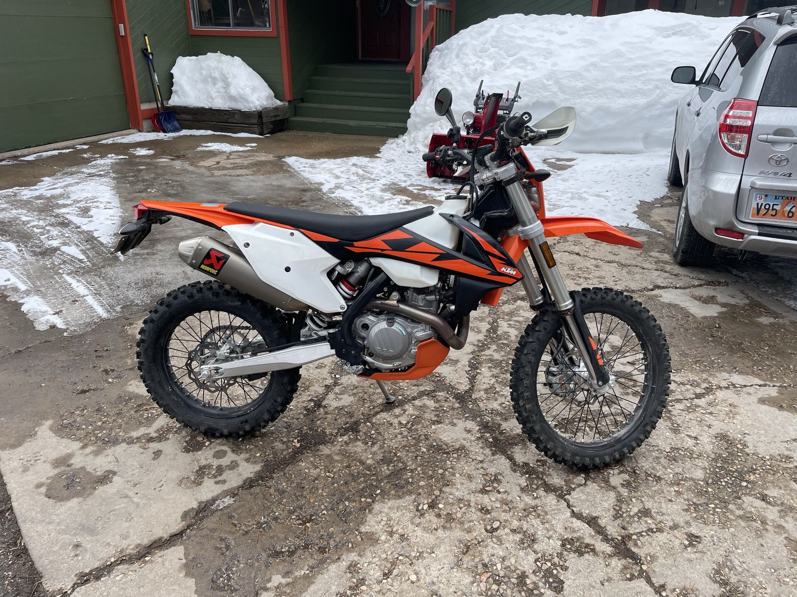 2018 KTM 500. 2534 miles. Tons of extras including a Mosko moto reckless 10 bag and all the stock stuff I replaced. Moose bibs Concept seat Steering stabilizer Bush wackers Desert tank Rekluse clutch (installed in Feb) Mirrors Heavier spring Taco moto front lights