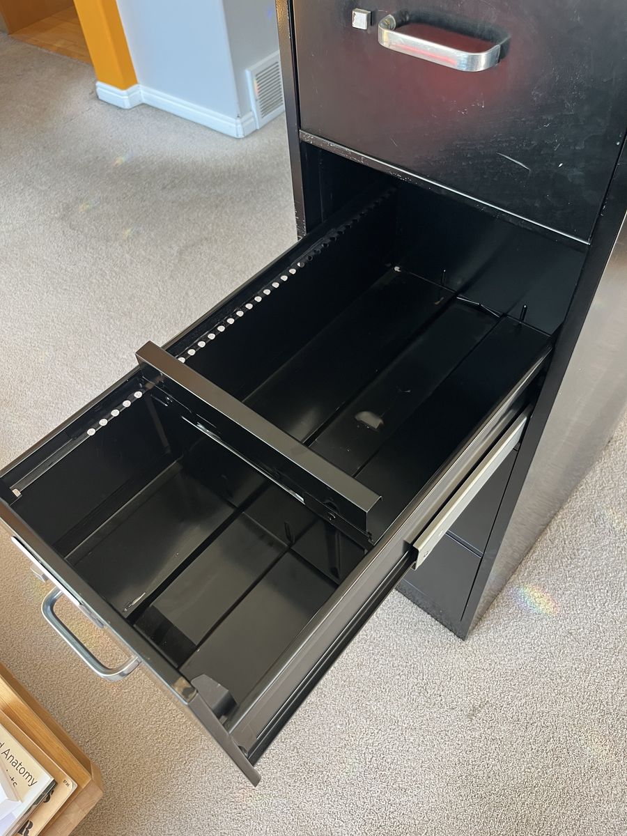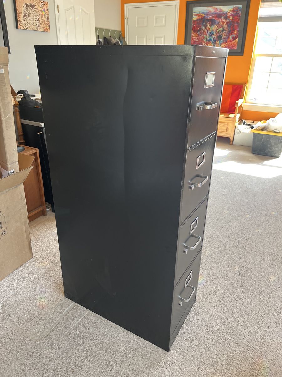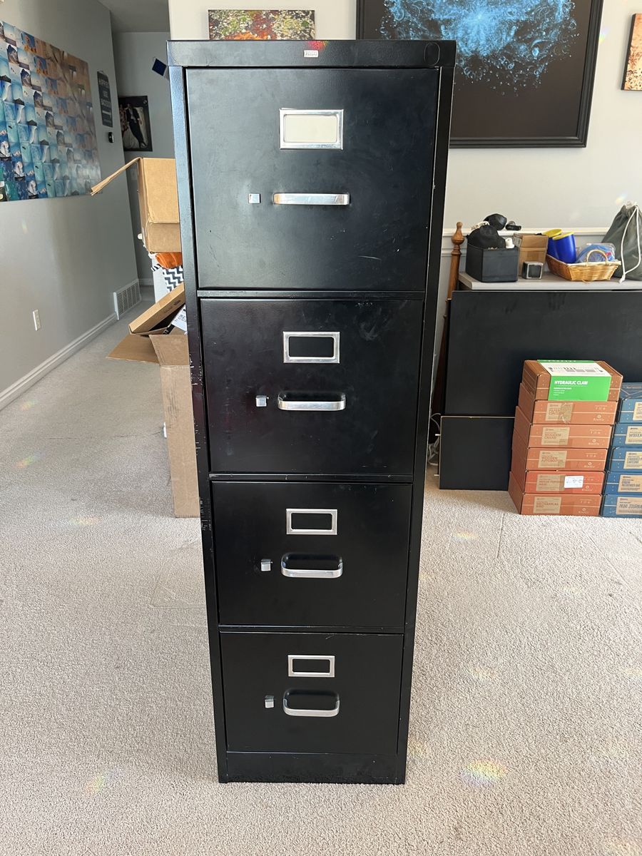 4 drawer heavy duty metal file cabinet, with adjustable depth stops and one rack with folders. Drawers come out easy for lighter transport. HON brand made in Iowa.