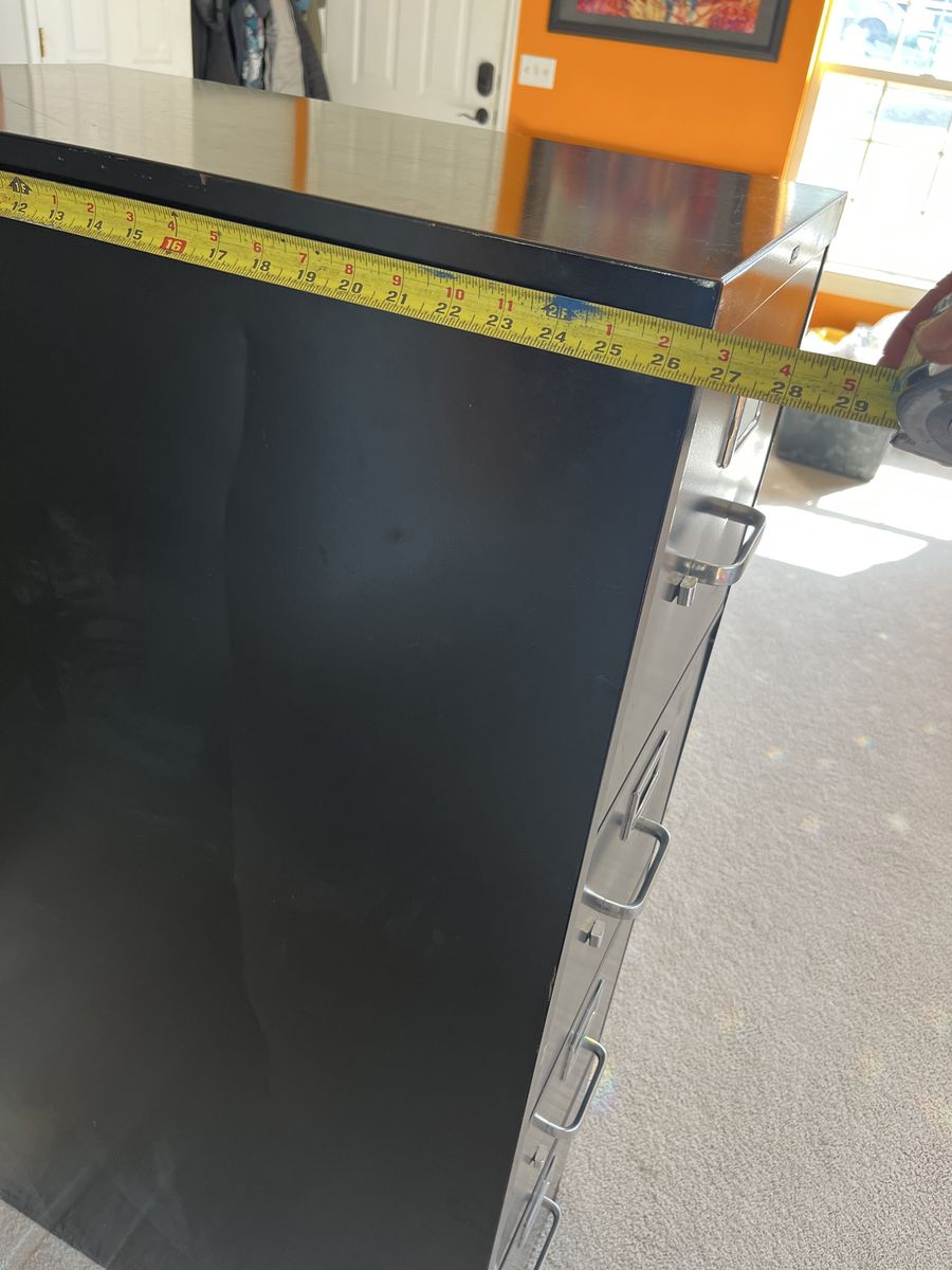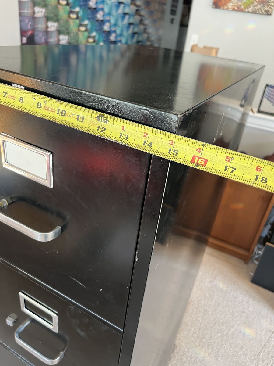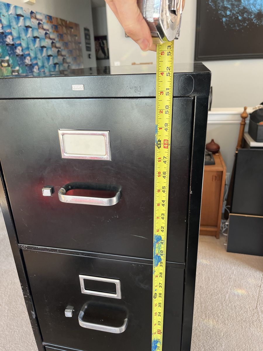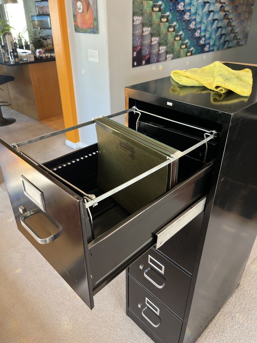 4 drawer heavy duty metal file cabinet, with adjustable depth stops and one rack with folders. Drawers come out easy for lighter transport. HON brand made in Iowa.