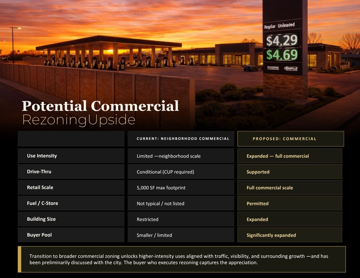 The site is currently zoned Neighborhood Commercial, which may support a range of uses and provide a helpful starting point for certain development concepts. In addition, the city has indicated a willingness to consider rezoning the property to traditional commercial, opening the door for larger-scale opportunities such as shopping centers, gas stations, and other commercial uses.