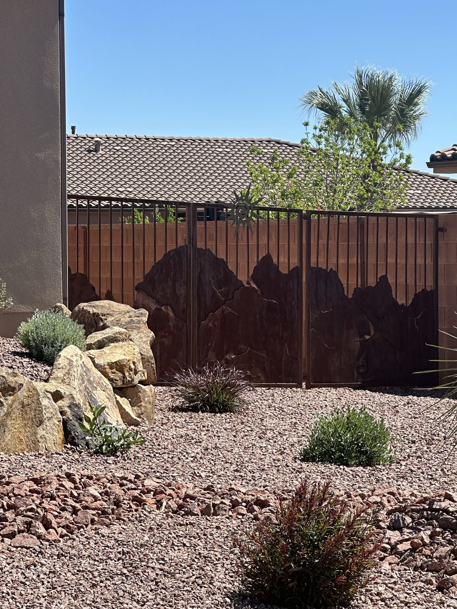 Residential metal fence with gates 21’ wide x5’ 9” high with 14 ’ split gate The other is 13’ 10” wide x 5’ 6” high with 4’ Gate. Can be modified easily to fit. They are good working condition but the patina finish needs to be redone