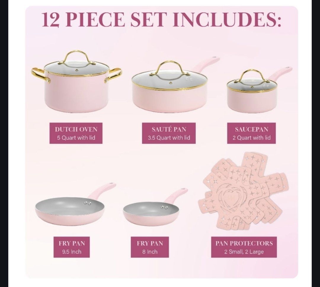 VenmoBrand new in box. Paris Hilton pot and pan set. 12 piece set including lids and protectors. Detailed sizes listed in images. Can accept cash or venmo. Open to offers.