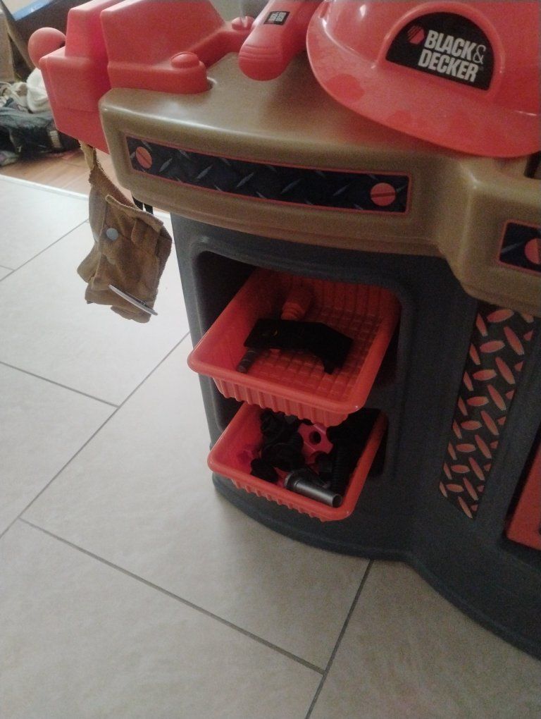 home Depot work bench toy set with 3 hammers, 2 pliers, 2 saws, power tools, nuts, screws, hardhat, tool belt and foam wood pieces. light still works. power tools need batteries. cash only. come pick it up.