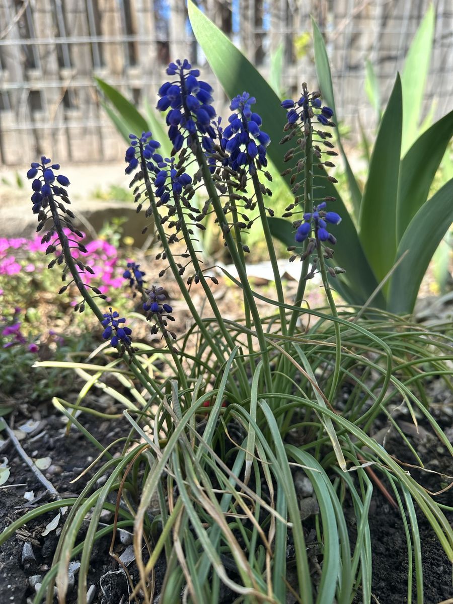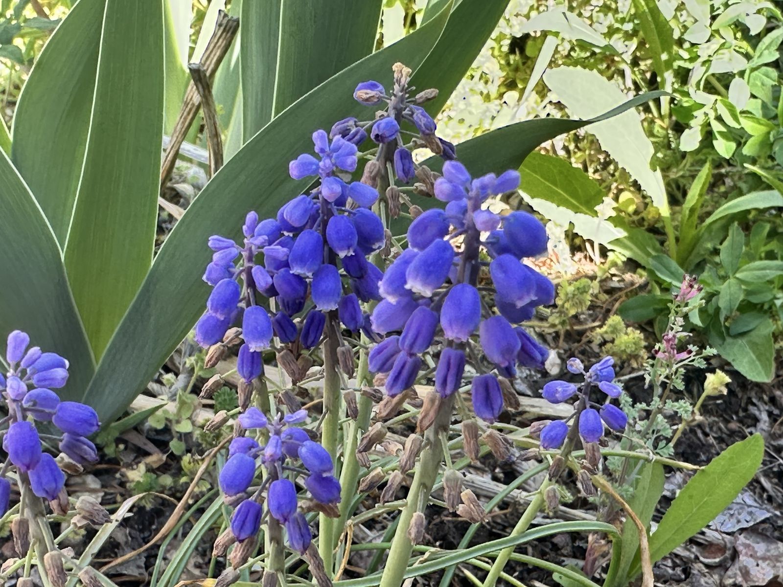 These grape hyacinth are great water wise plants, they can survive just about anything. Beautiful early blooming purple color and they are edible. Can be used to color beverages or dye baked goods.