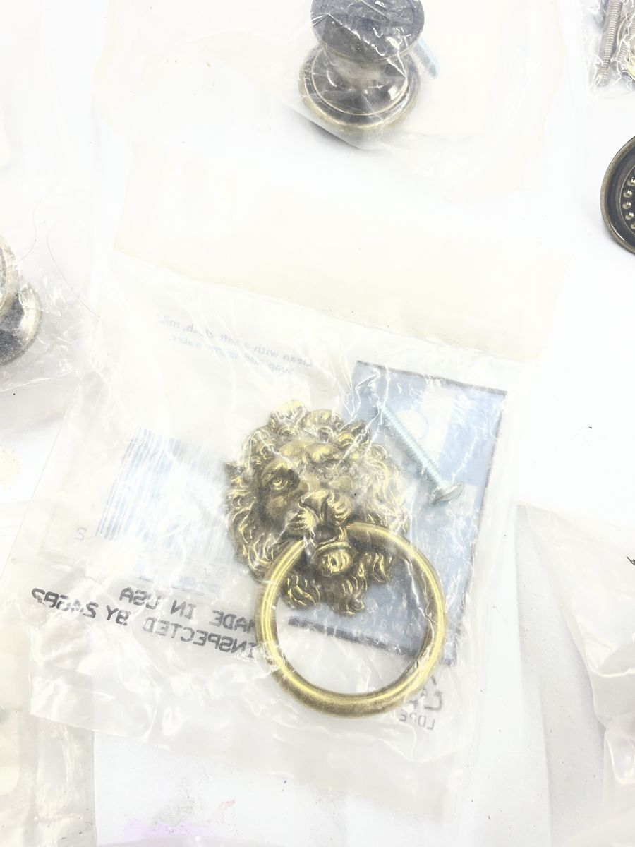 As you can see I have a limited selection of some specialty knobs left many of these brass ones are solid brass yes the very expensive ones the kind that are $10-20 each these are all new old stock my favorite is the Lyon Head pull did you see it some are wood knobs that can be finish to match your project many of these are one of a kind items that will be hard to match up to your other cabinetry so they would be best used for stand alone cabinets or custom items boxes chests etc. come make me an offer in person I don’t negotiate over the phone sorry