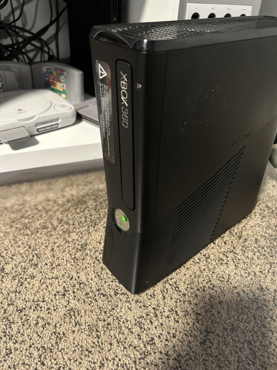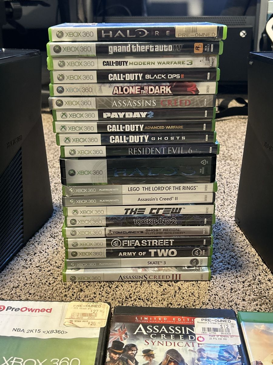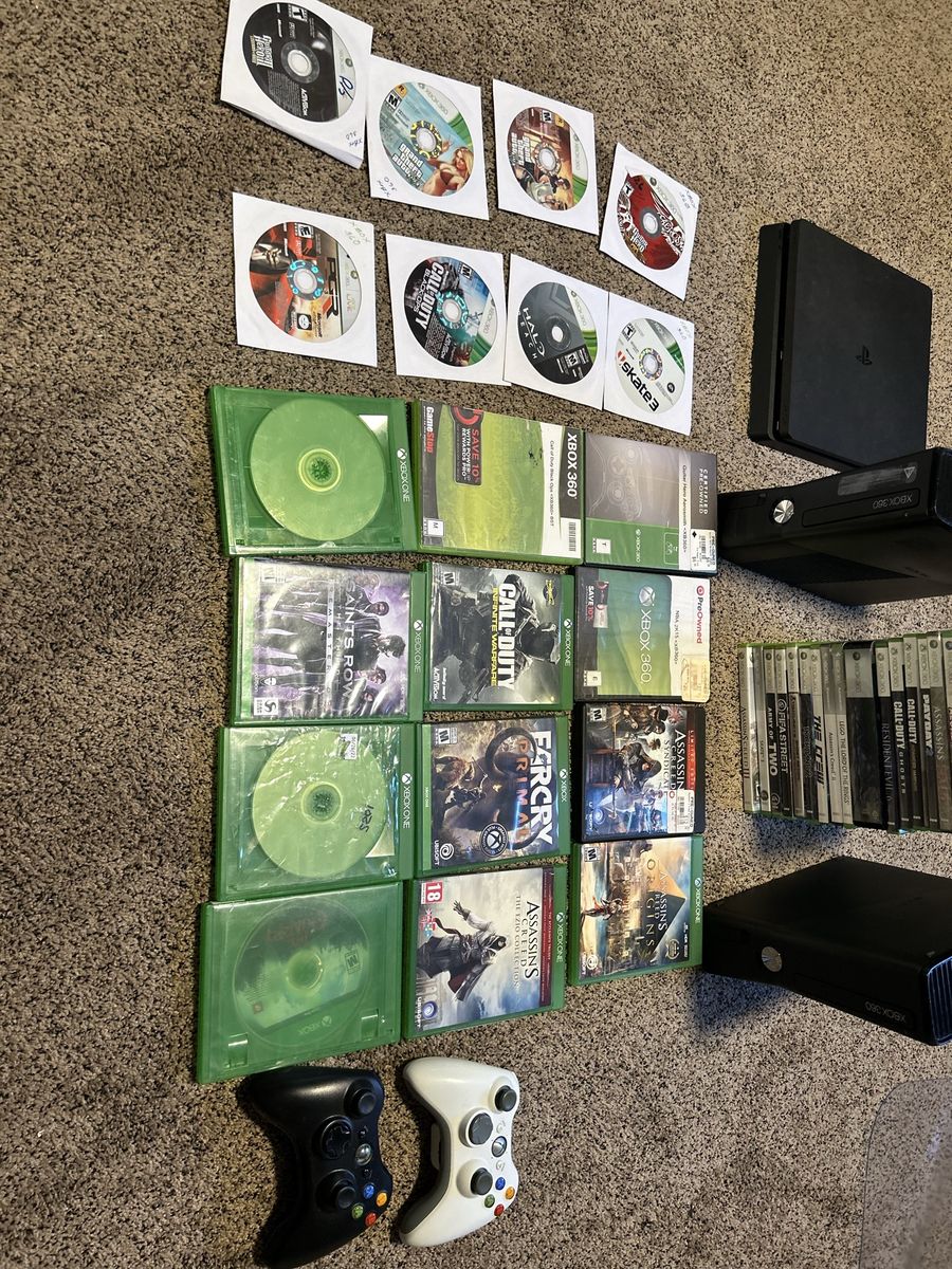 VenmoI’ve got two Xbox 360’s and one PlayStation 4 slim included our two controllers, one black one white and a total of 32 CIB games and eight disc only games for Xbox 360 and Xbox one . All systems work completely fine. The PlayStation 4 is on an older dashboard one that can mod the console so it’s worth a little bit more. Would love to trade for a PlayStation five or Xbox series X or any other retro Video Games Pick up in West Jordan, Utah