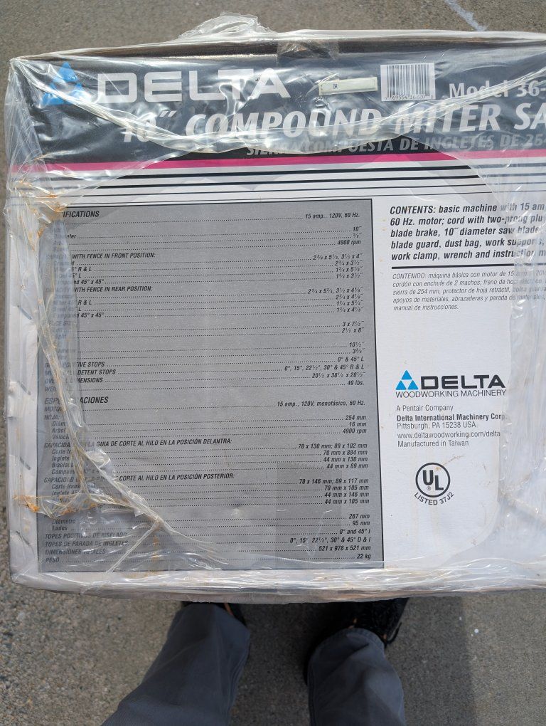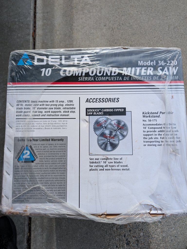 ZelleThis brand new 10" Compound Miter Saw has an 15 amp motor and other features such as an electric blade brake, retractable blade guard, dust bag, work supports, and clamp and wrench. Perfect for all your projects. Why buy used when you can have new at a great price!