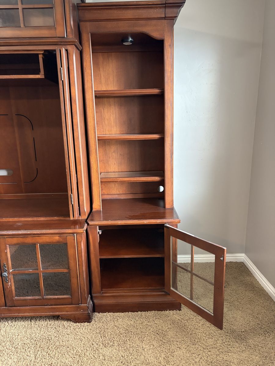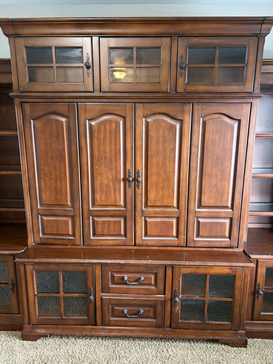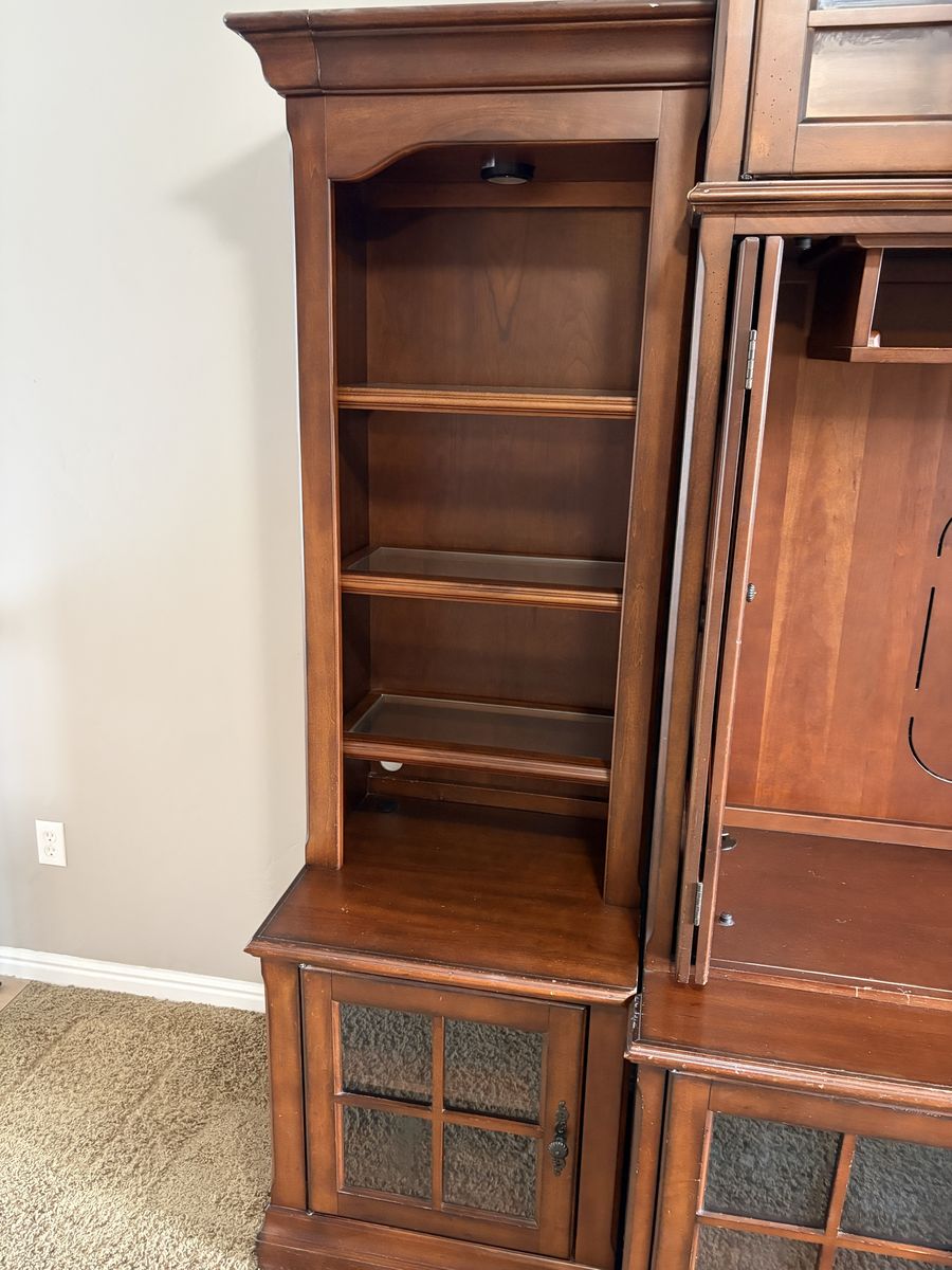 ApplePayGorgeous solid wood entertainment center. 5 glass front doors. Lights in the upper cabinets. Pull out shelves in the bottom cabinets. Doors that can hide the tv when not in use then tuck away on the side. Drawer has outlets and connections to easily plug in gaming systems. It has been well loved and used.