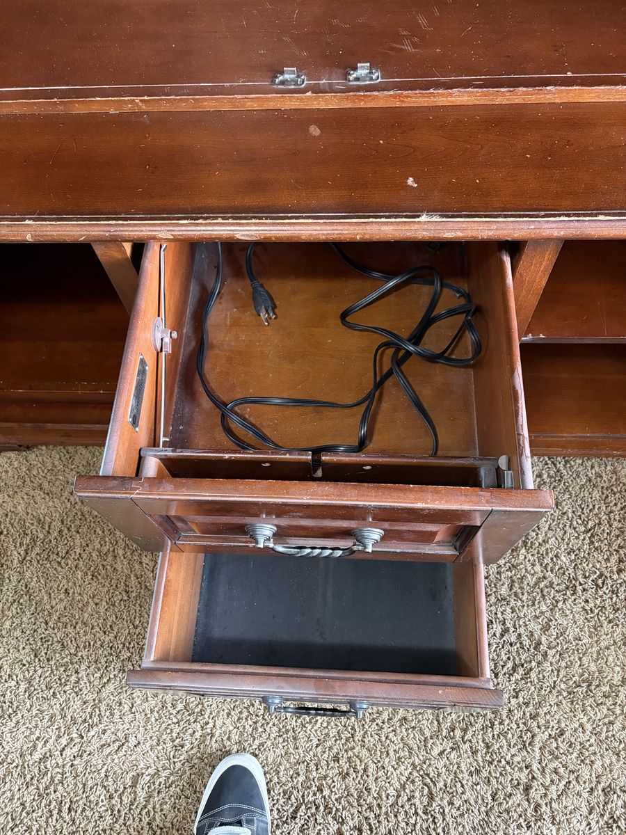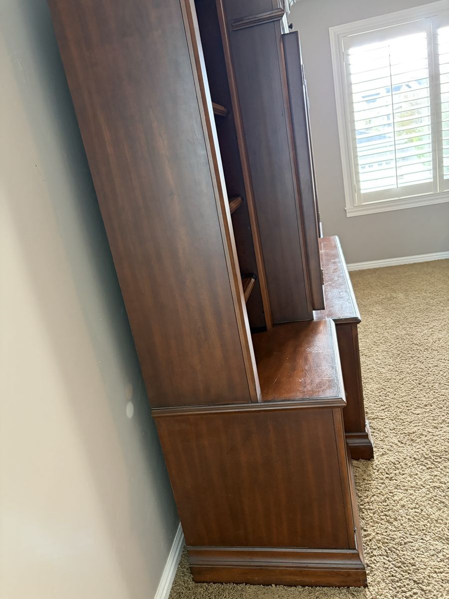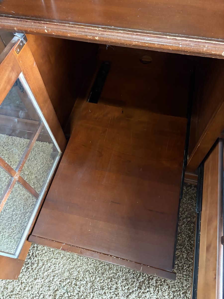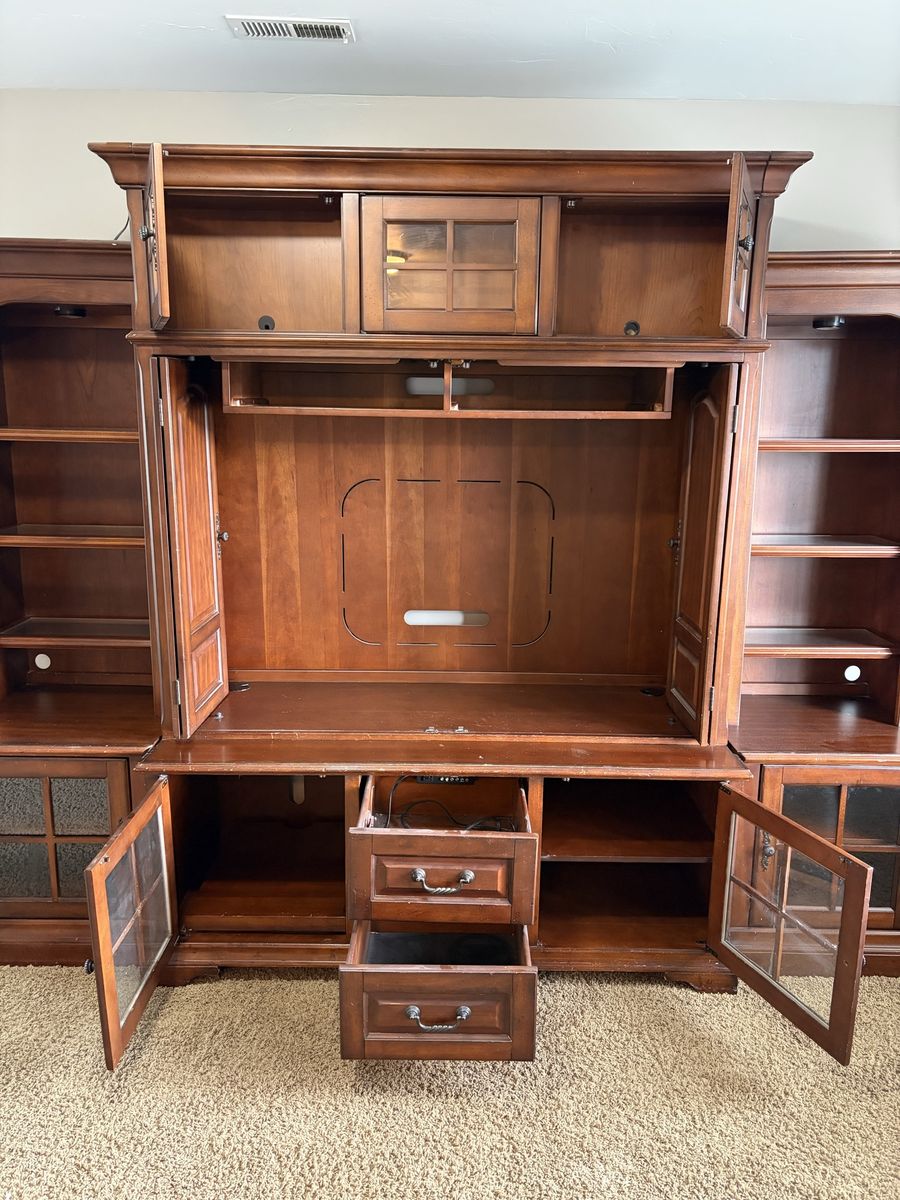 ApplePayGorgeous solid wood entertainment center. 5 glass front doors. Lights in the upper cabinets. Pull out shelves in the bottom cabinets. Doors that can hide the tv when not in use then tuck away on the side. Drawer has outlets and connections to easily plug in gaming systems. It has been well loved and used.