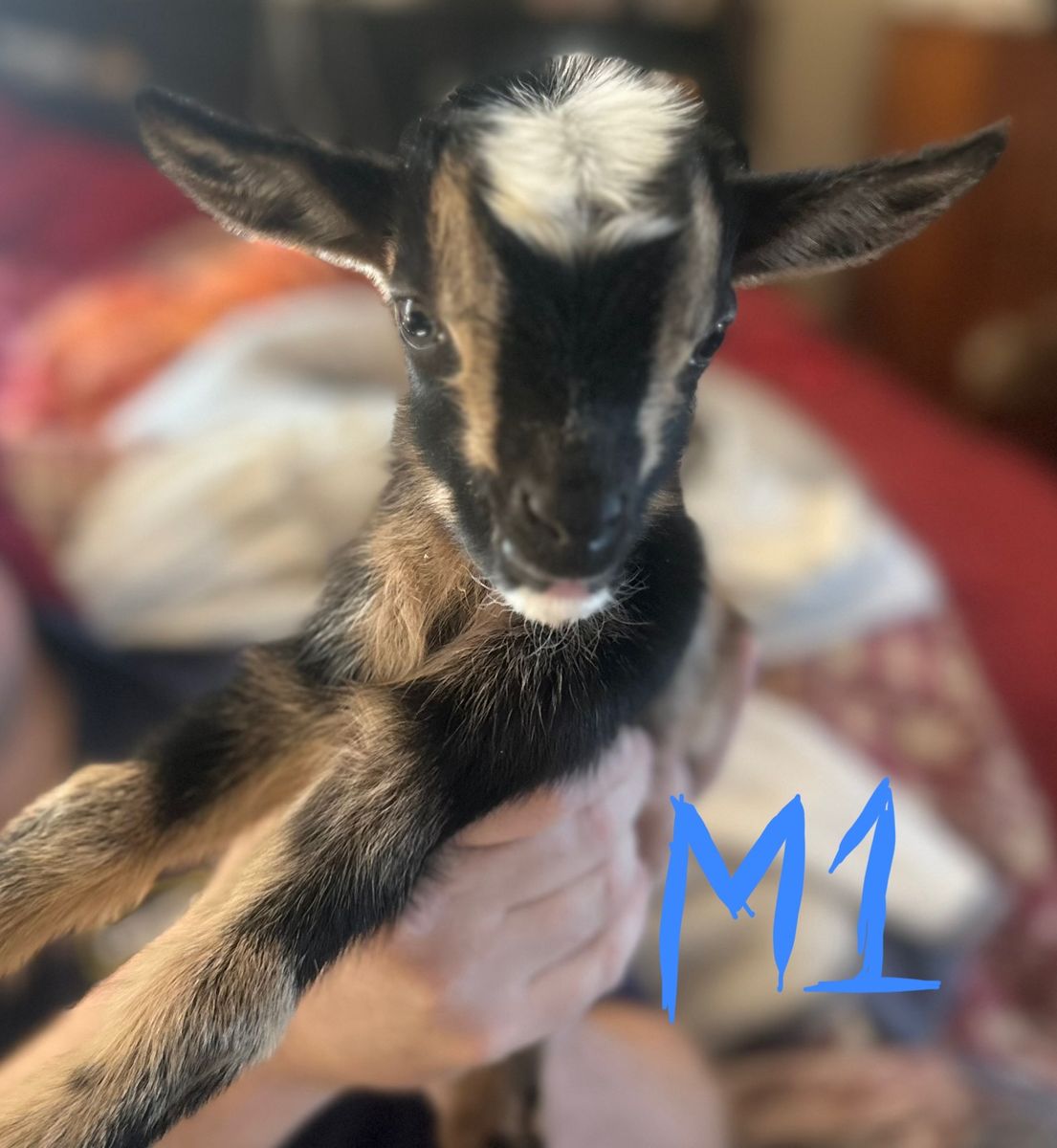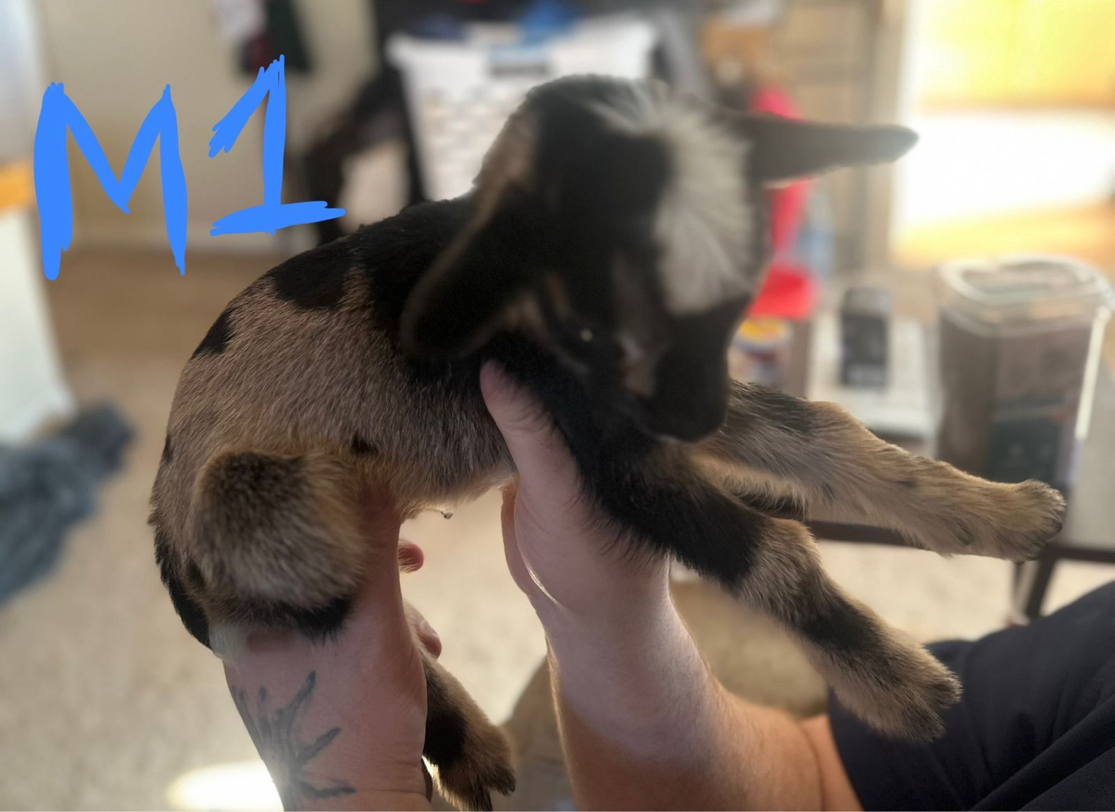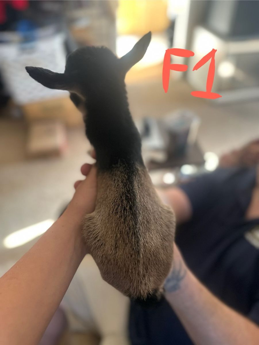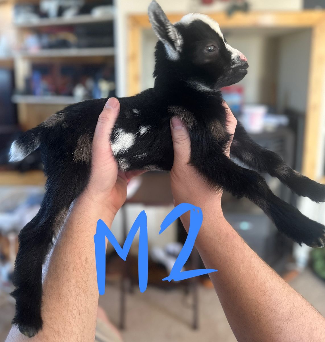 Male 1: is a very sweet moon spotted multicolor buckling Male 2: some moon spots and looks like dad Female 1 : is a similar buckskin/black to Male 2 but no spots Female 2: she is a sweet chocolate girl that’s calm and cuddly Female 3: is black and white and the biggest of the bunch