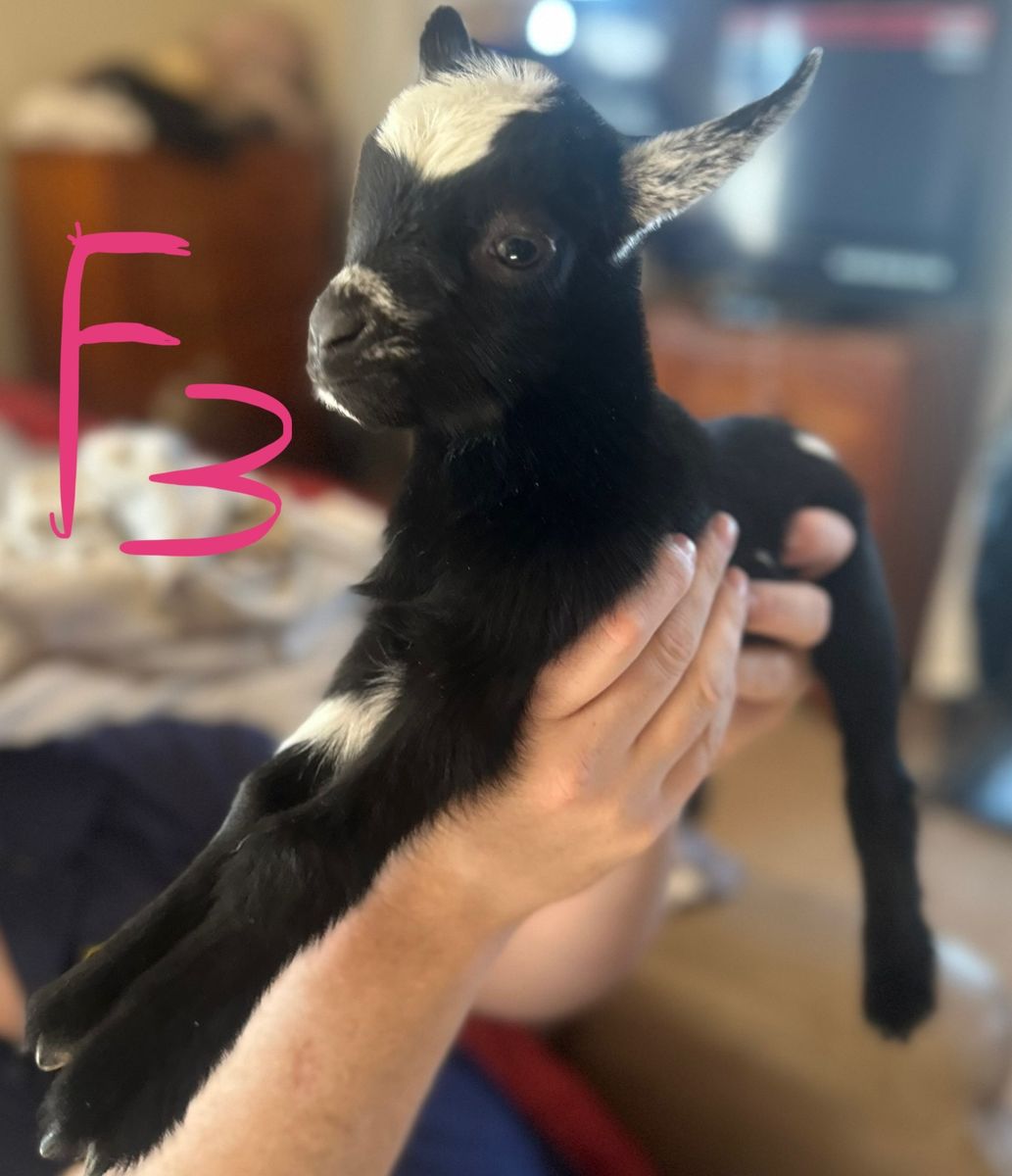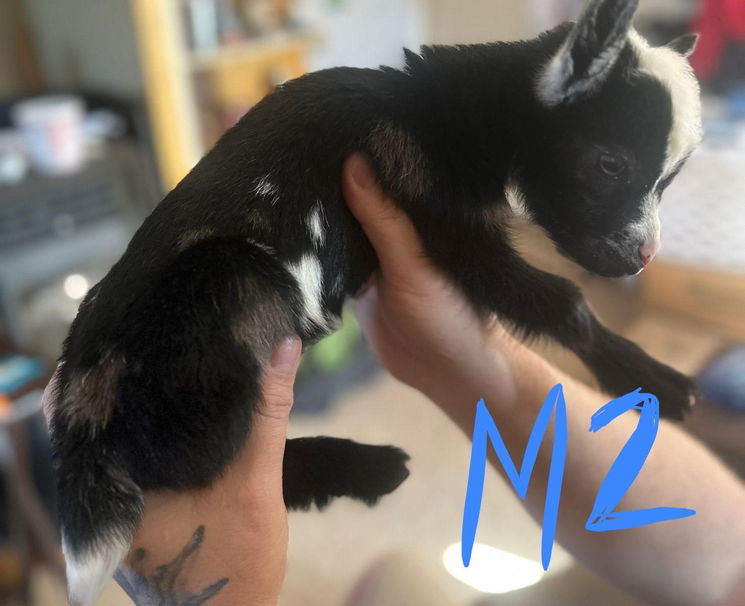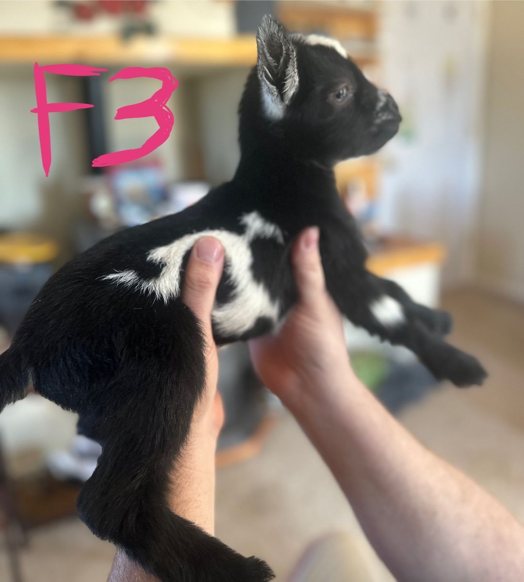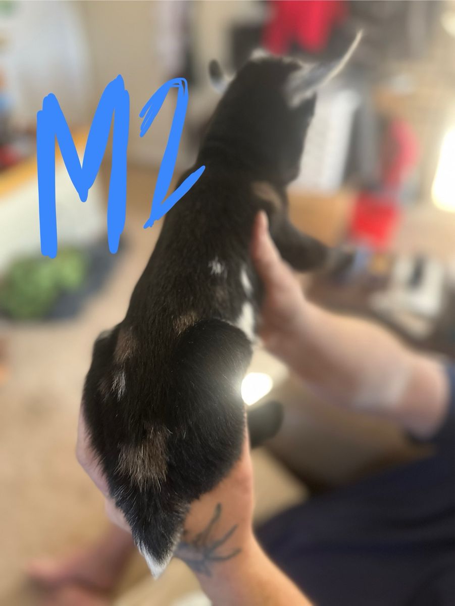 Male 1: is a very sweet moon spotted multicolor buckling Male 2: some moon spots and looks like dad Female 1 : is a similar buckskin/black to Male 2 but no spots Female 2: she is a sweet chocolate girl that’s calm and cuddly Female 3: is black and white and the biggest of the bunch