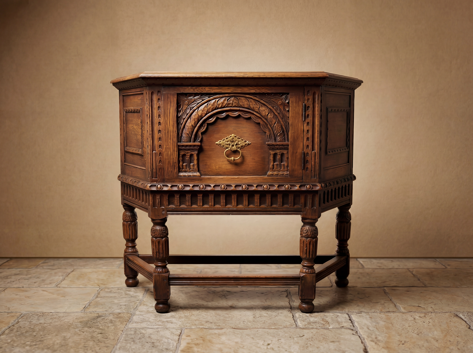 Set includes: Extension dining table, 7 carved high-back side chairs, 3 captain's chairs, monumental two-section china hutch/cabinet, and a distinctive hexagonal carved server/sideboard — all with matching carved detail and original brass hardware.