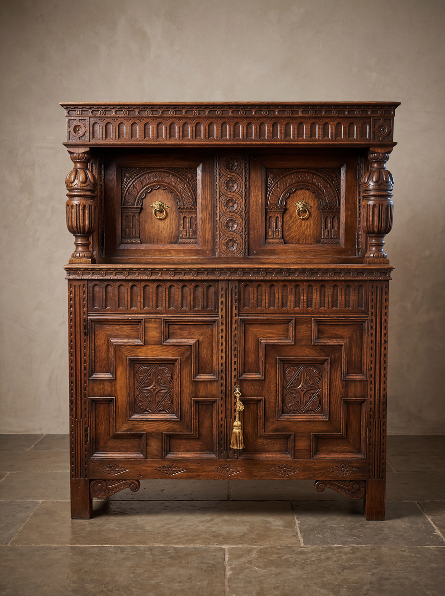 CashAppComplete 16-piece circa 1925 American Jacobean Revival dining suite in dark oak with mahogany top. All pieces professionally refinished and in excellent structural condition.