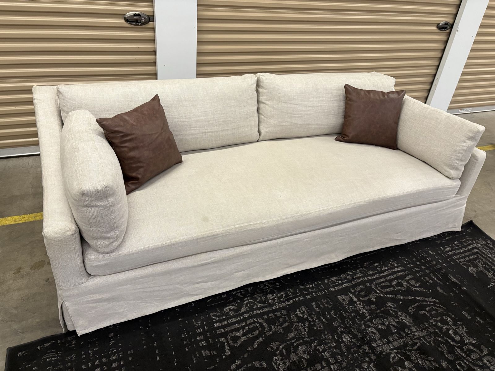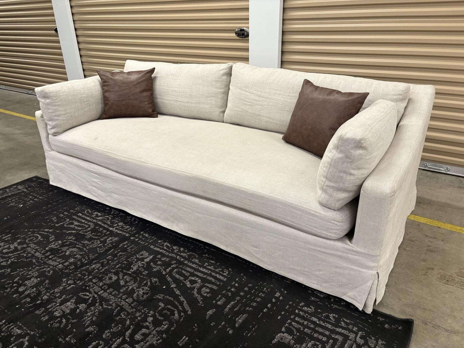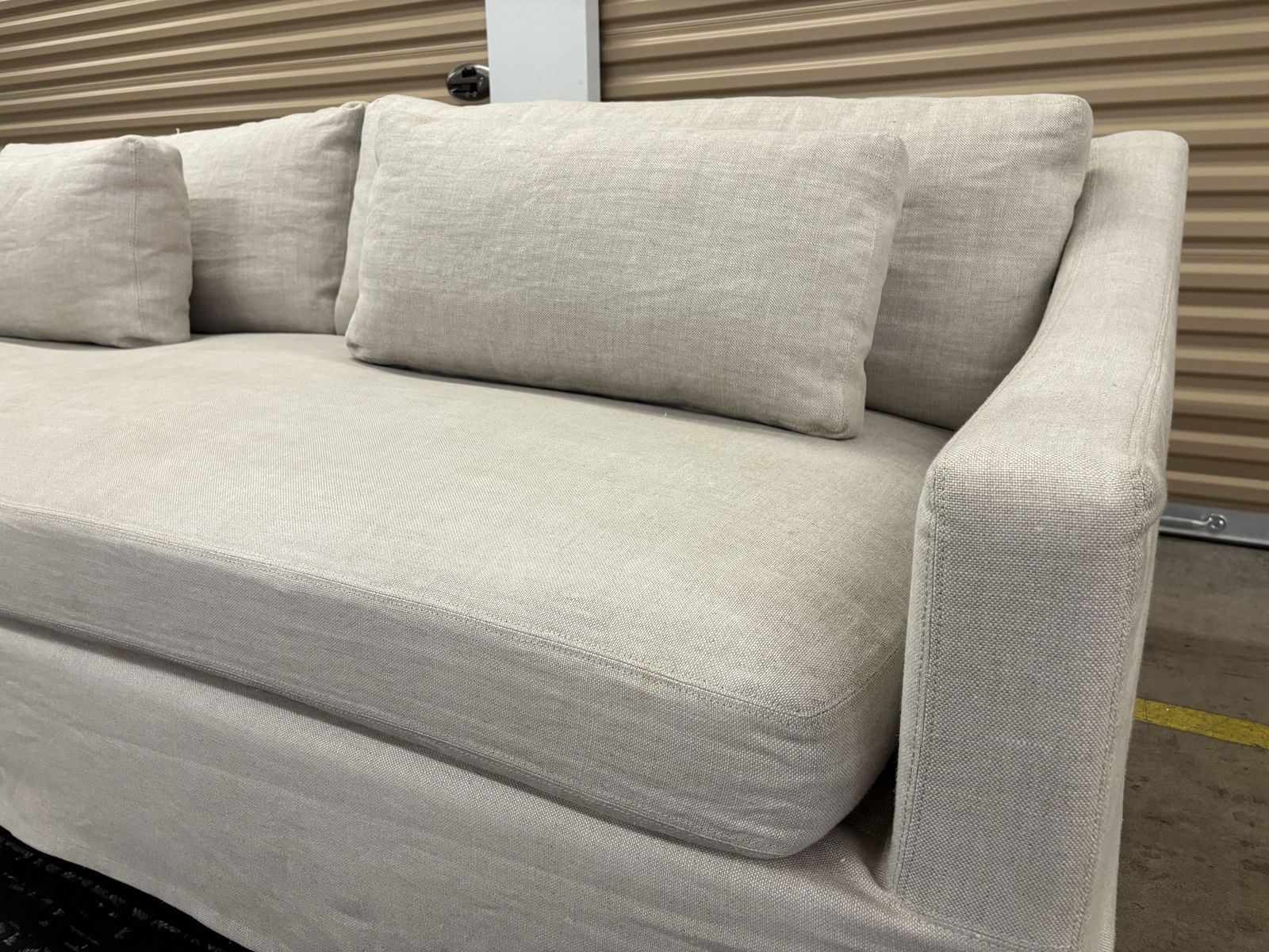 ‼️ Dimension: 96” x 42” deep RH slipcovered sofa comfortable, and oversized (96”). No rips or damage. Overall pretty clean. Seat cushion could use a light professional cleaning Covers are removable and can be professionally cleaned if desired.