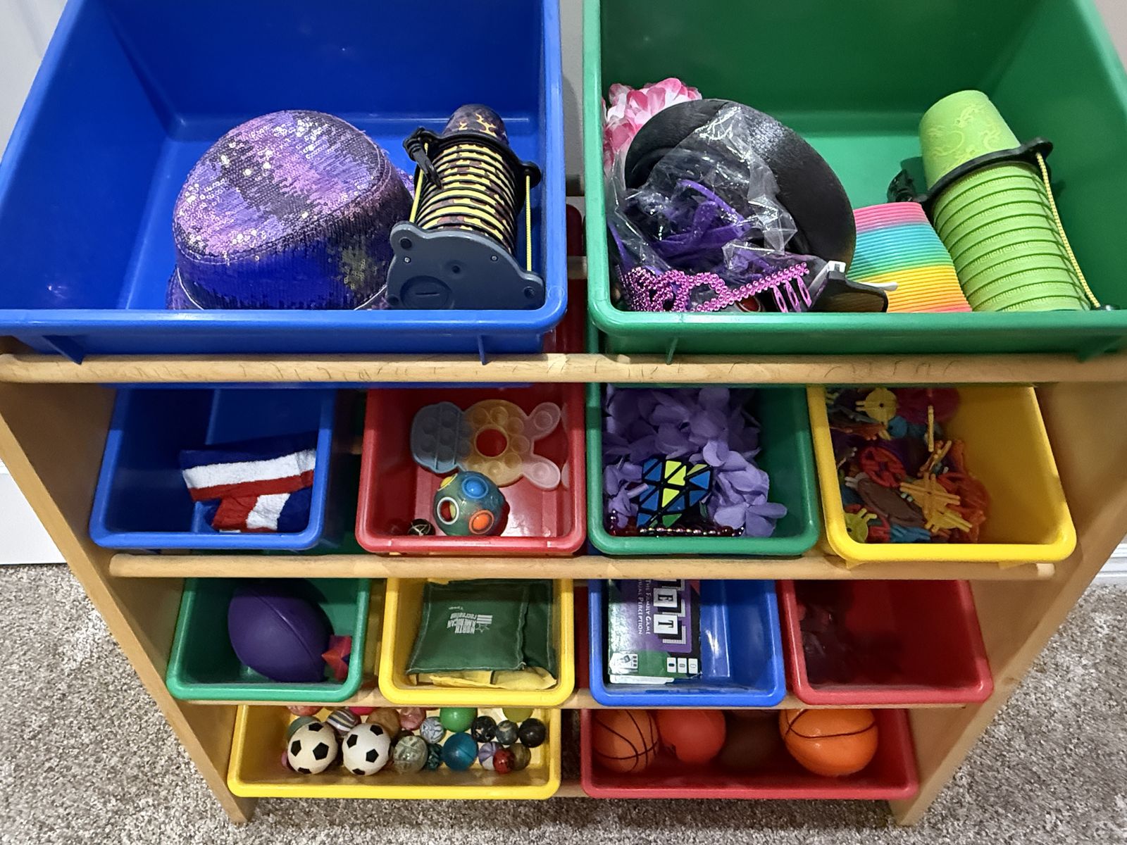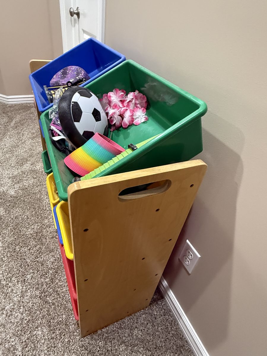 VenmoToy bins with some toys included - several balls, stacking cups, and other items pictured.