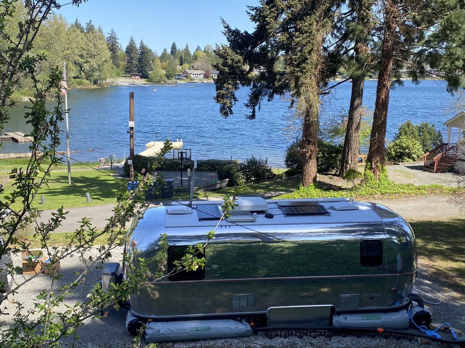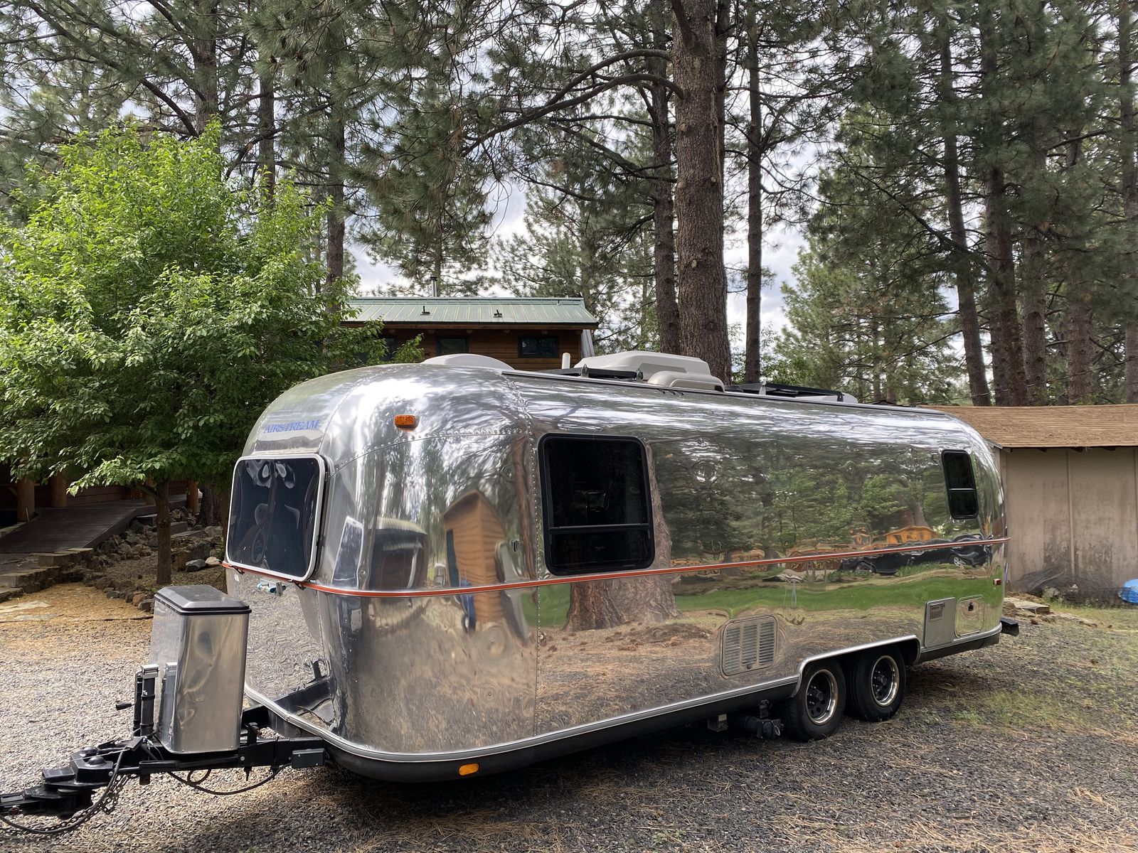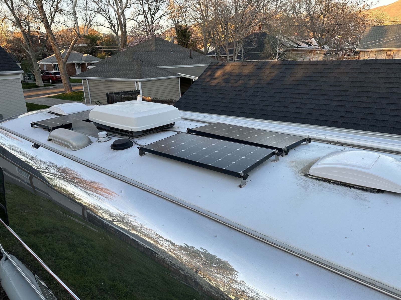 The exterior of our Airstream has been polished to a mirror finish. On the roof, it is equipped with three 100 watt solar panels and comes with a 4th panel which is deployed on the ground ($2,500 option at the time of install).
