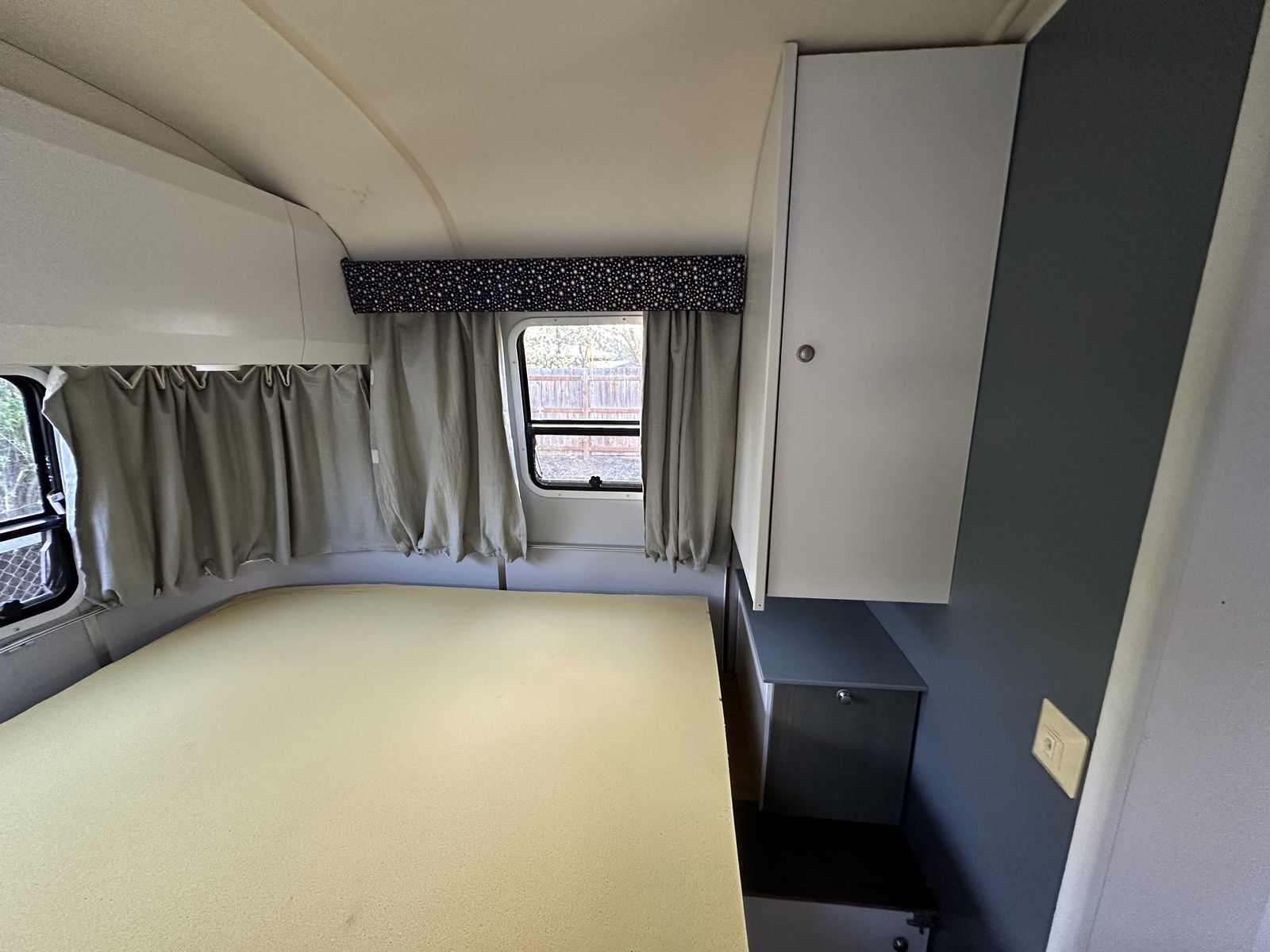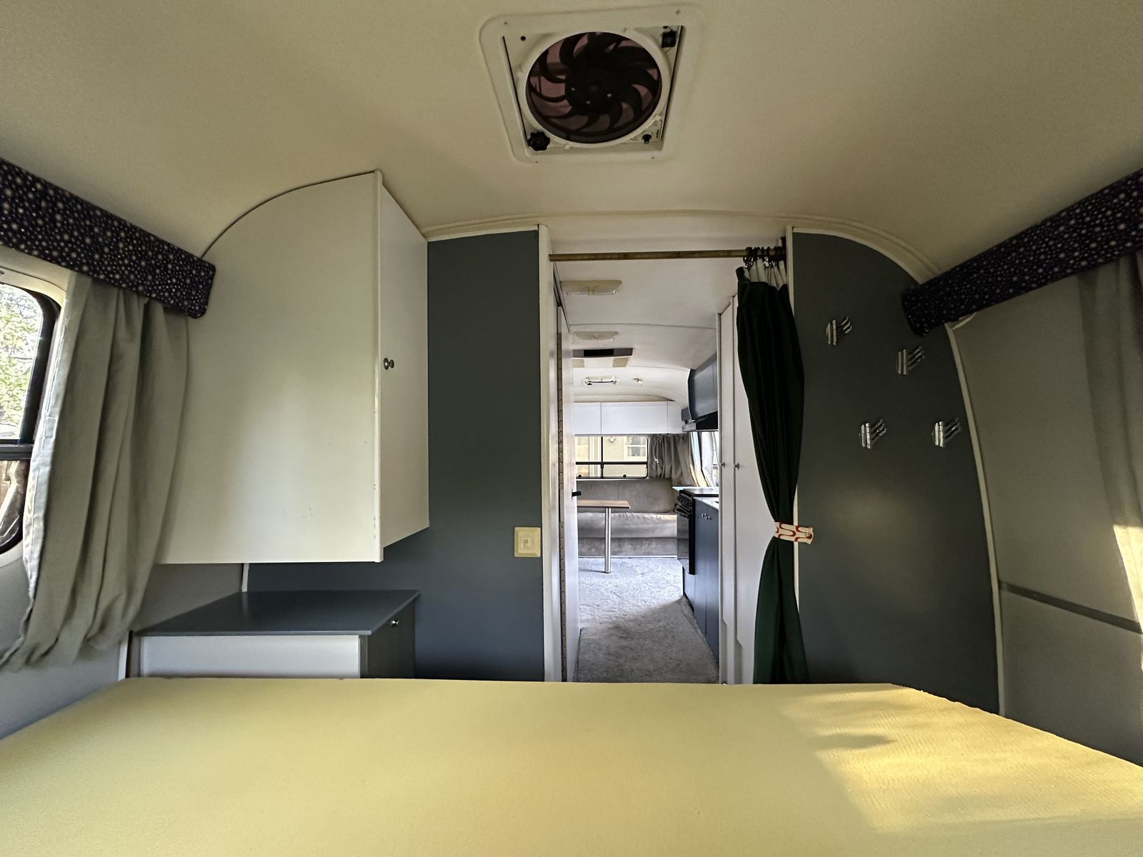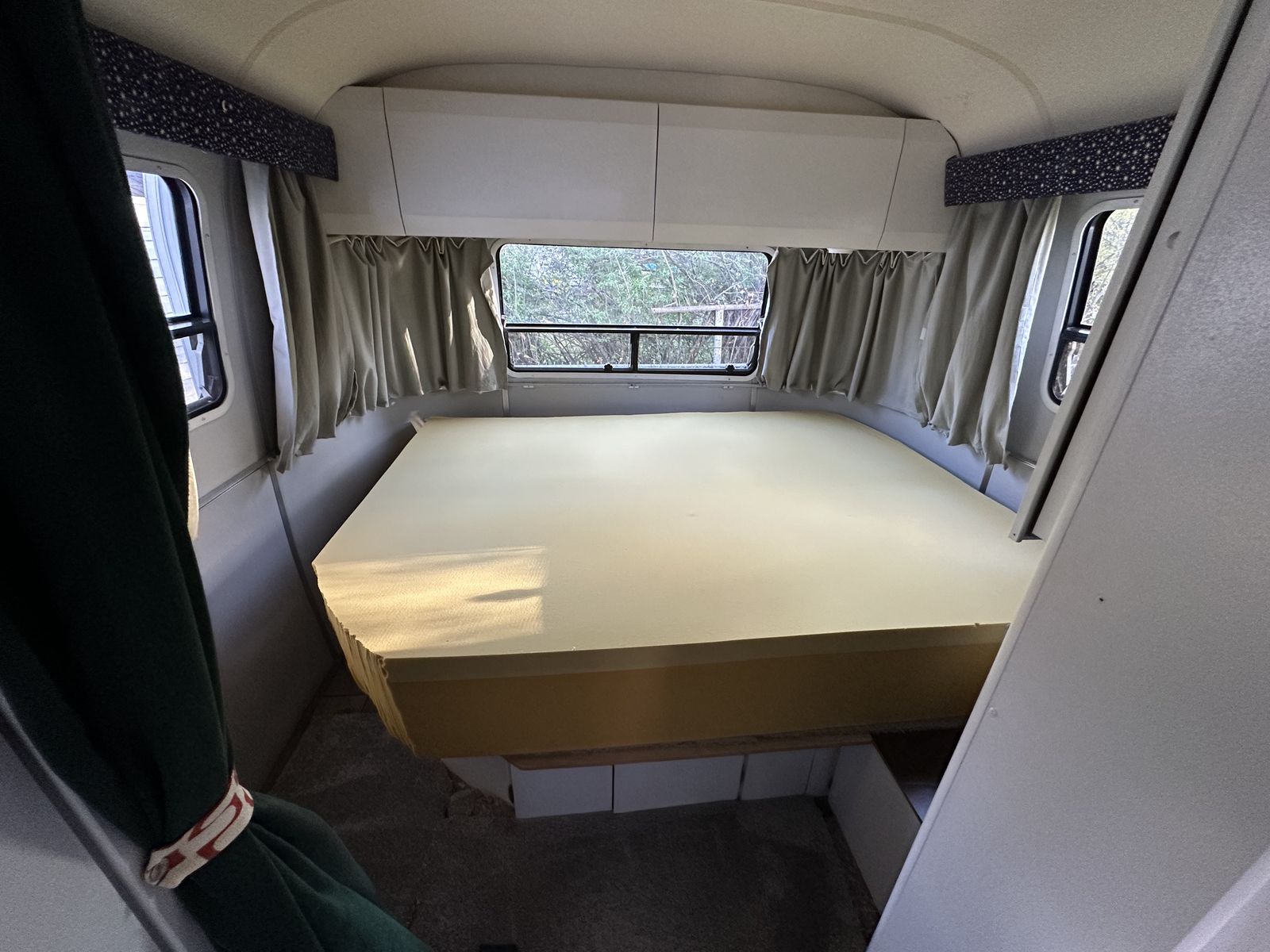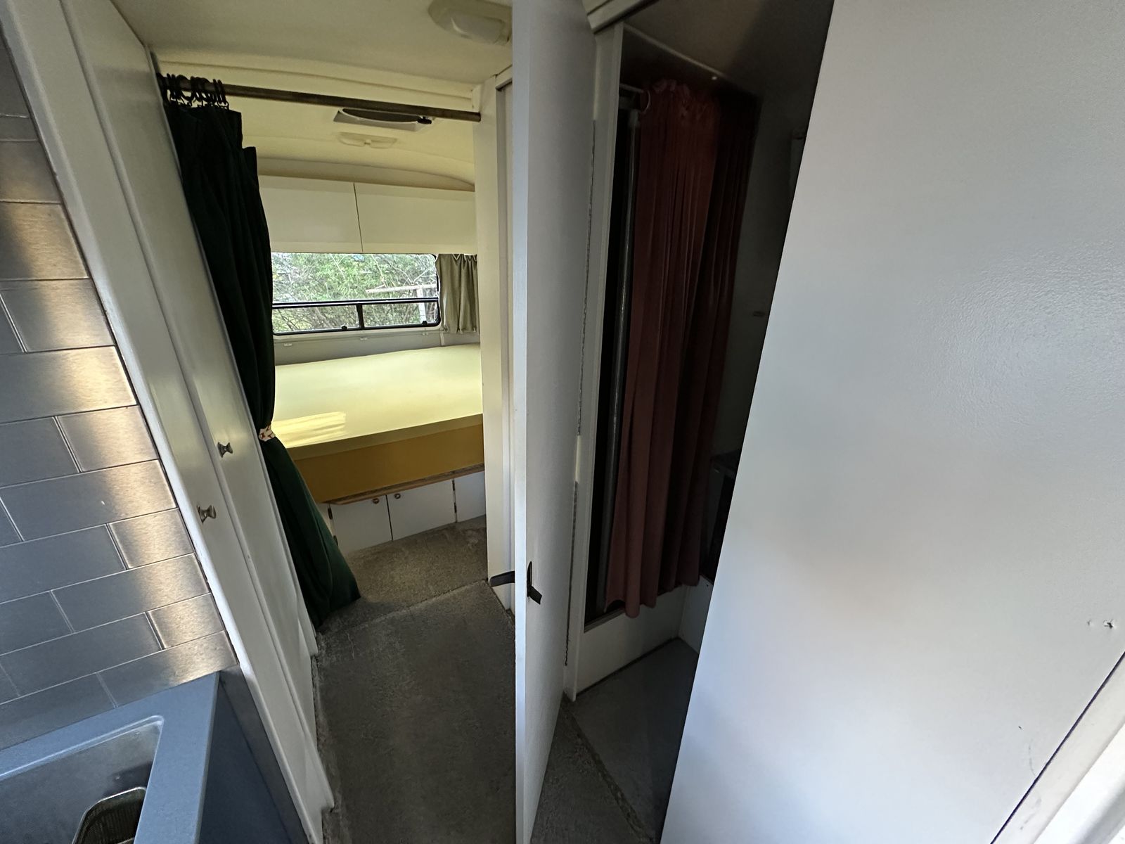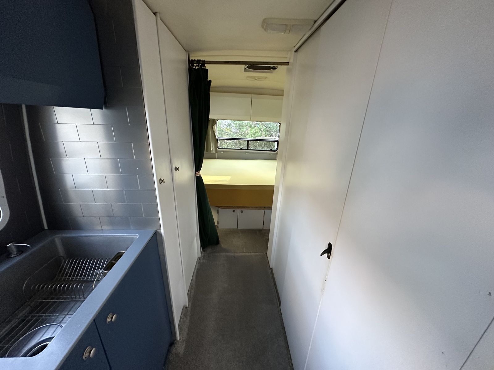 Layout: Front sleeper sofa, mid bathroom / kitchen, rear bedroom (one full size bed).