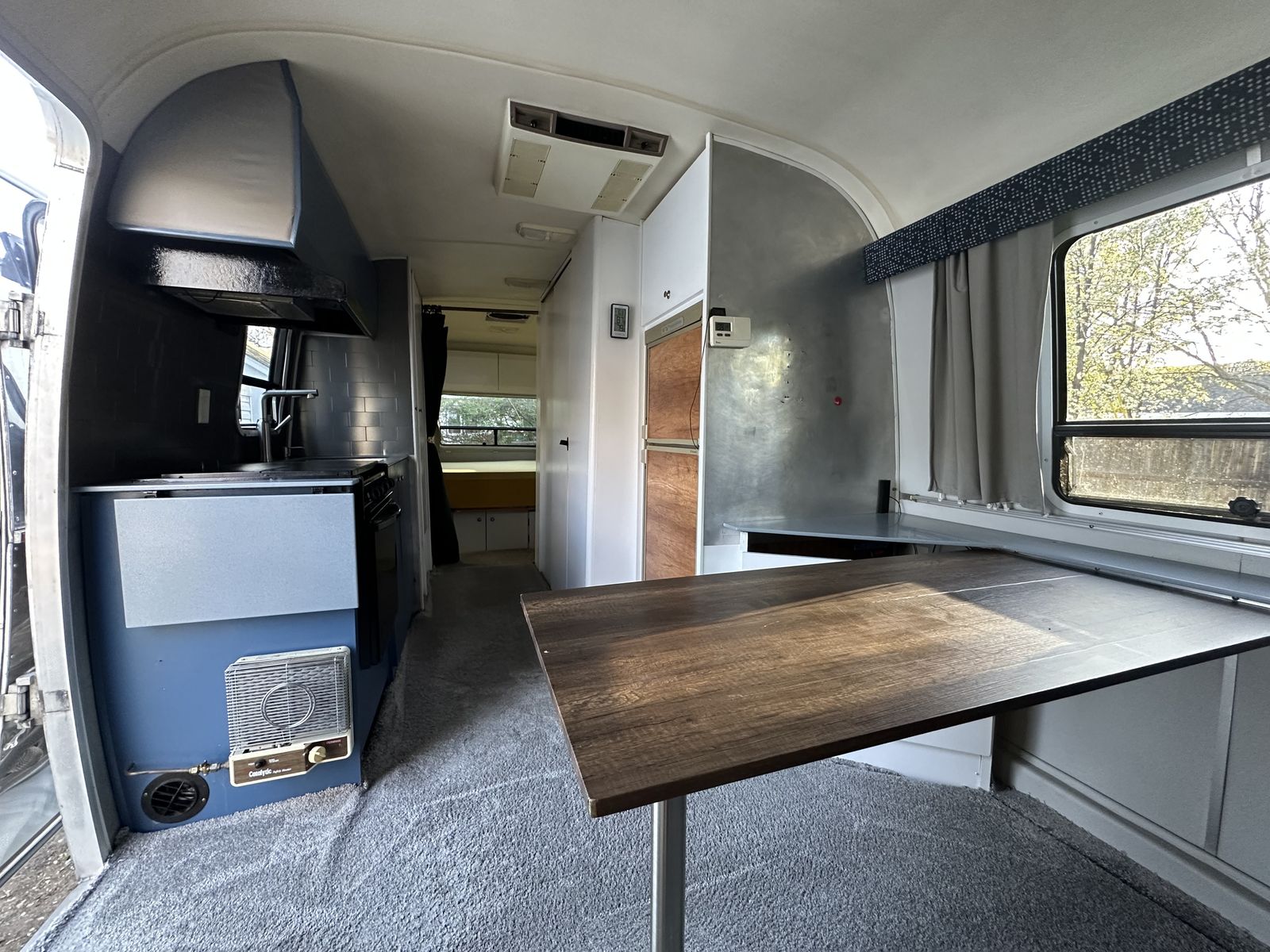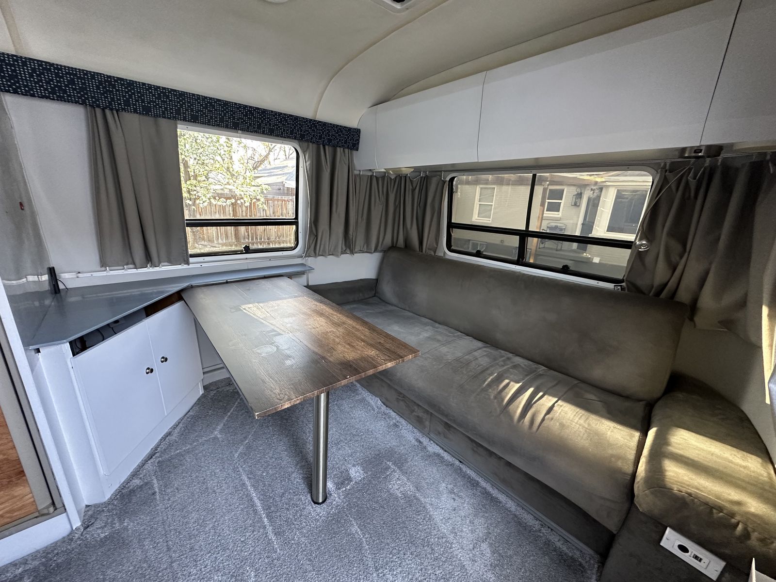 The interior is completely renovated with both original and upgraded components. This airstream underwent a major interior upgrade to include new walls, new laminate flooring, and a complete re-wiring of the electrical system to accommodate the solar charging system.