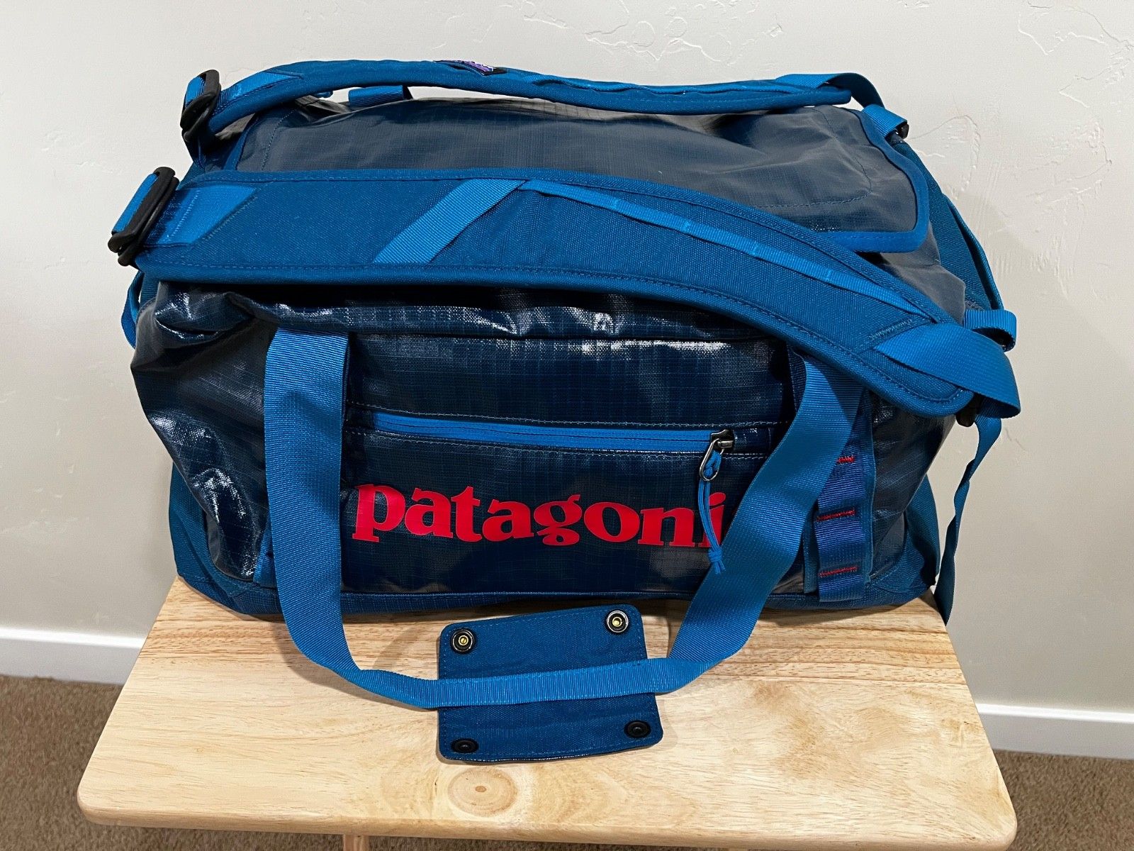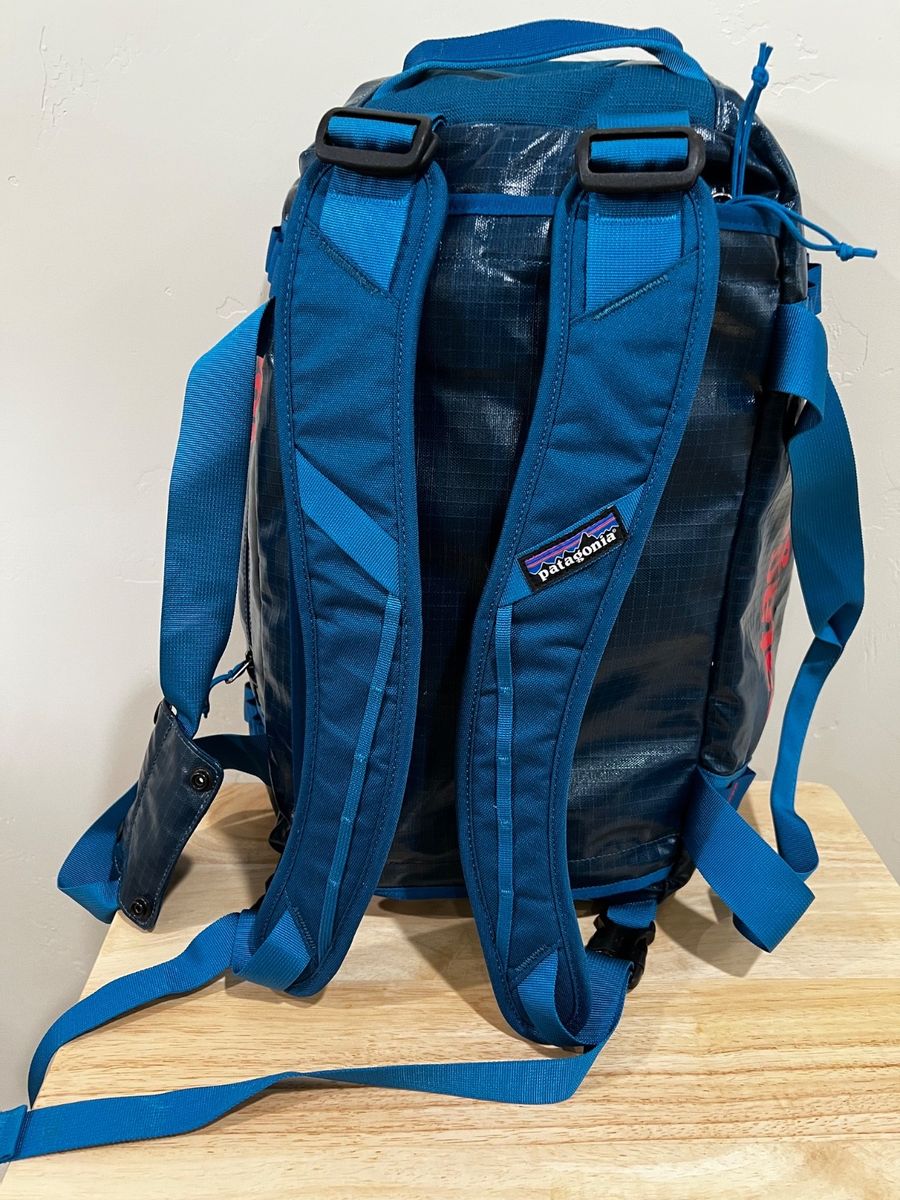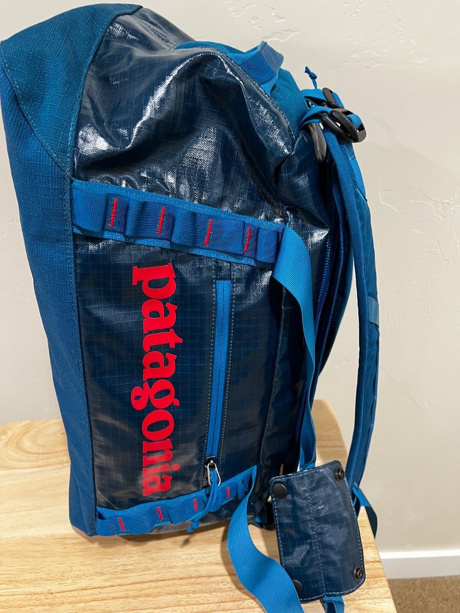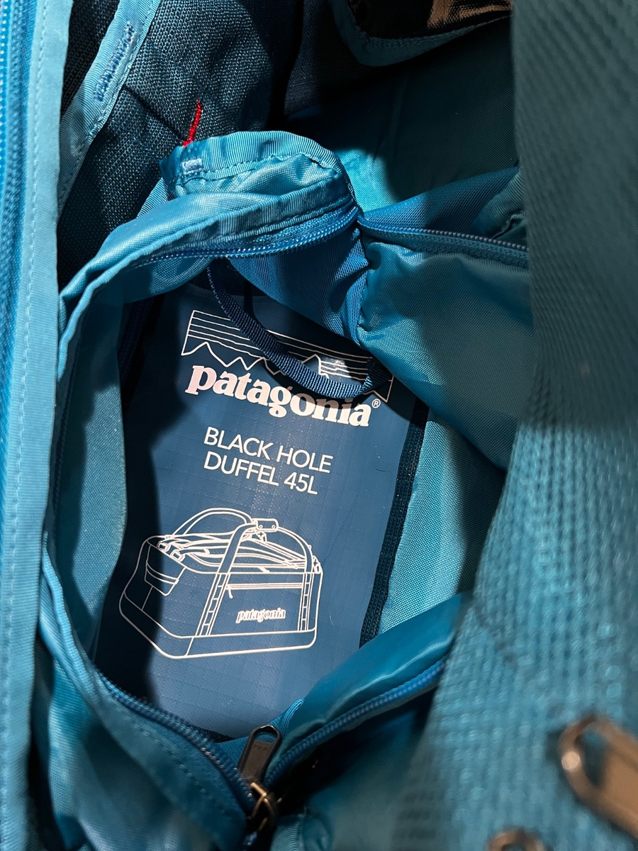 VenmoThe Patagonia Black Hole 45L duffle with detachable backpack straps is a versatile and durable travel bag perfect for any occasion. Made of polyester material with a solid blue color and red logo, this duffle features a zip closure to main compartment and nylon handle/strap material for easy transportation. The detachable backpack straps add convenience and flexibility, making it suitable for both the duffle and backpack styles. With its high-quality construction and reputable Patagonia brand, this duffle is a reliable choice for unisex adults on the go. External pocket allows access to inside main compartment. Two inside zip mesh pockets. Excellent condition. Carry on size- works for short trips. Can be stuffed in internal pocket for storage.