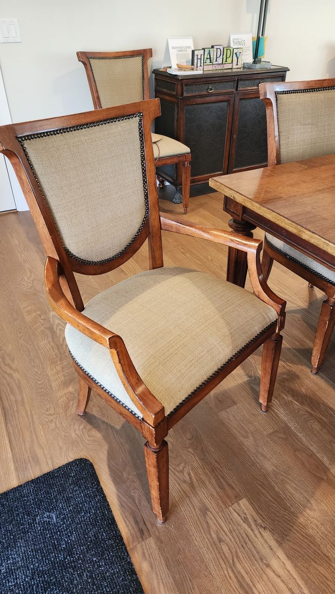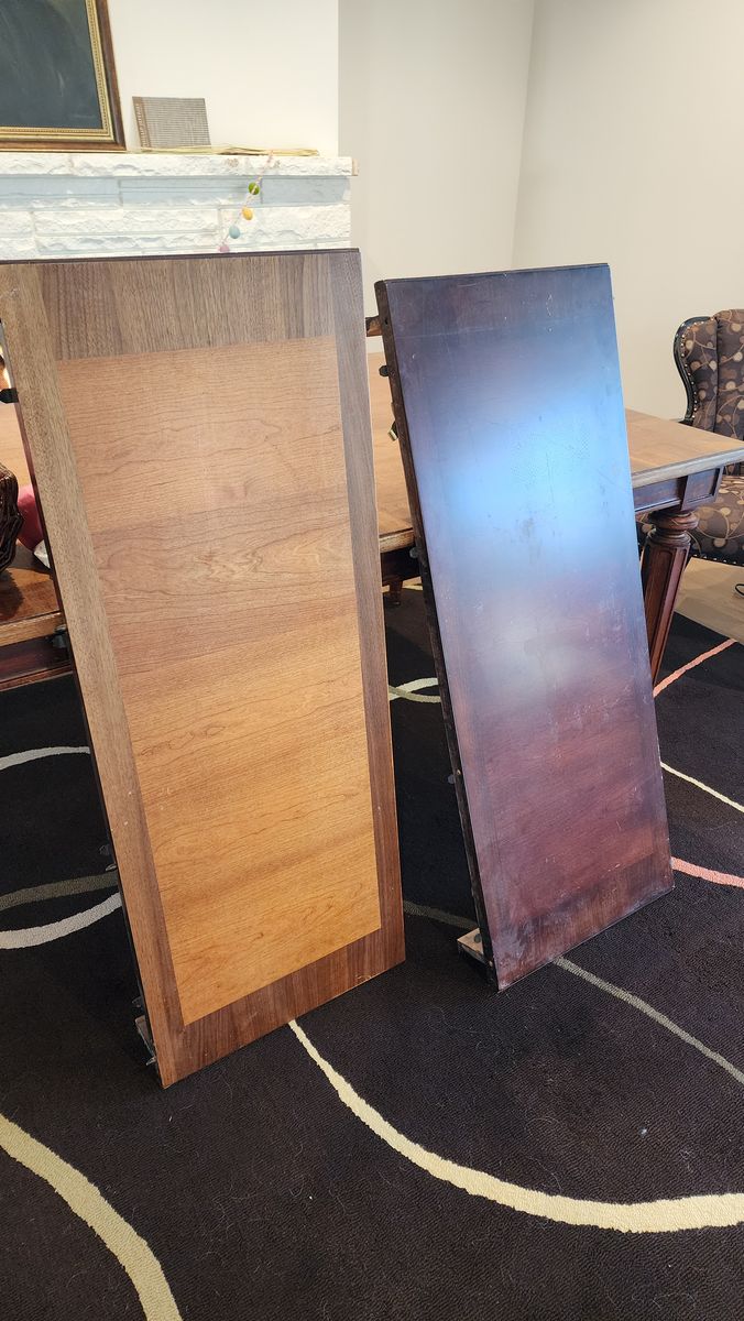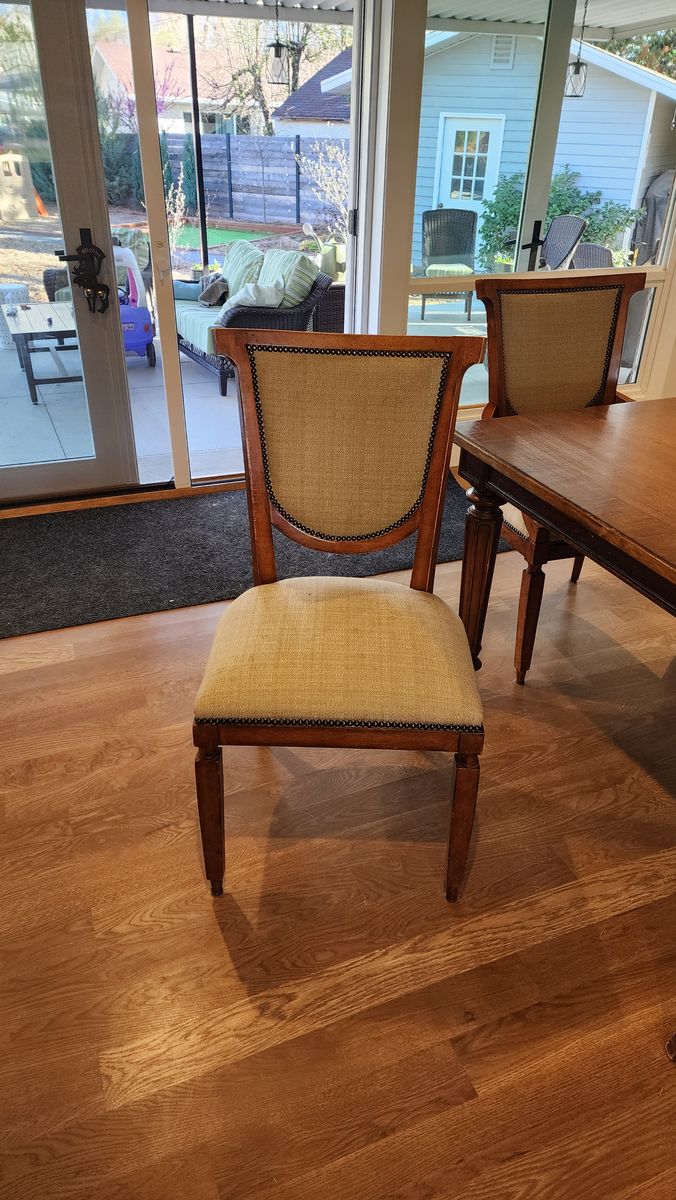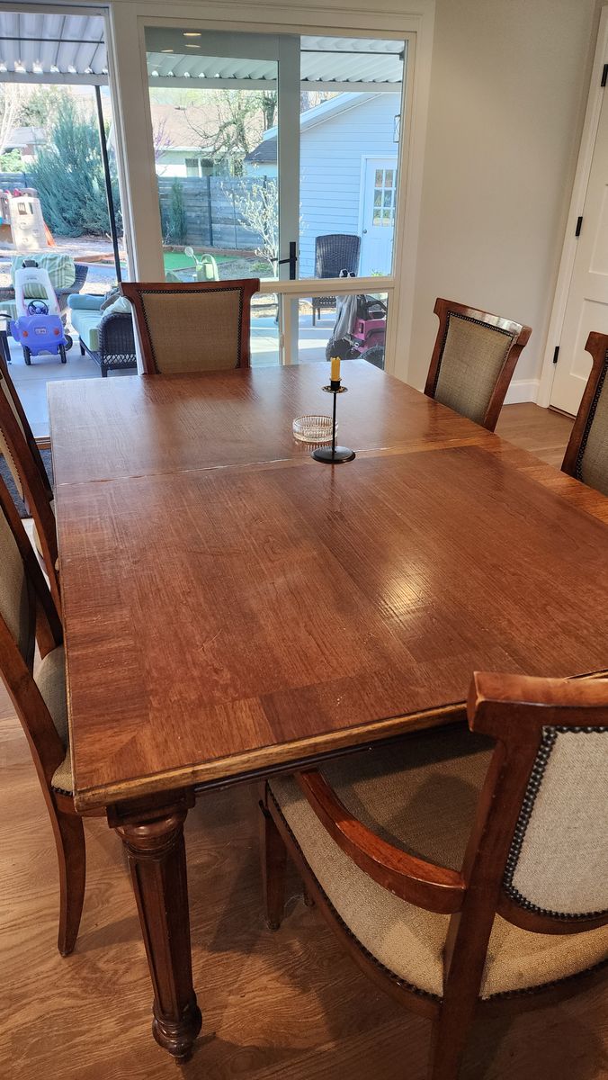 76" long, extends to 112" with 2 18" leaves. 2 arm chairs, 6 w/o arms. 46" wide. One of the leaves is darker than the other.