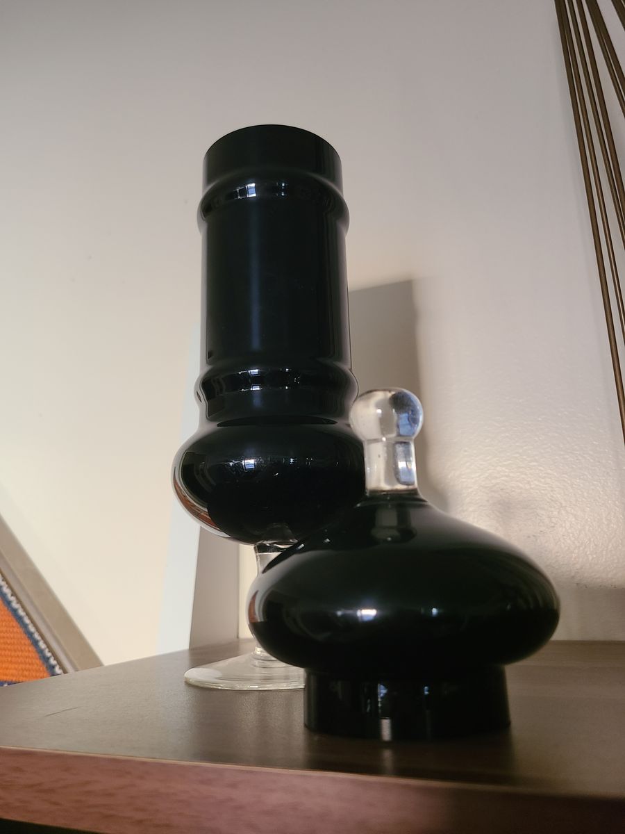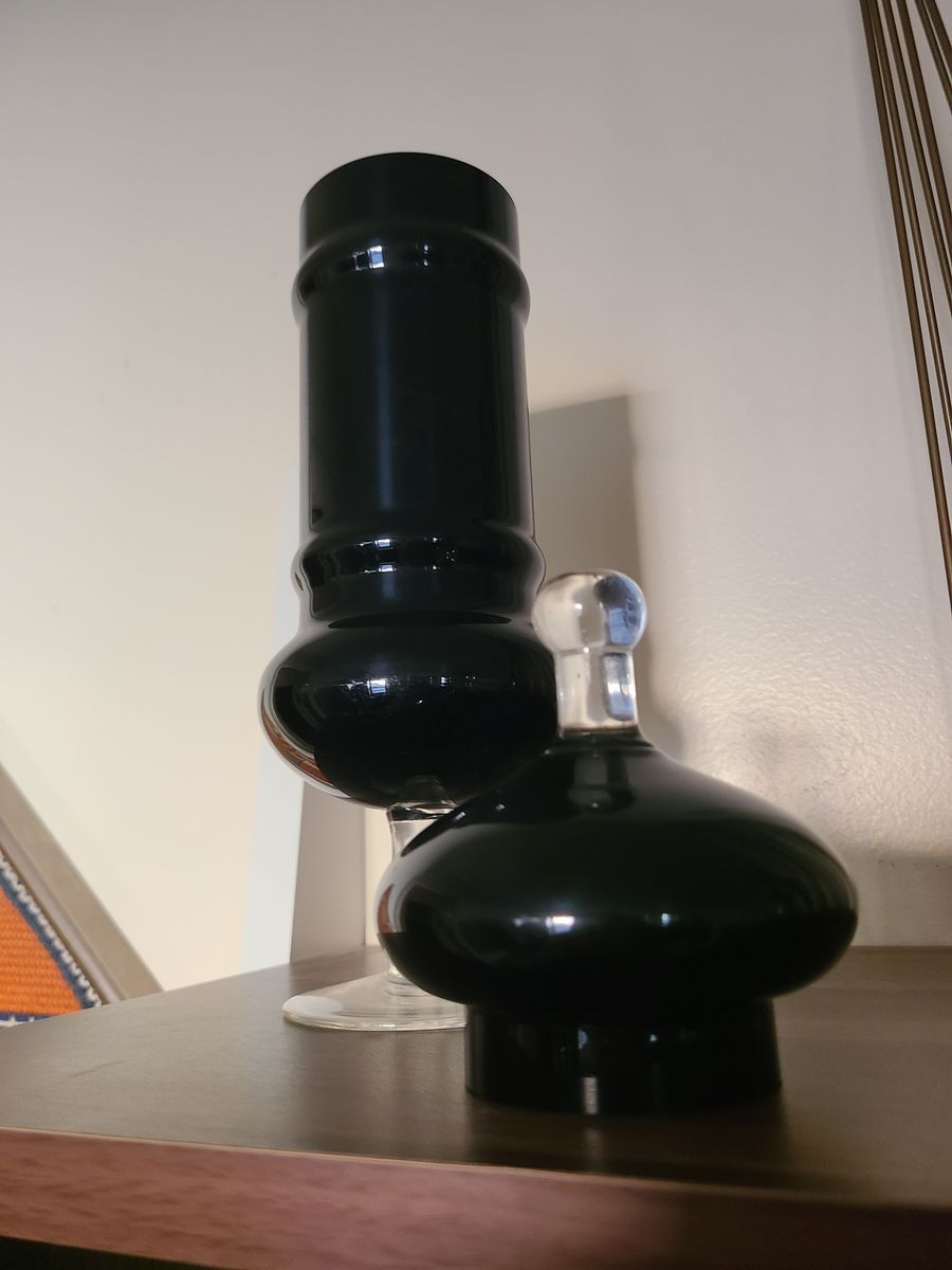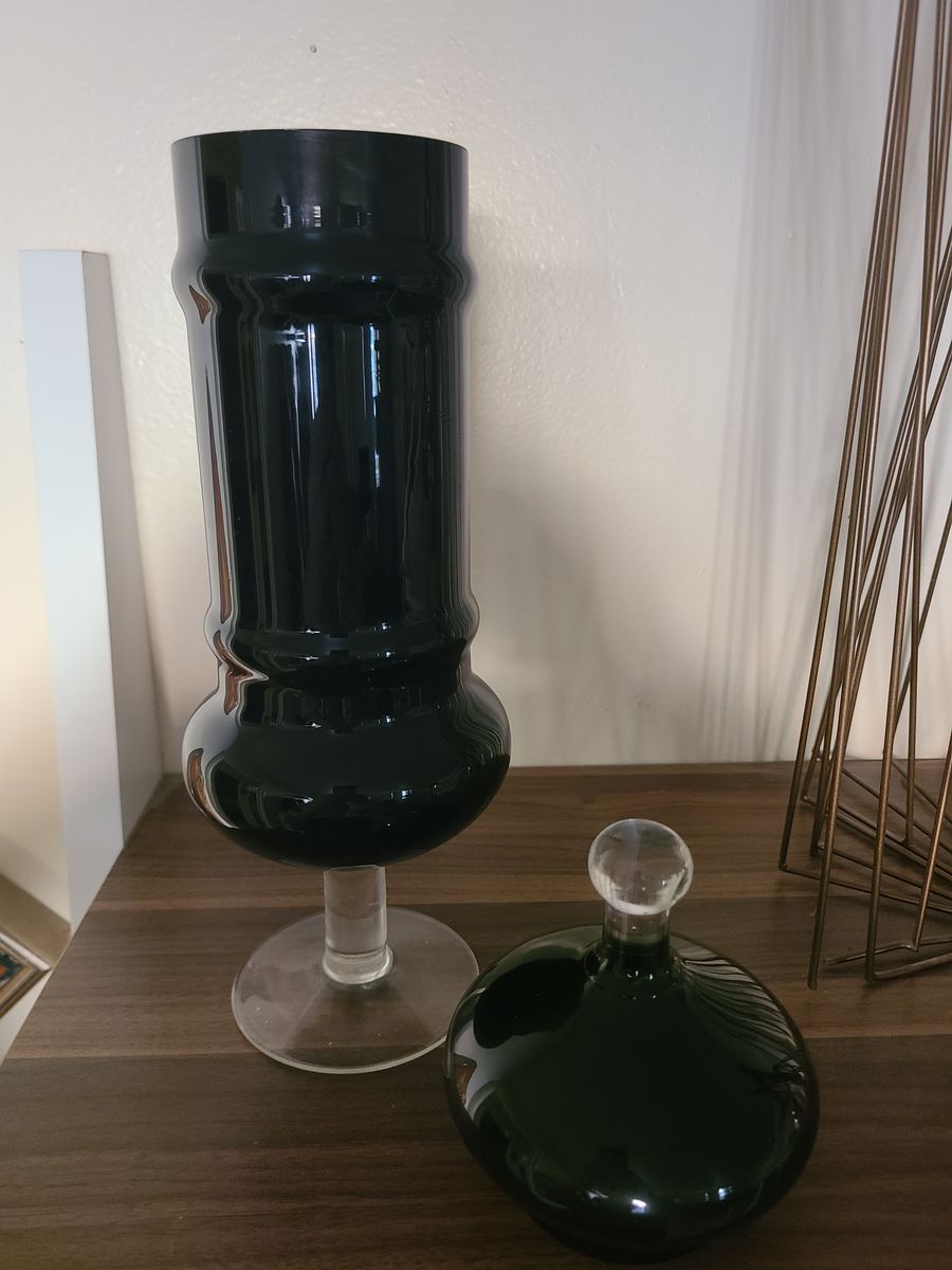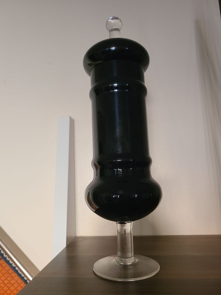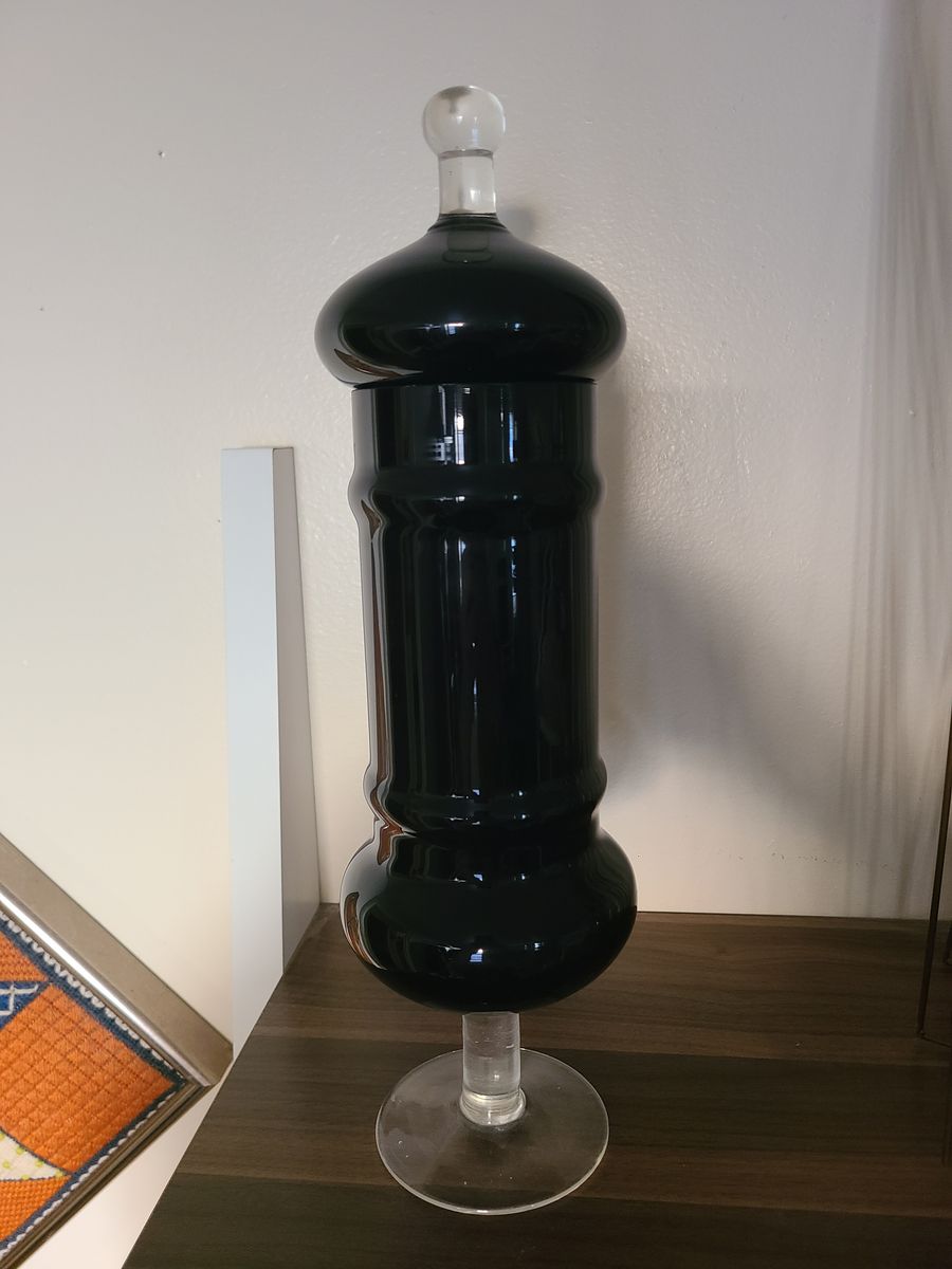 VenmoI have a black Empoli glass apothecary Jar. This is a rare piece. It stands 14 inches tall. Perfect condition. Black and clear glass with lid.