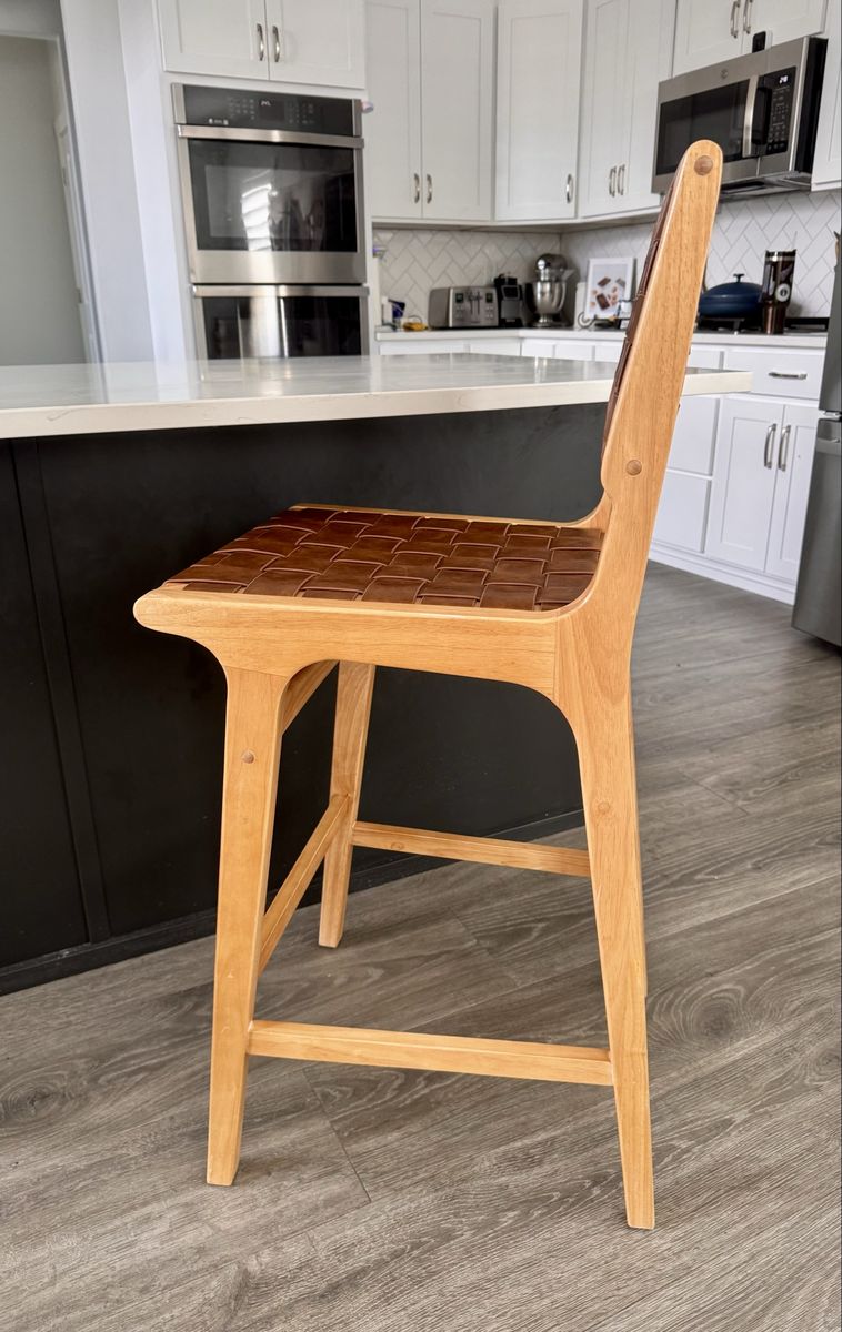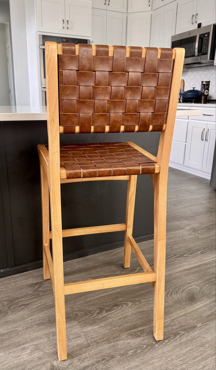 PayPalI have 3 stools available $150 each (2) 1 stool has a small hole in the top leather (hole does not go all the way through the leather) on the seat that one is $100 (1) Beautiful bar stool with warm pine wood finish and cognac faux leather details! Really comfy and stylish for your kitchen island or bar area. 43.5”H x 19”W x 29.5” seat to floor