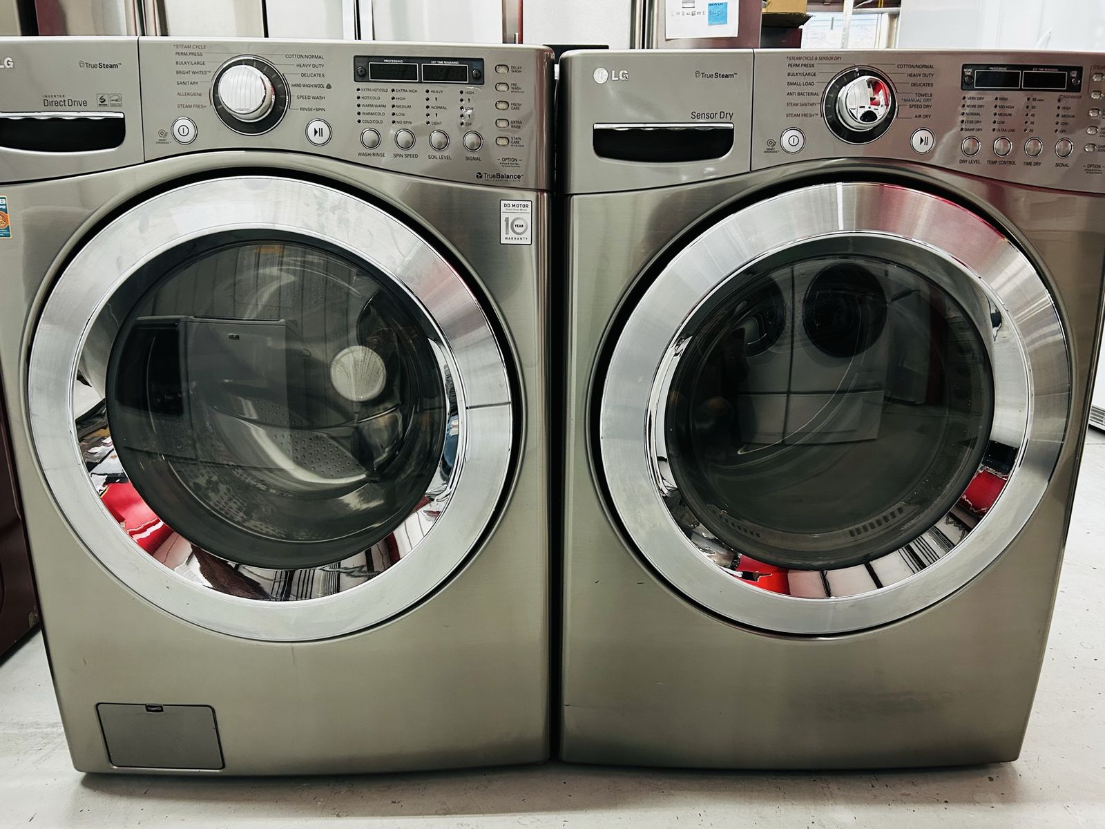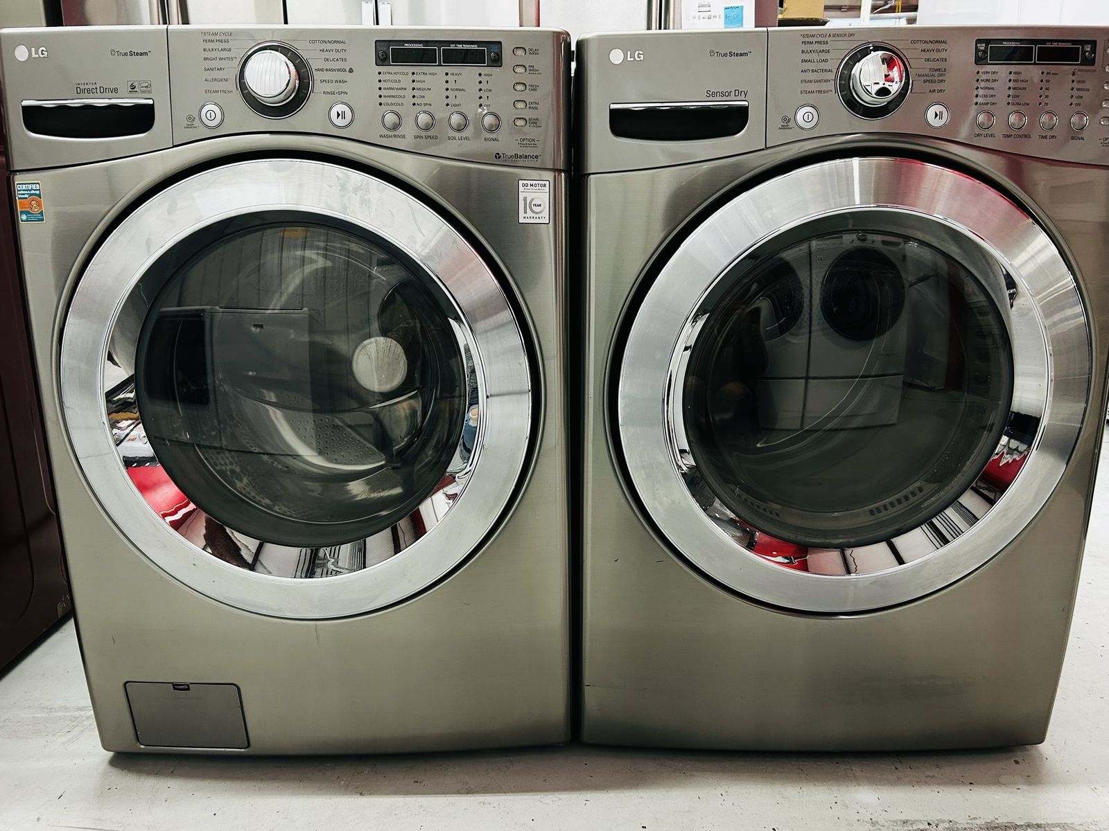Lg true steam washer inverter direct drive stainless steel drum heavy duty normal bulky large sanitary allergiene steam fresh delicate speed dry hand wash speed wash prewash rinse plus spin extra rinse stain cycle water plus etc..Lg true steam electric dryer sensor dry stainless steel drum heavy duty normal cotton steam fresh delicate speed dry air dry reduce static easy iron wrinkle care time dry etc..Can be stacked. They work great, clean, 45 day warranty, delivery/install available.