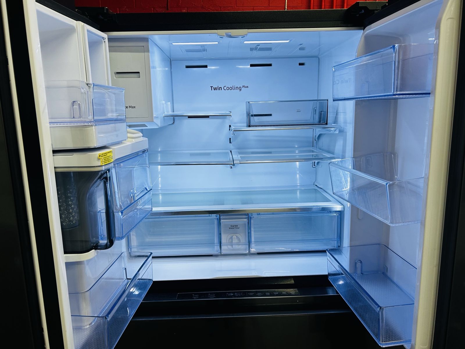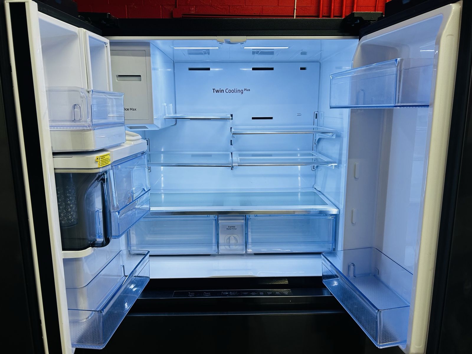 Samsung counter depth black stainless steel french 4 door refrigerator 22.6 cu ft flex zone twin cooling plus with water/ice dispenser spill proof adjustable glass shelves gallon size door bins etc..Works great, clean, 45 day warranty, delivery/install available.