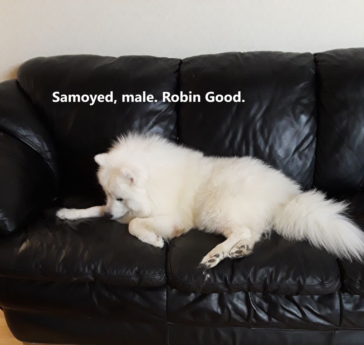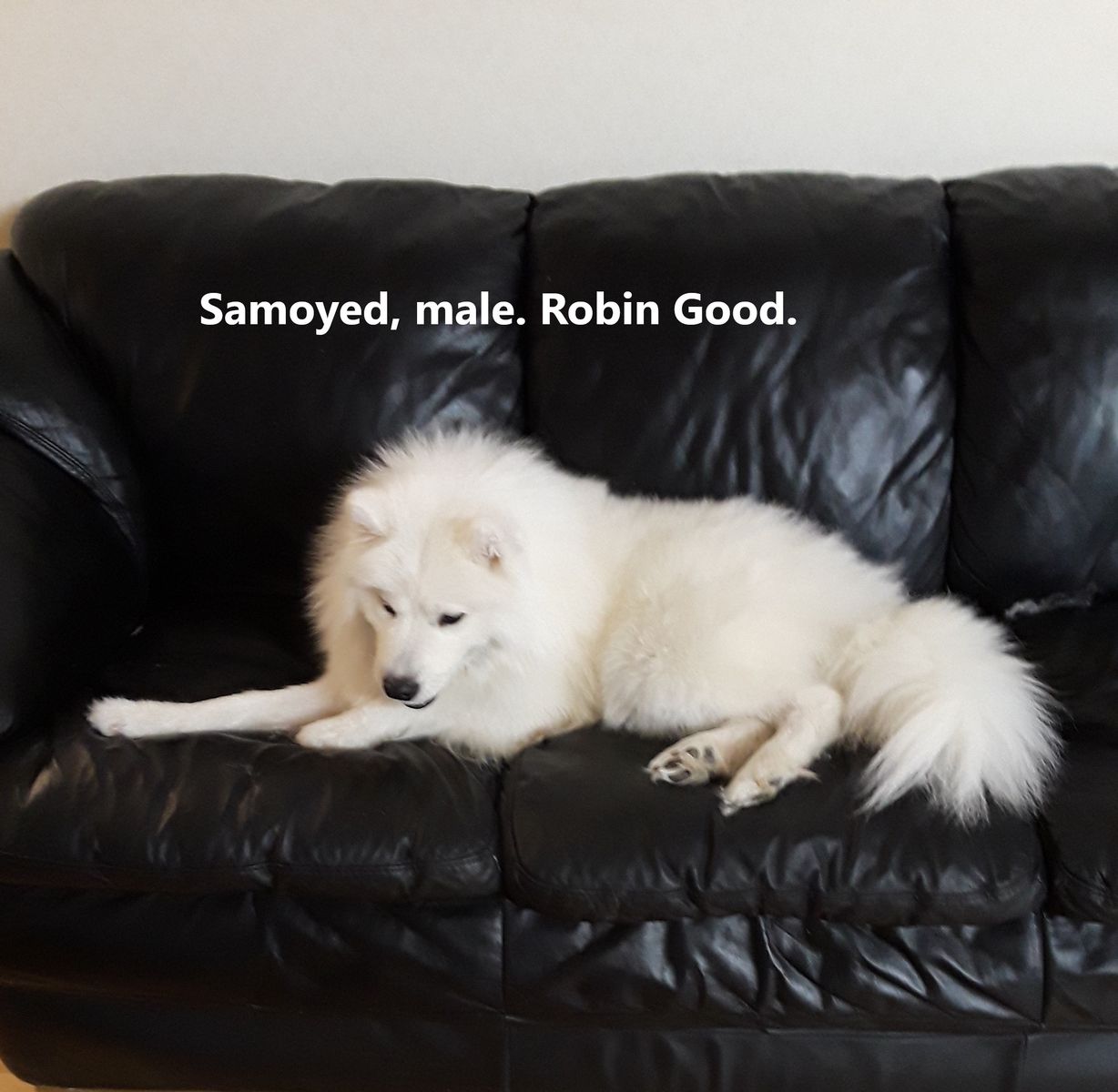 He has a huge white beautiful silky “lion's mane”, super fluffy tail, famous Samoyed’s face mask, and his muzzle is bear type. He has a calm and balanced temperament, and he loves small children.