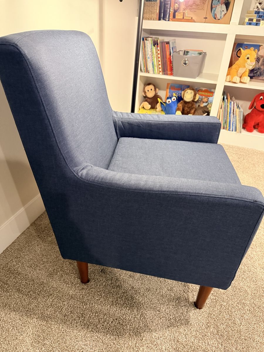 VenmoSturdy armchair has blue woven fabric upholstery and tapered wooden legs. Mid-century modern design with square arms and a fixed seat cushion. Frame is solid wood with a clean silhouette. Smoke free home.