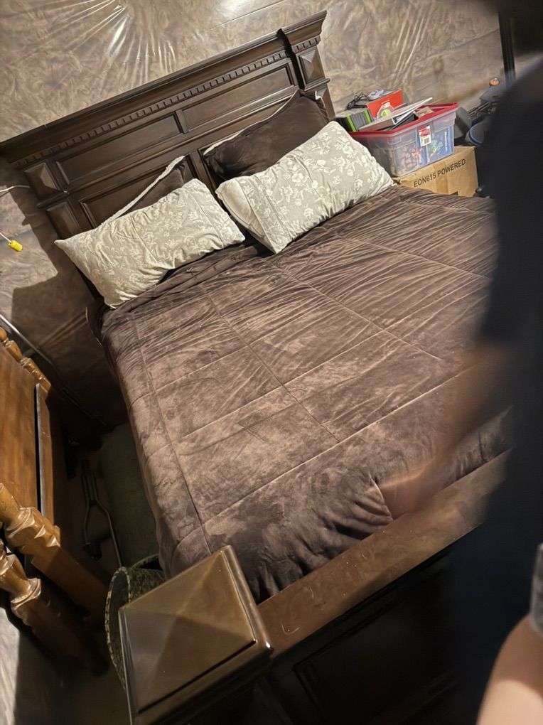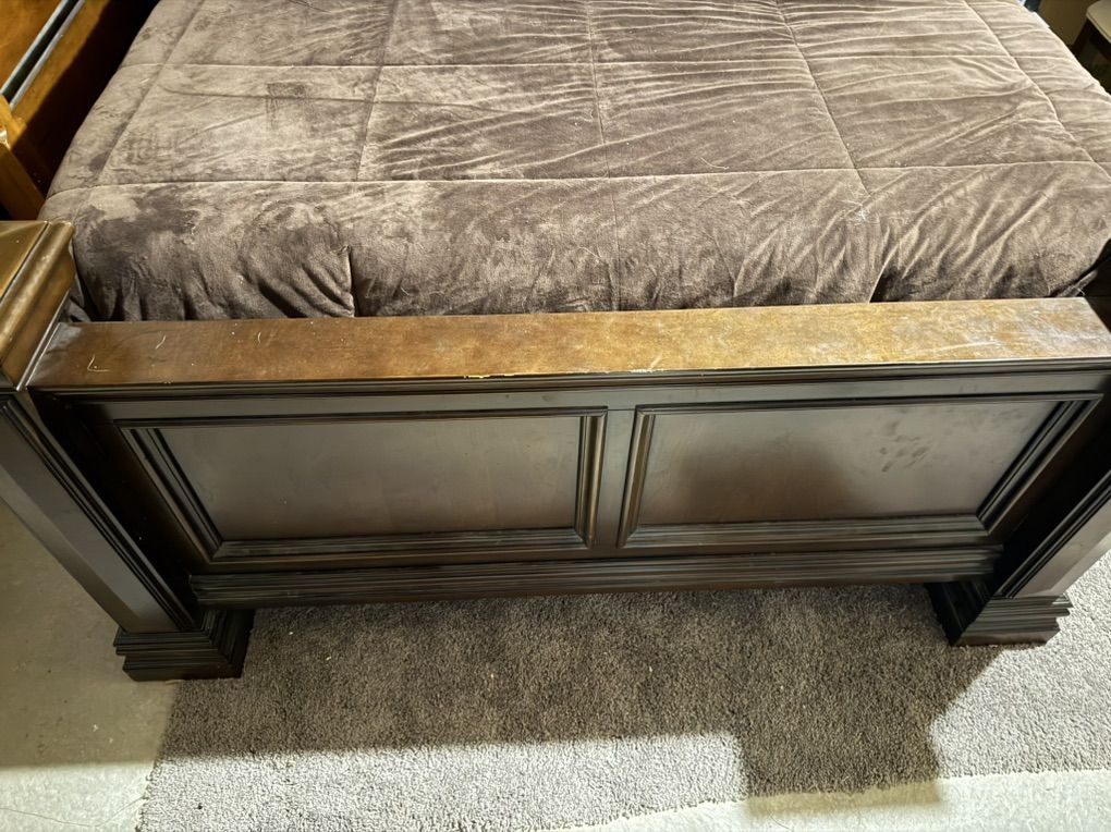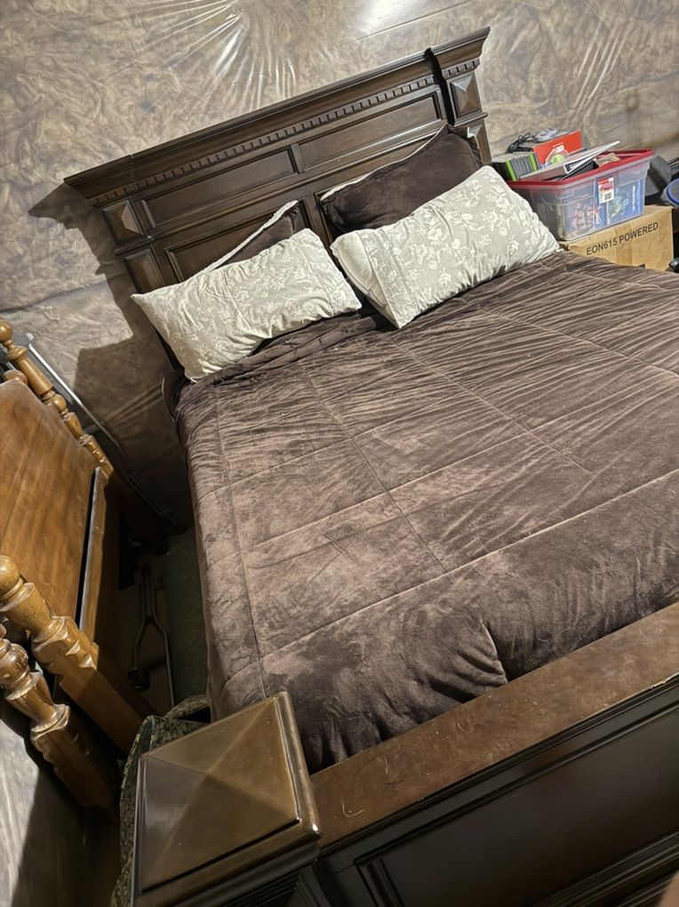 Solid wood bed frame and mattress. Bed frame is from rc willey. Super heavy duty and very nice. The head board also has charger ports installed on the sides. No issues with bed we just don’t have the room for it. The mattress is extremely comfy bambu brand. No stains, no tears, both mattress and bed frame are in great condition. Queen size and will include the sheets and pillow cases.