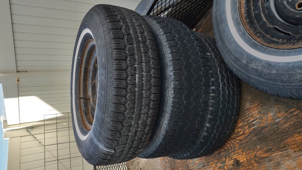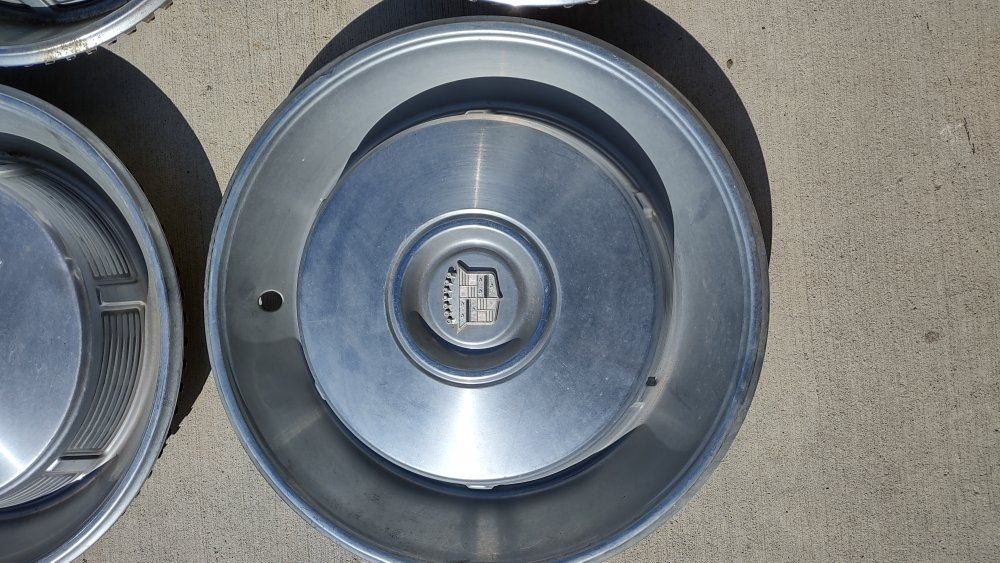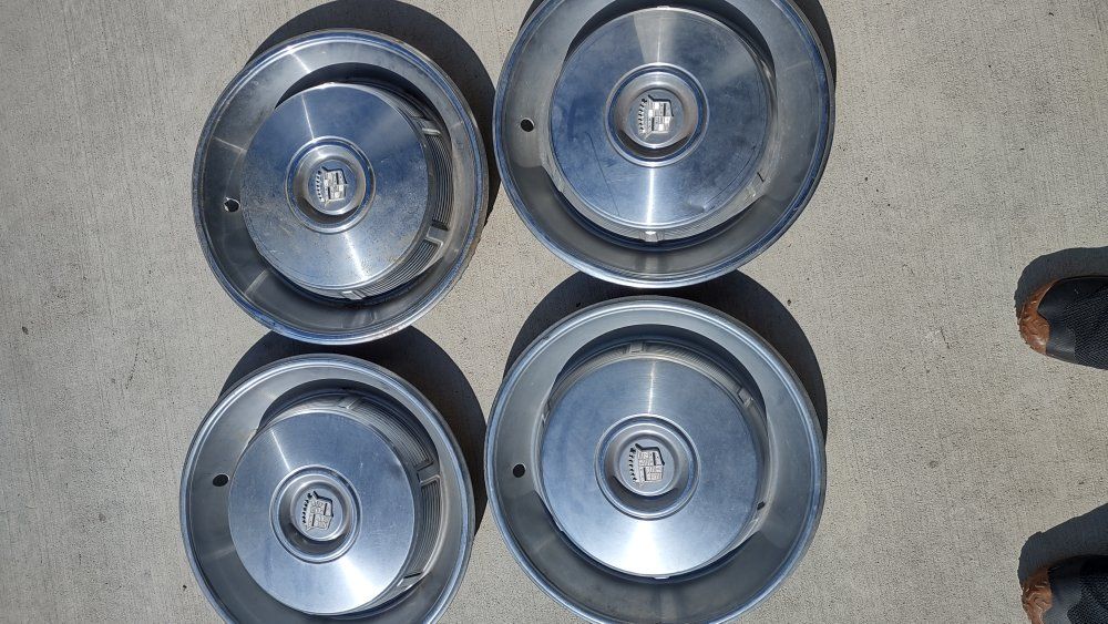 I have four caddy wheels and hubcaps. Tires are old and crusty but hold air. Wheels look nice and straight. Hubcaps lil dusty but look good. Wheels are 15"x6" 5x5 bolt pattern. Good for a rat rod, old truck or rollers. $100 for hubcaps only. $100 for wheels only. $180 for all. Need them gone.
