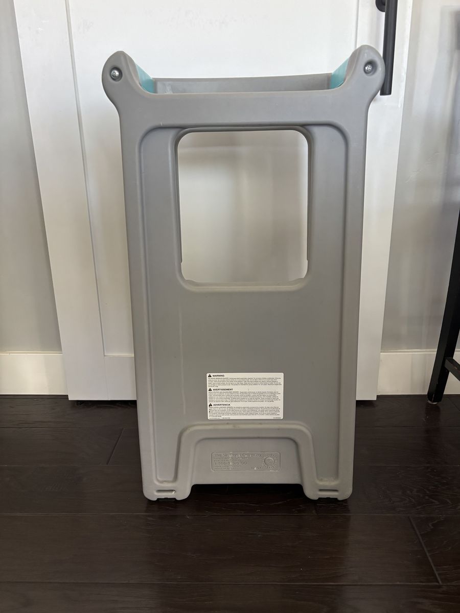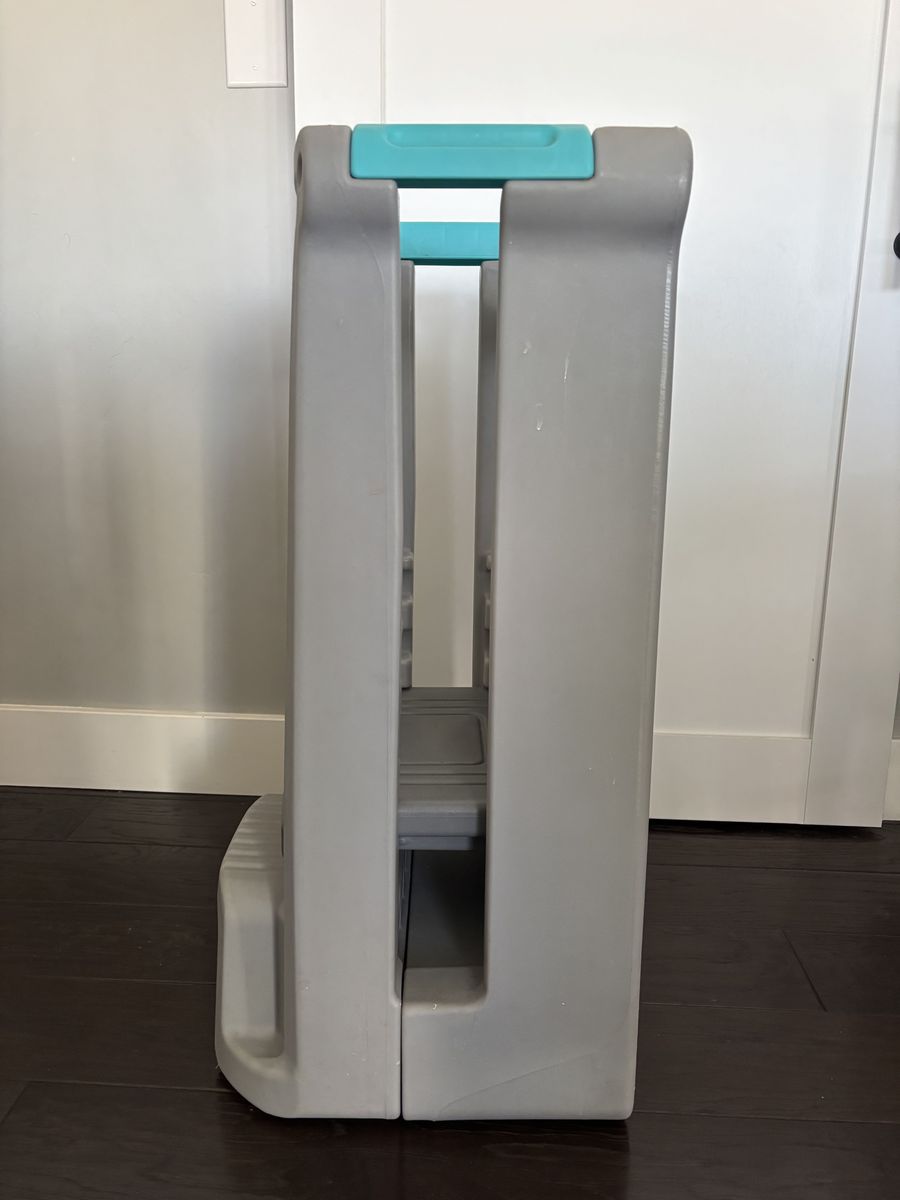 VenmoVery good condition. Durable plastic material that is easy to clean with a damp cloth. No metal parts to scratch floor. Step stool with rounded corners for toddler/child with guard rails to prevent accidental falls. Adjustable step to adjust height based on personal needs. Gives mother's little helper a way to stand up to the counter height to be involved in the cooking and mixing process. New models retail for $100.