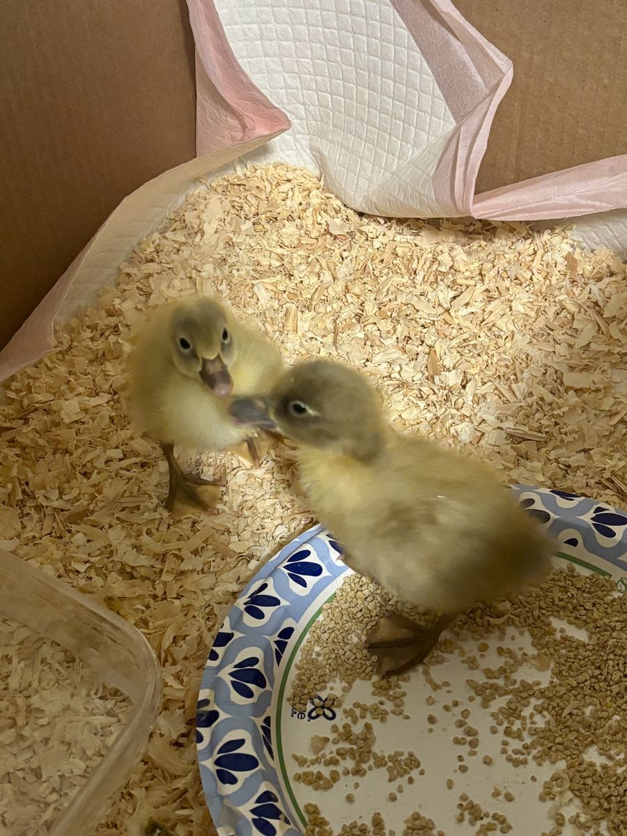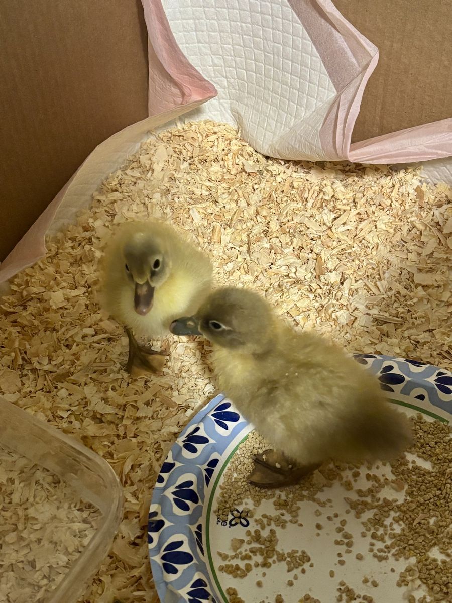 ApplePayTwo baby Cayuga ducks for sale, with a bag of food and bedding.