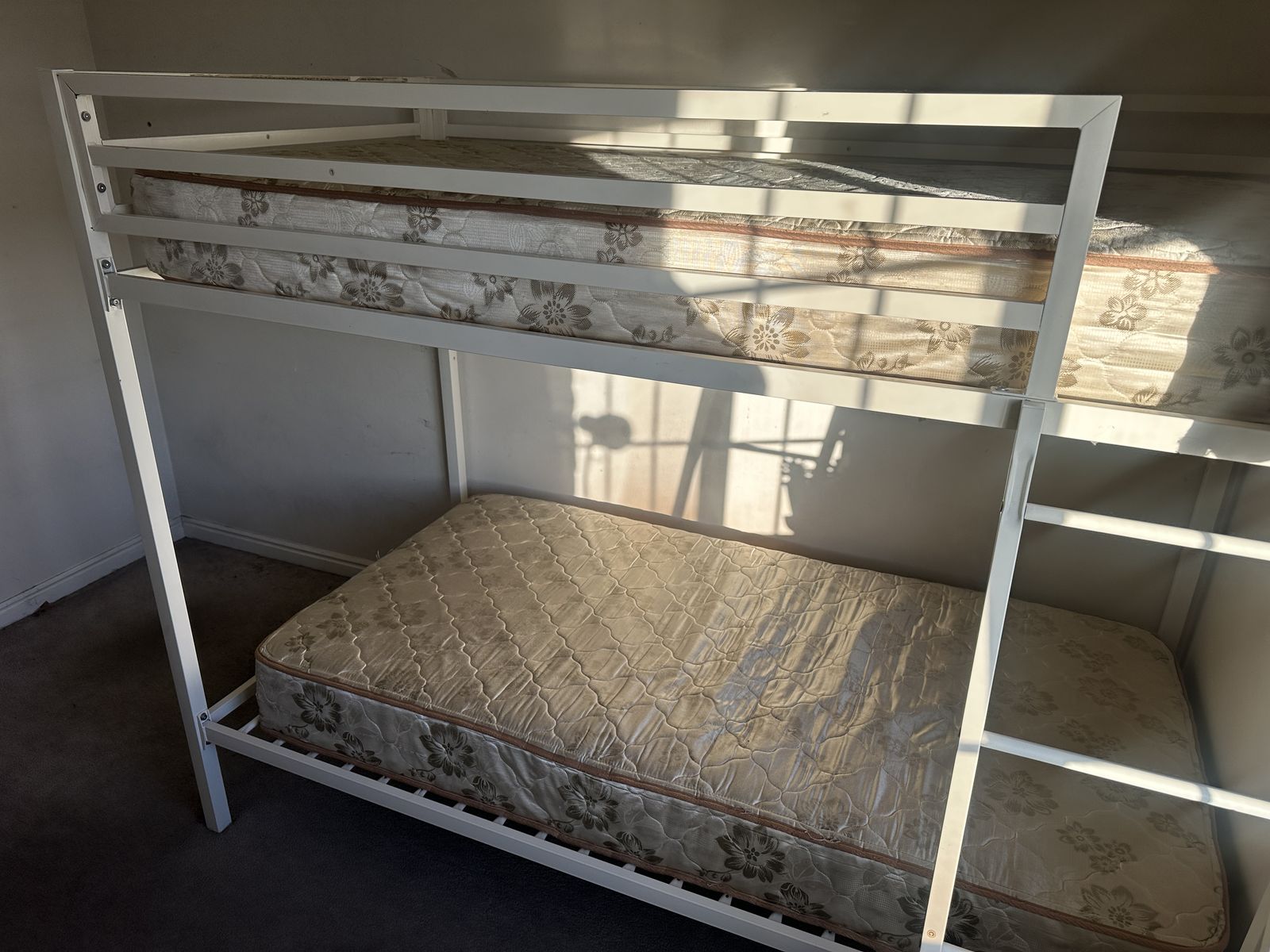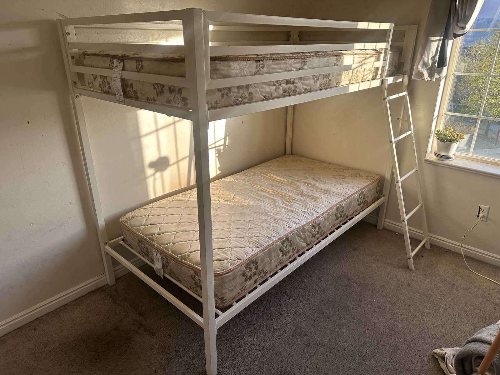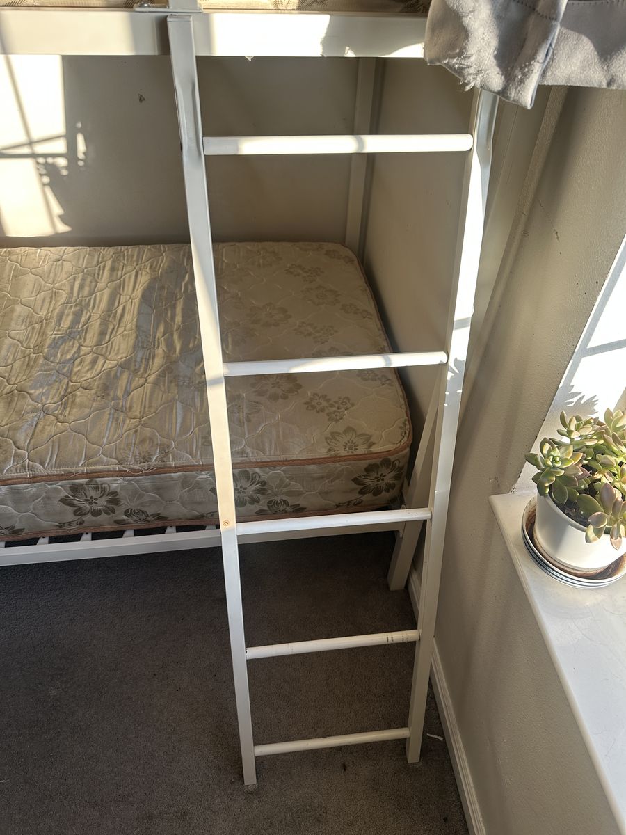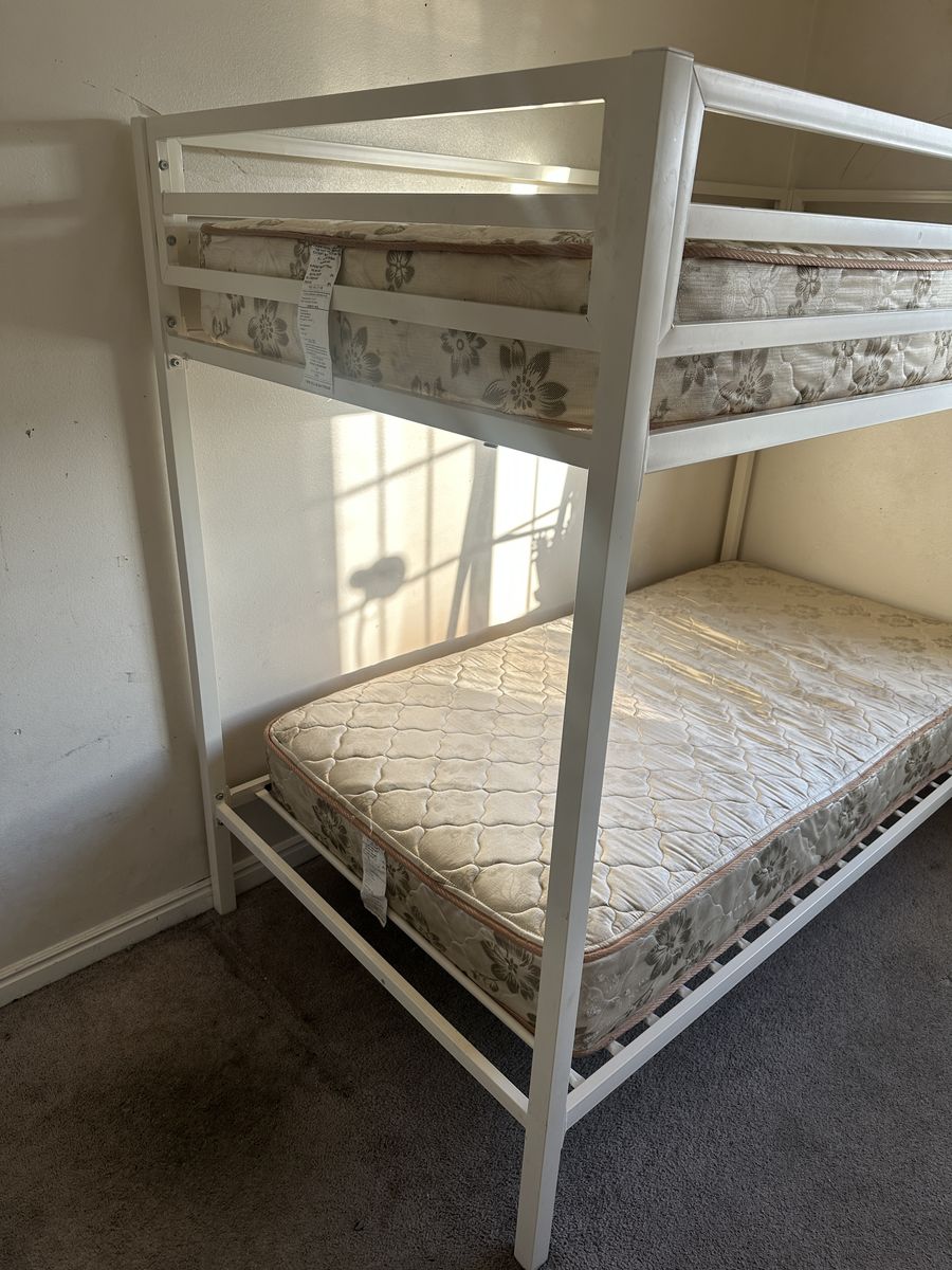 Check out this super cute twin bunkbed with mattresses. Overall, it is in good condition. There might be some imperfections from moving, a few scratches, dings in the wood, and signs of use, etc.