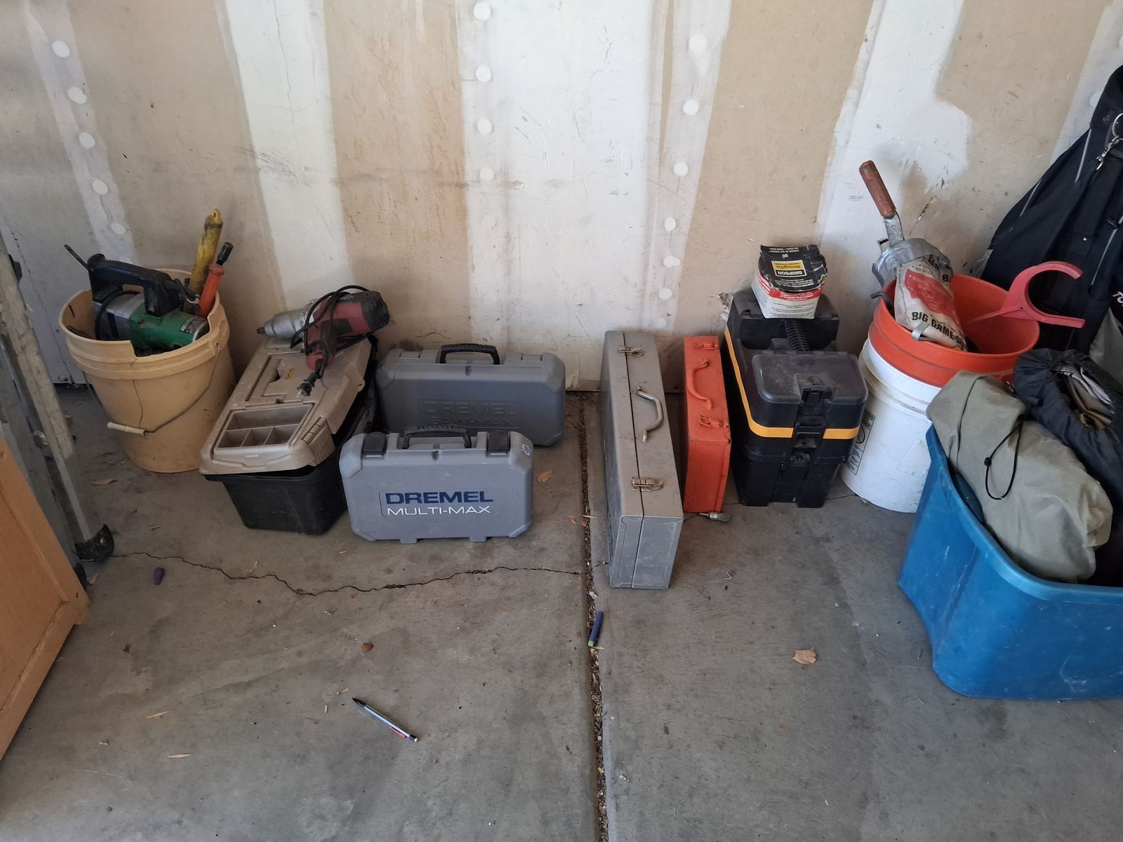 Tools impact wrench with sockets, sawmill Dremel tools .22 cal. Ramset gun etc.