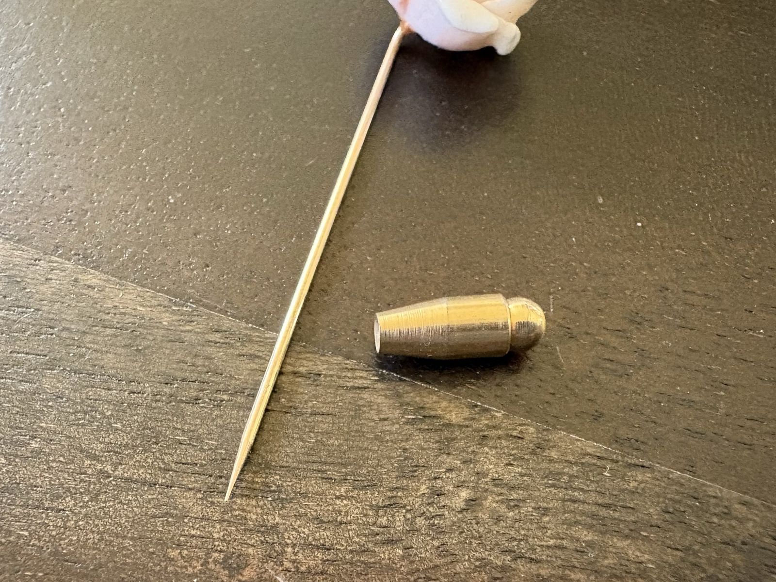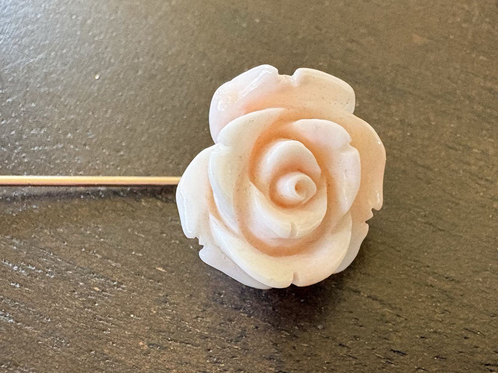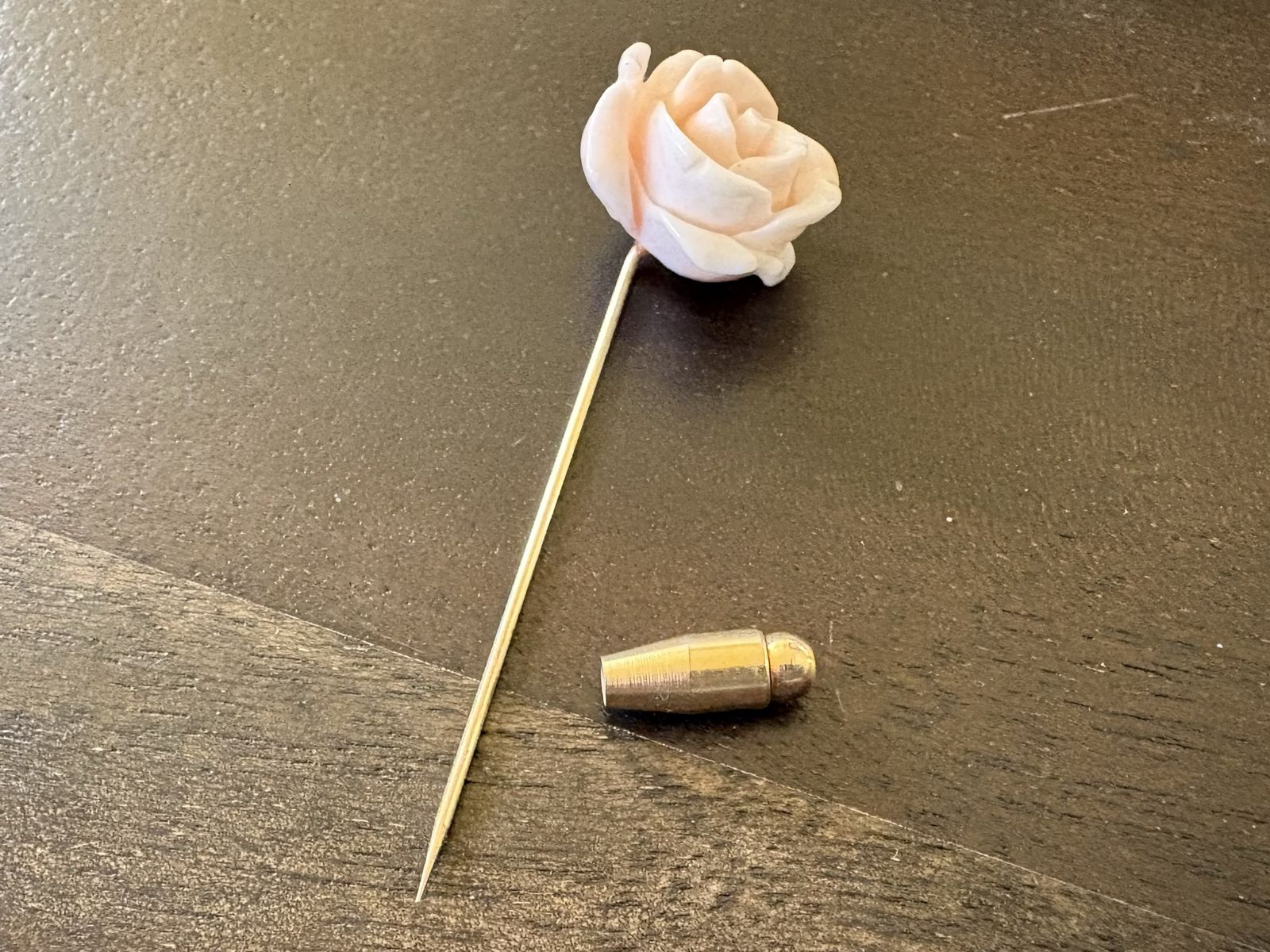 I have a beautiful vintage stick or lapel pin. It is gold tone and doesn’t stick to a magnet but I don’t see any metal content markings so I don’t know what the metal actually is. The gold stopper that you put on the end does stick to a magnet. The rose looks like porcelain. It is 2 1/4 inches long. See my other ads for jewelry, artwork, home decor and more.